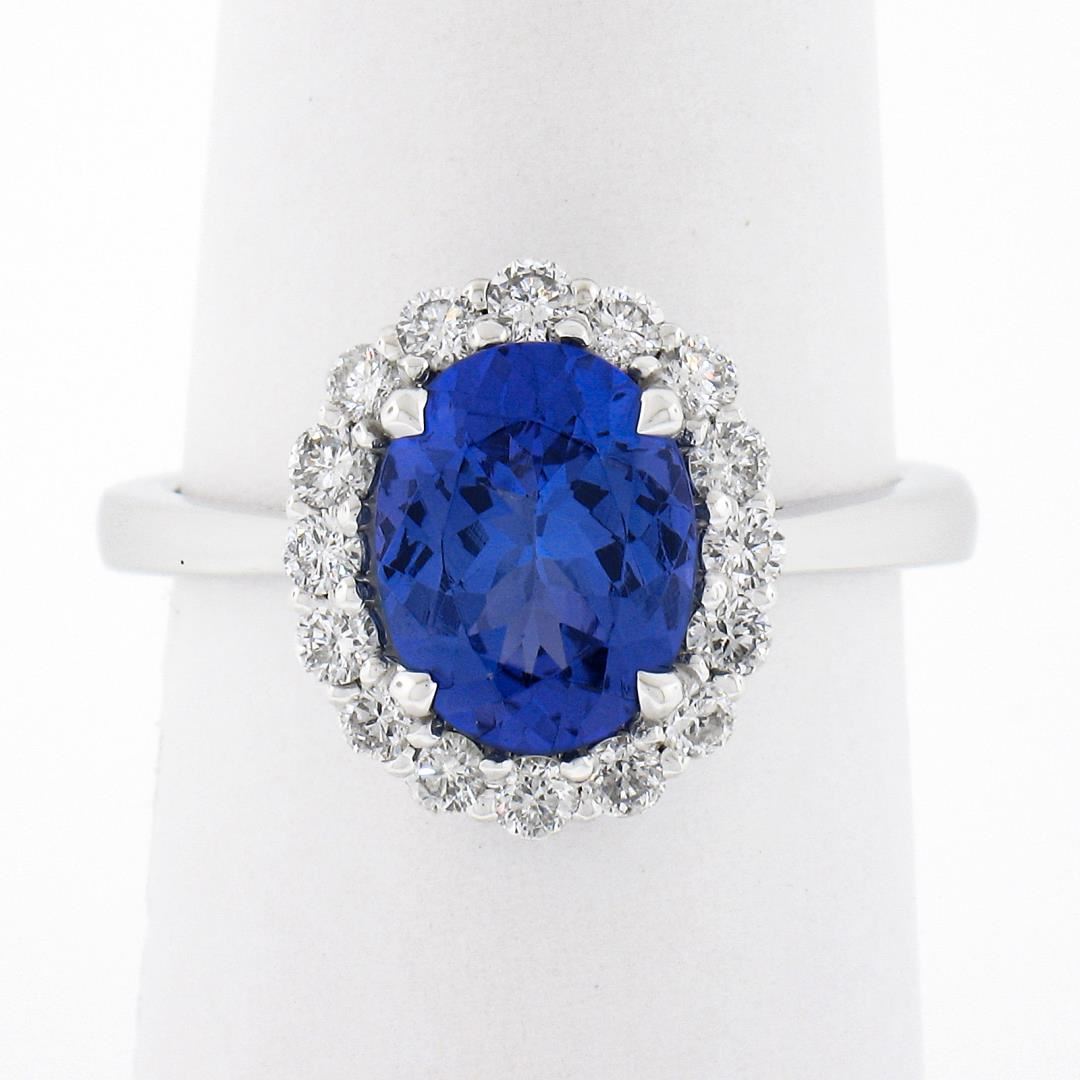 A solid 14k white gold ring, with 1 oval cut natural tanzanite (2.16ct), and a halo of 16 round brilliant cut natural diamonds (G/H - VS2/SI1 ; 0.44ctw). The ring is size 6.5, weighs a total of 4.19 grams, and measures 12.90mm wide.