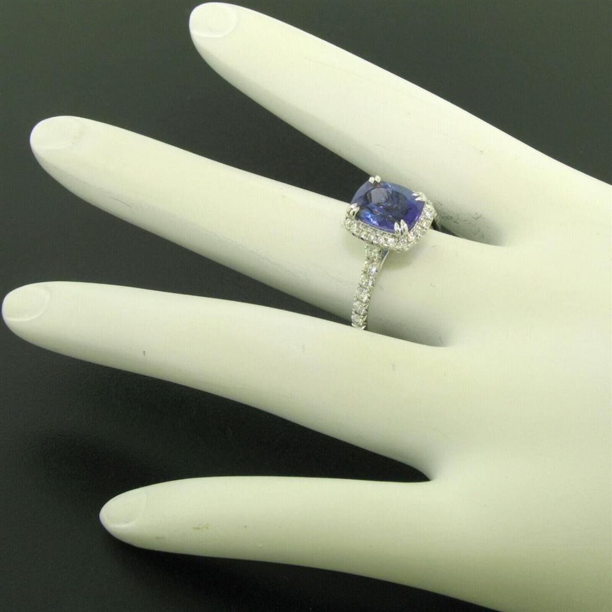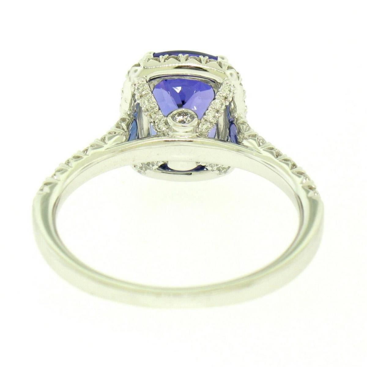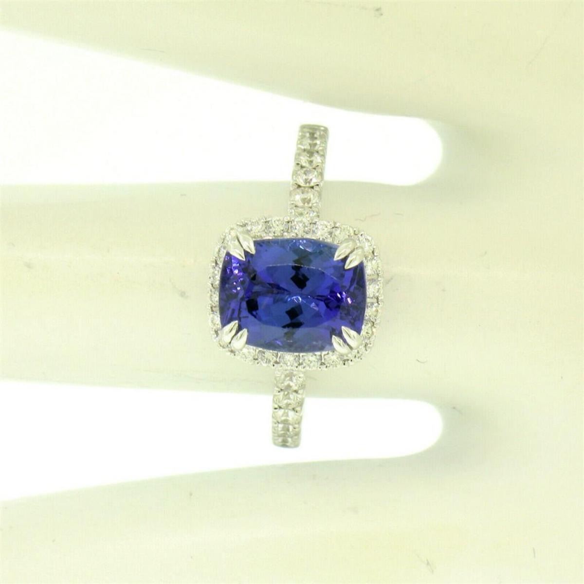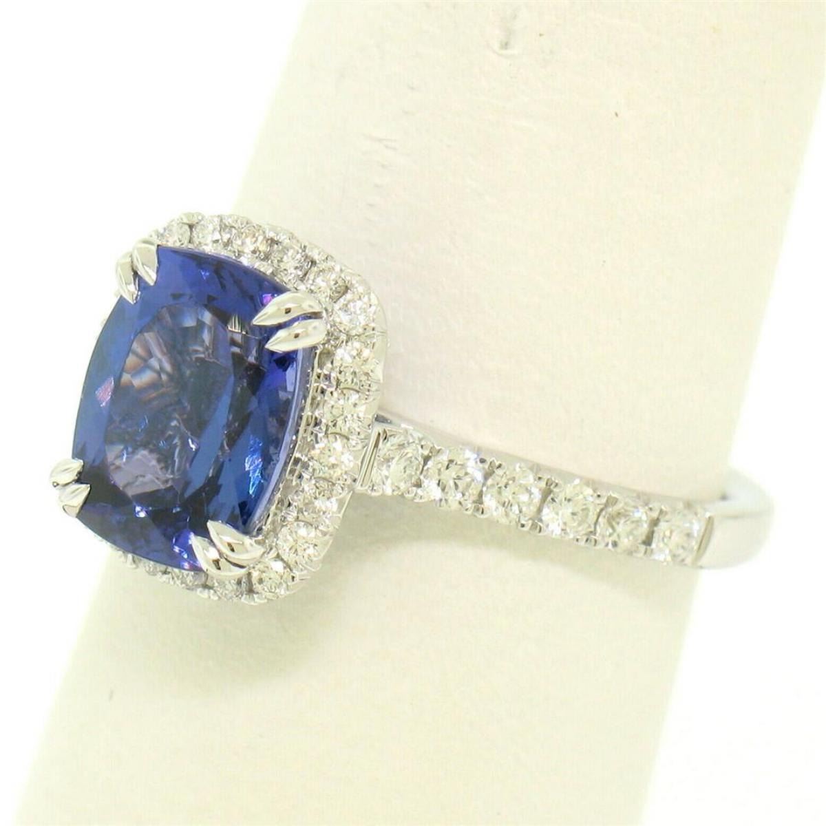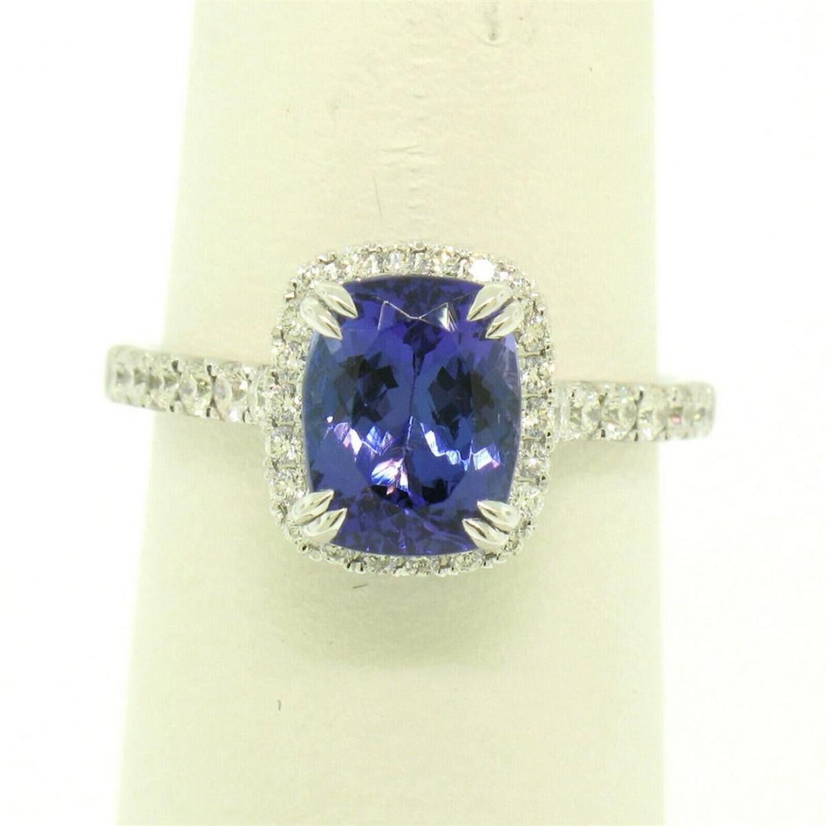 One Modern 14k White Gold 3.03ctw Cushion Cut Tanzanite & Round Diamond Halo Ring. Item Details: Material: Solid 14k White Gold, Weight: 3.4 Grams, Stone(s): (1) Natural Genuine Tanzanite - Cushion Brilliant Cut - Prong Set - Beautiful Bluish Purple Color - 8.95x6.95mm - 2.25ct (approx.), (52) Natural Genuine Diamonds - Round Brilliant Cut - Prong and Bezel Set - G Color - VS2 Clarity - 0.78ctw (approx.), Total Carat Weight: 3.03 (approx.), Ring Size: 6.5, Ring Width: 10.80mm, Condition: Like New!
