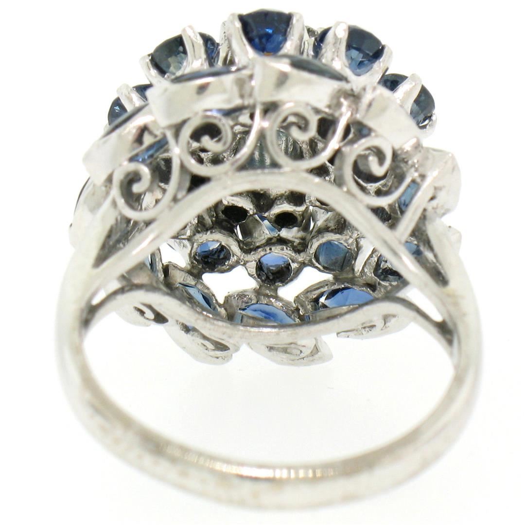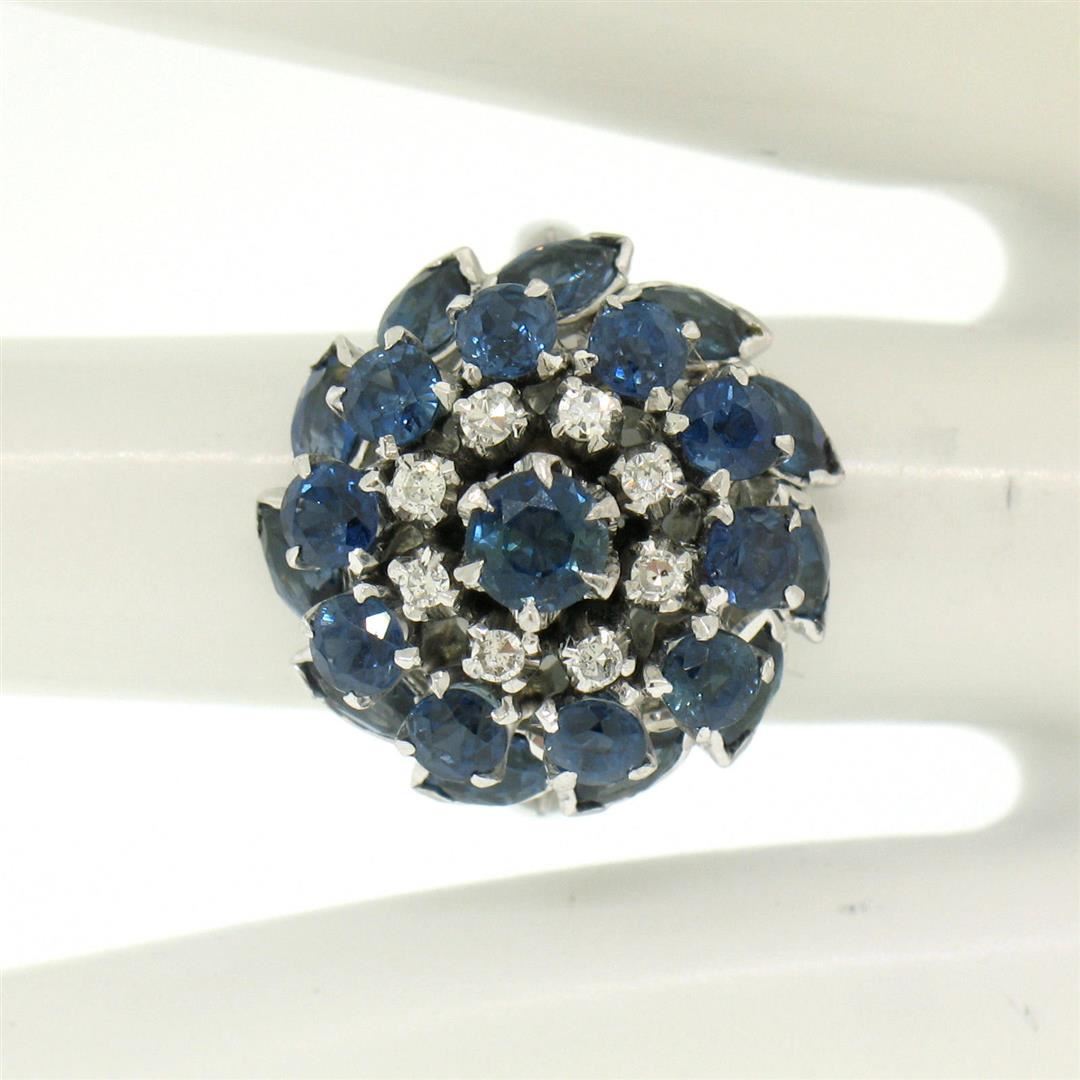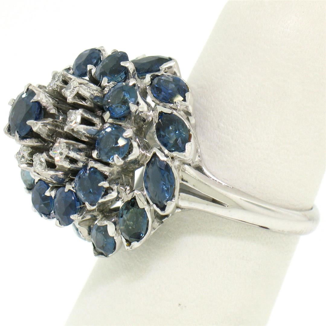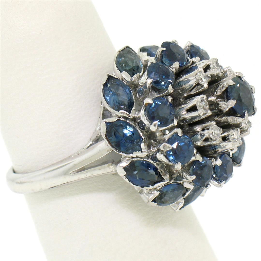 One Vintage 14k White Gold 3.56ctw Tiered Round Marquise Sapphire Old Diamond Ring. Item Details: Material: 14k Solid White Gold, Weight: 9.5 Grams, Stone(s): (11) Natural Genuine Sapphires - Round Brilliant Cut - Prong Set - Rich Royal Blue Color, (11) Natural Genuine Sapphires - Marquise Cut - Bezel Set - Rich Royal Blue Color, (8) Natural Genuine Diamonds - Round Single Cut - Prong Set - F/G Color - VS2 Clarity - 0.16ctw (approx.), Total Carat Weight: 3.56 (approx.), Ring Size: 6.0 (We can custom size this ring.), Ring Width: 19.15mm, Ring Height: 15.70mm rise off the finger