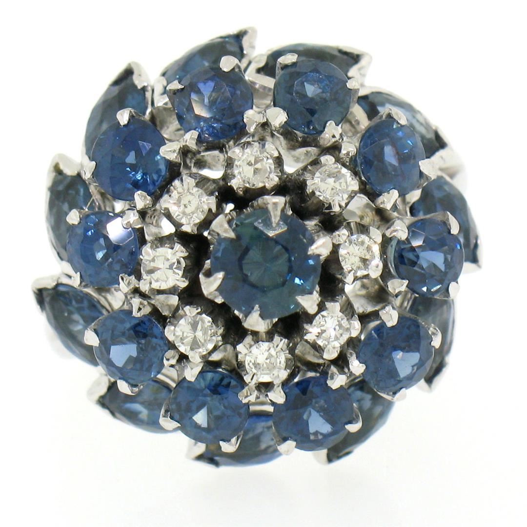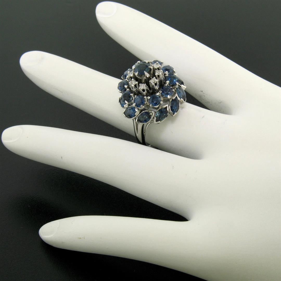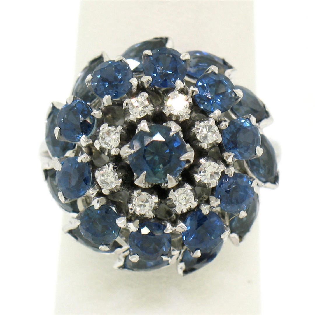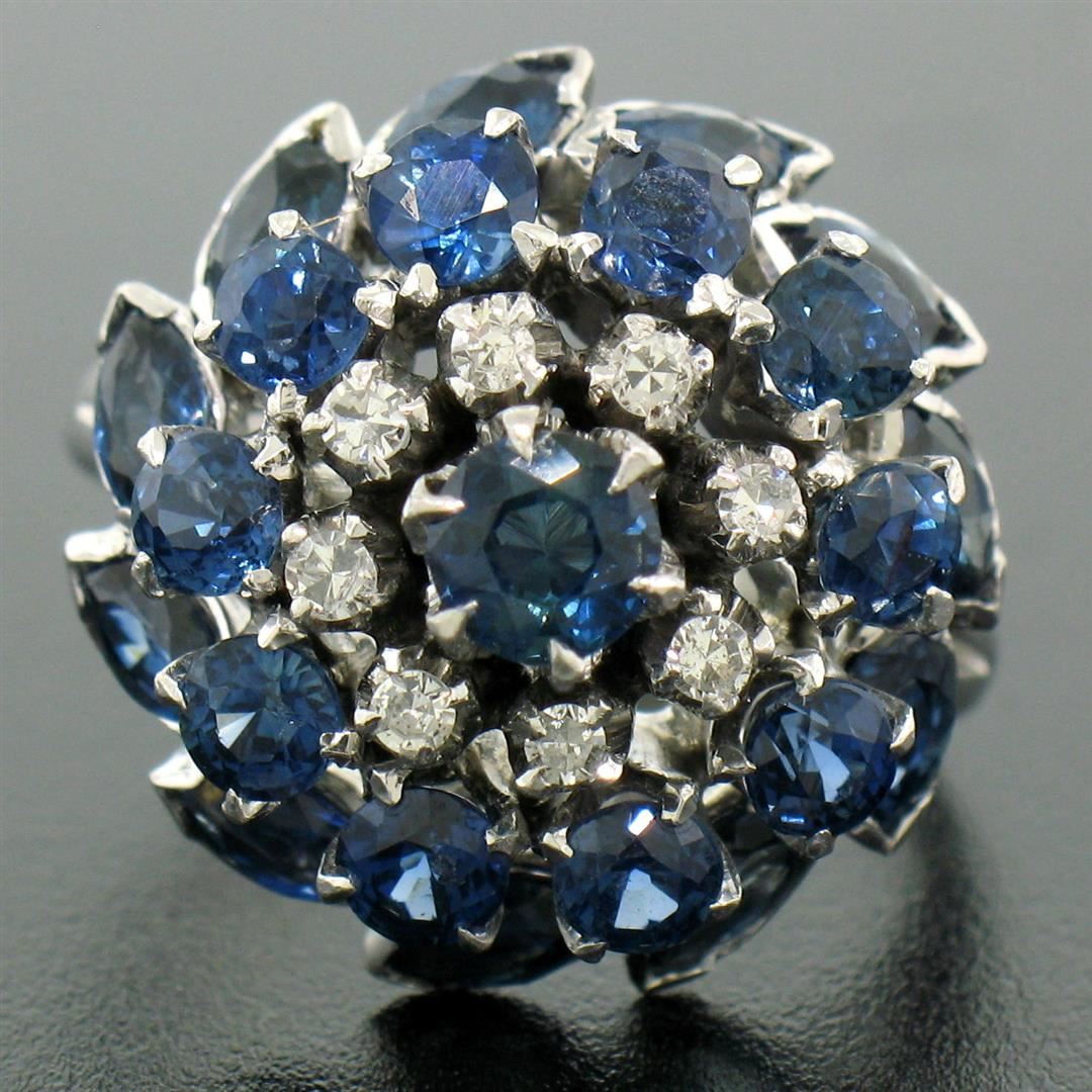 One Vintage 14k White Gold 3.56ctw Tiered Round Marquise Sapphire Old Diamond Ring. Item Details: Material: 14k Solid White Gold, Weight: 9.5 Grams, Stone(s): (11) Natural Genuine Sapphires - Round Brilliant Cut - Prong Set - Rich Royal Blue Color, (11) Natural Genuine Sapphires - Marquise Cut - Bezel Set - Rich Royal Blue Color, (8) Natural Genuine Diamonds - Round Single Cut - Prong Set - F/G Color - VS2 Clarity - 0.16ctw (approx.), Total Carat Weight: 3.56 (approx.), Ring Size: 6.0 (We can custom size this ring.), Ring Width: 19.15mm, Ring Height: 15.70mm rise off the finger
