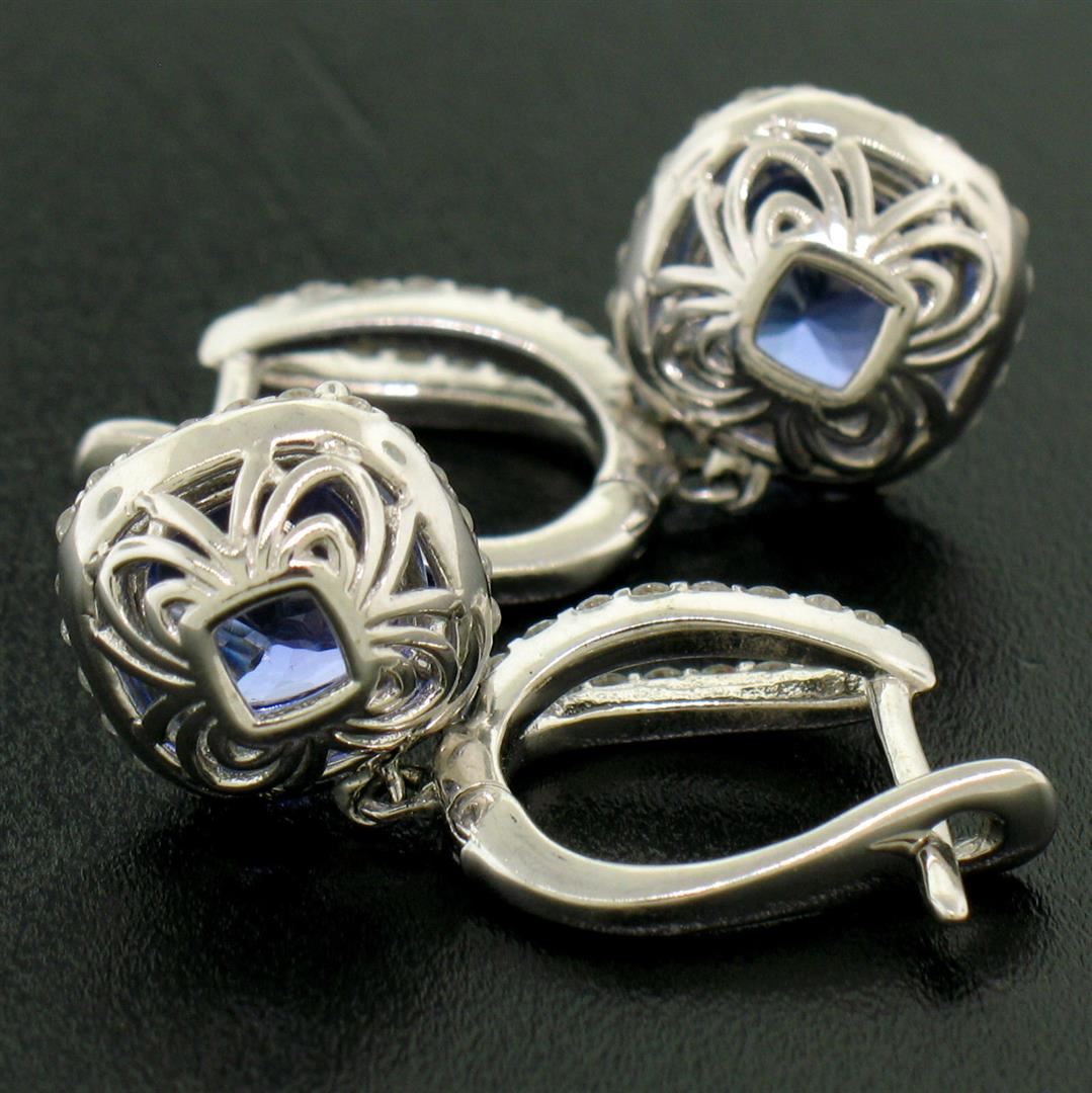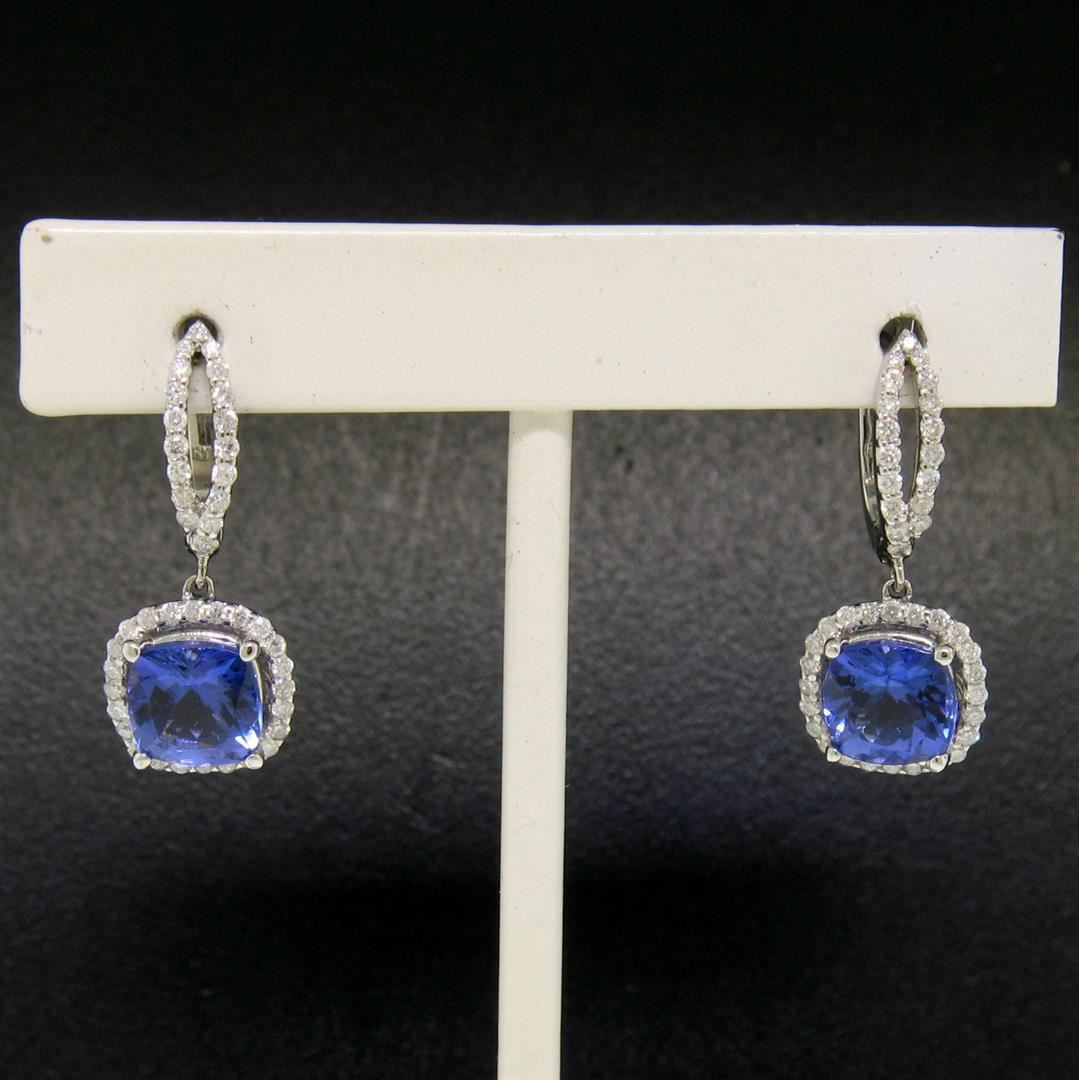 One 14k White Gold 4.15ctw Cushion Tanzanite Dangle Earrings w/ Pavé Diamond Halos. Item Details: Material: 14k Solid White Gold, Weight: 4.5 Grams, Stone(s): (2) Natural Genuine Tanzanite - Cushion Cut - Prong Set - Rich and Vibrant Violet Blue Color - 3.60ctw (approx.), (84) Natural Genuine Diamonds - Round Brilliant Cut - Prong Set - SI1 Clarity - H Color - 0.55ctw (approx.), Total Carat Weight: 4.15 (approx.), Backing: Snap Closure (Pierced ears required.), Width: 9.86mm, Height: 23.61mm, Thickness: 6.68mm, Dangle Length: 10.72mm, Condition: Like New!