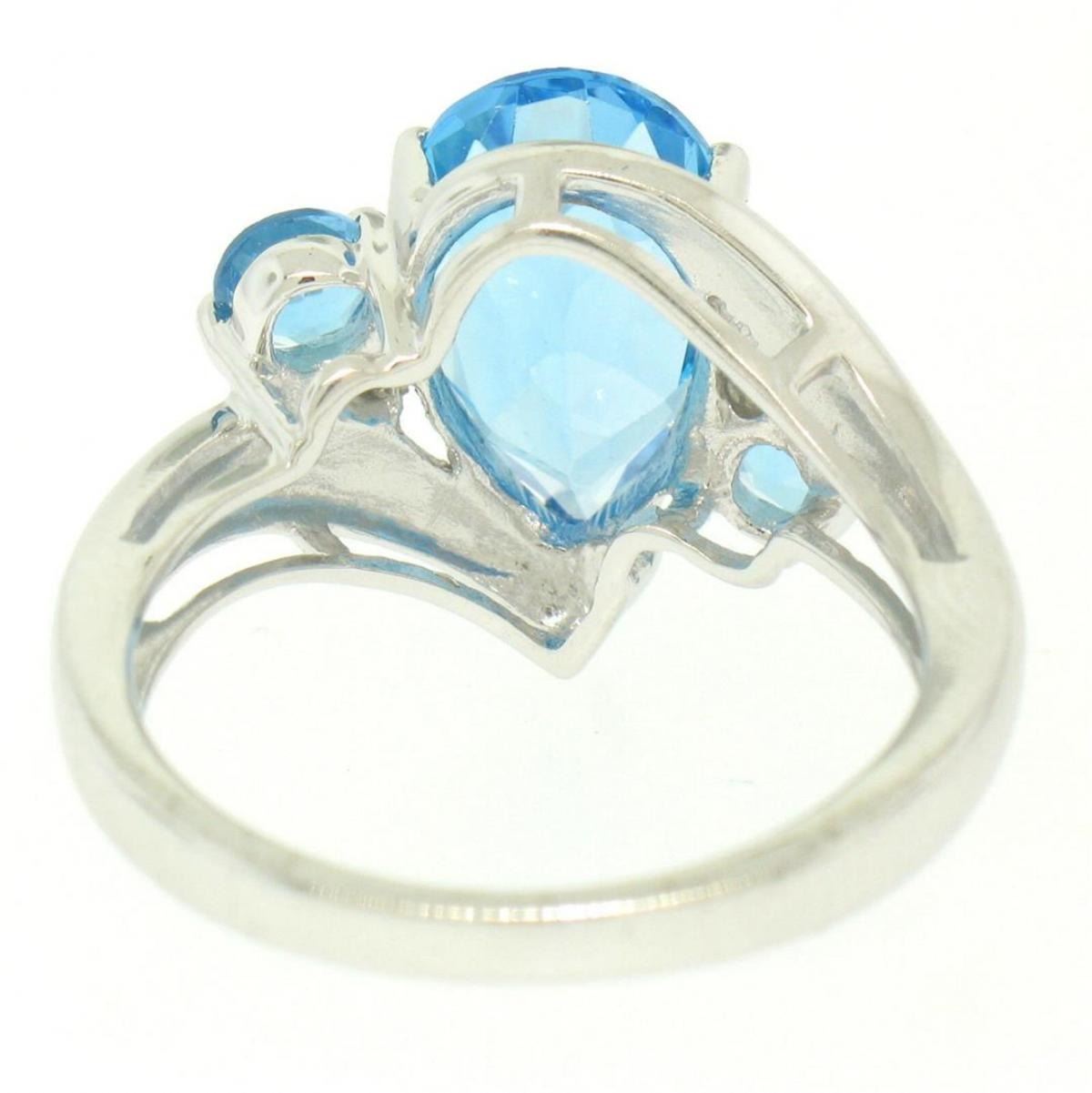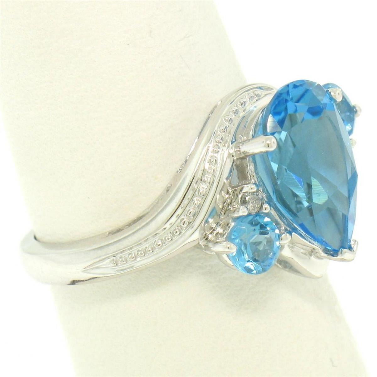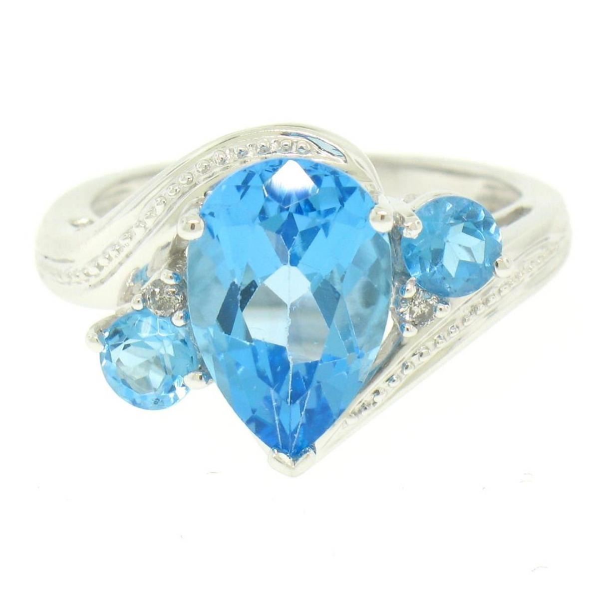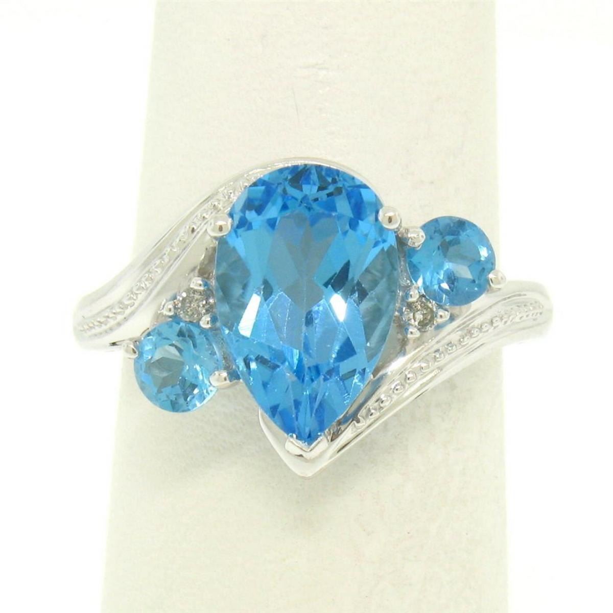 One 14k White Gold 4.33ctw Pear & Round Swiss Blue Topaz Ring w/ 2 Diamond Accents. Item Details: Material: 14k Solid White Gold, Weight: 5.0 Grams, Stone(s): (1) Natural Genuine Topaz - Pear Cut - Prong Set - Rich and Bright Swiss Blue Color - 11.87x7.88mm / 3.70ct (approx.), (2) Natural Genuine Topaz - Round Cut - Prong Set - Rich and Bright Swiss Blue Color - 4.0mm / 0.60ctw (approx.), (2) Natural Genuine Diamonds - Round Brilliant Cut - Prong Set - H Color - SI2 Clarity - 1.5mm / 0.03ctw (approx.), Total Carat Weight: 4.33 (approx.), Ring Size: 7 (We can custom size this ring.), Ring Width: 14.01mm, Ring Height: 7.70mm rise off the finger, Condition: Excellent condition!