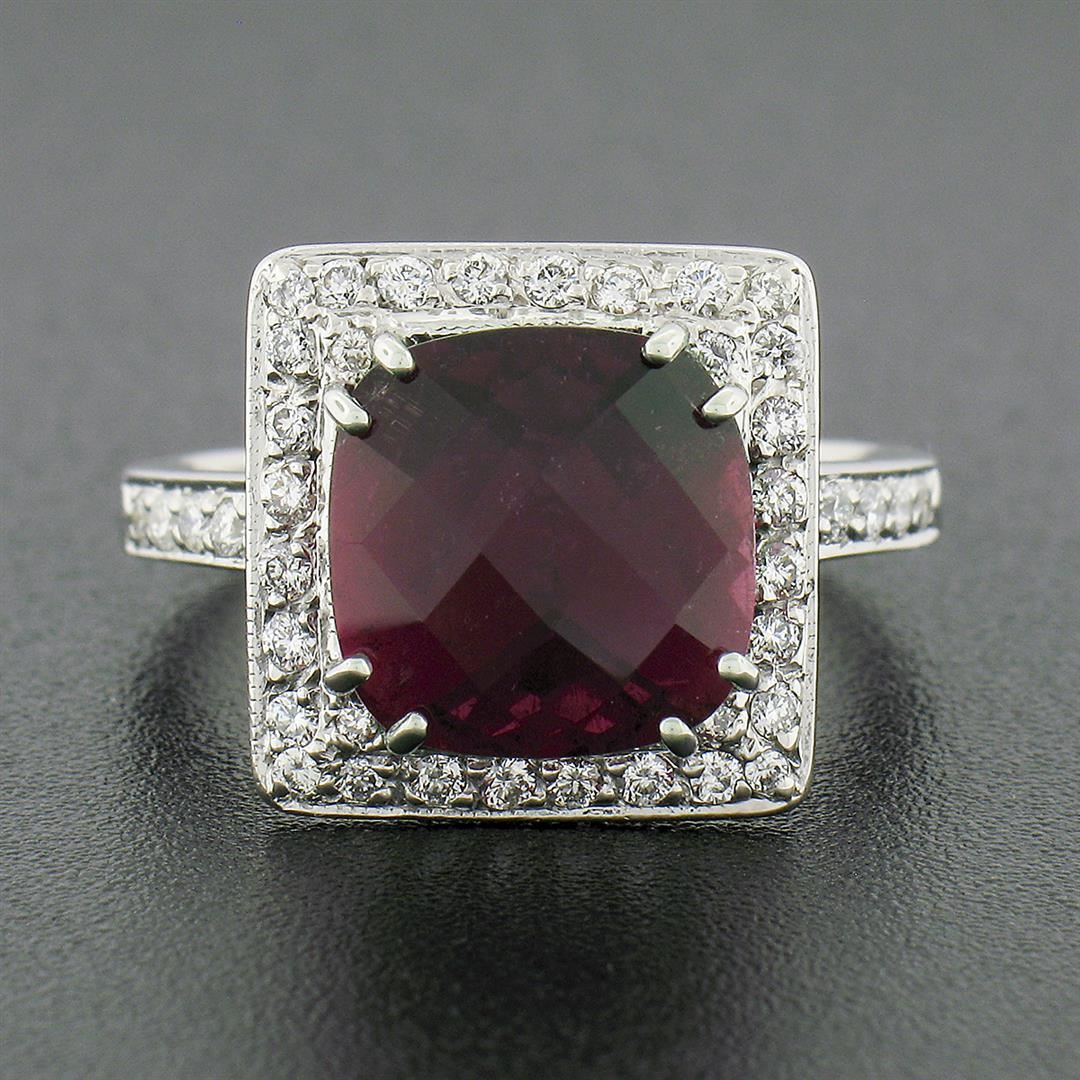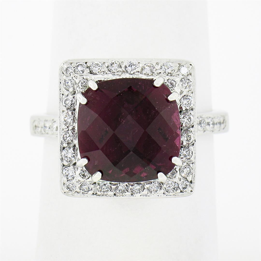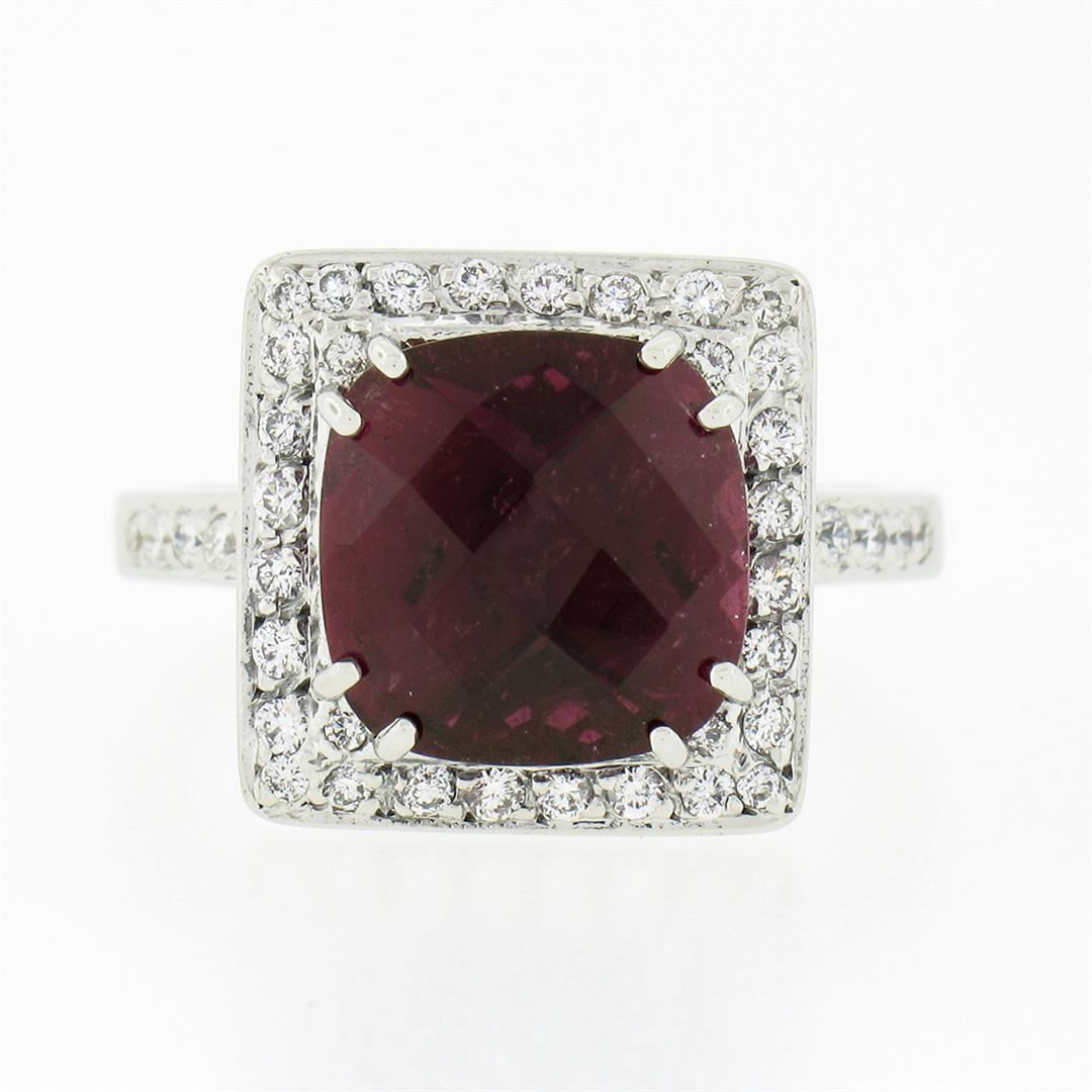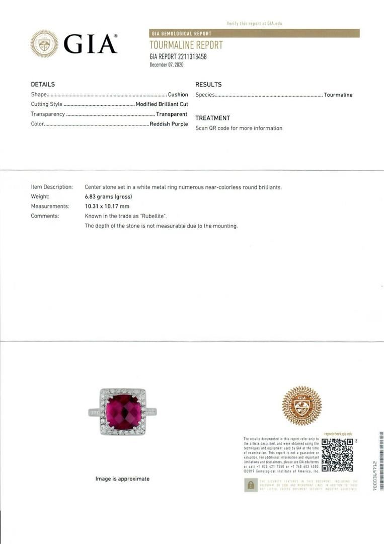 A solid 14k white gold ring, with 1 Gia certified cushion checkerboard cut natural tourmaline (5.0ct), and 42 round brilliant cut natural diamonds (G/H - VS1/VS2 ; 0.60ctw). The ring is size 7.5, weighs a total of 6.83 grams, and measures 14.0mm wide. Comes with all original relevant certifications.