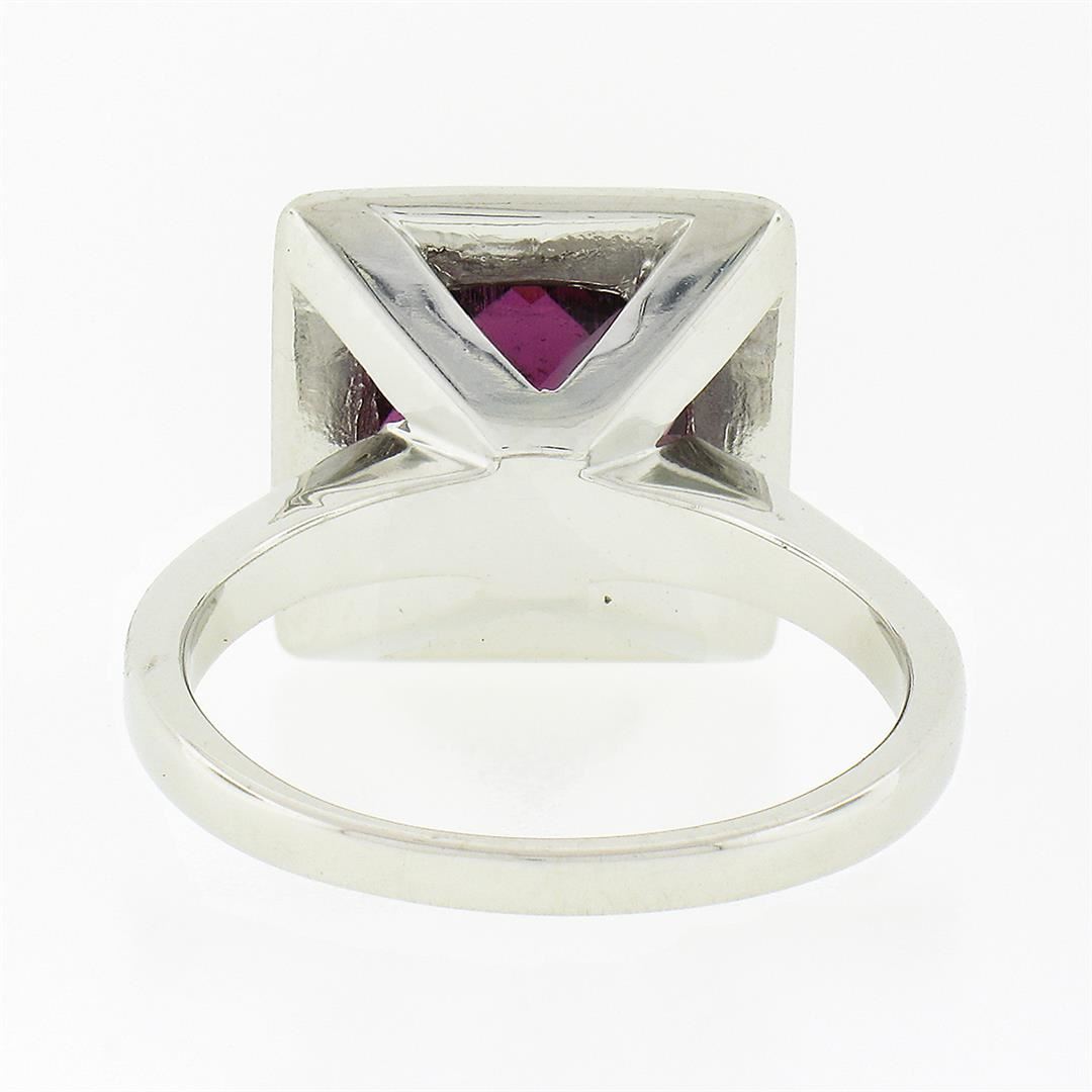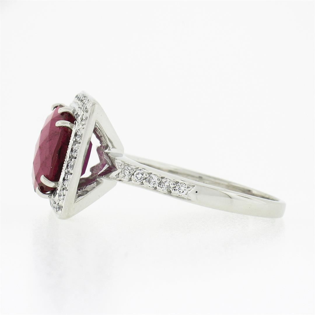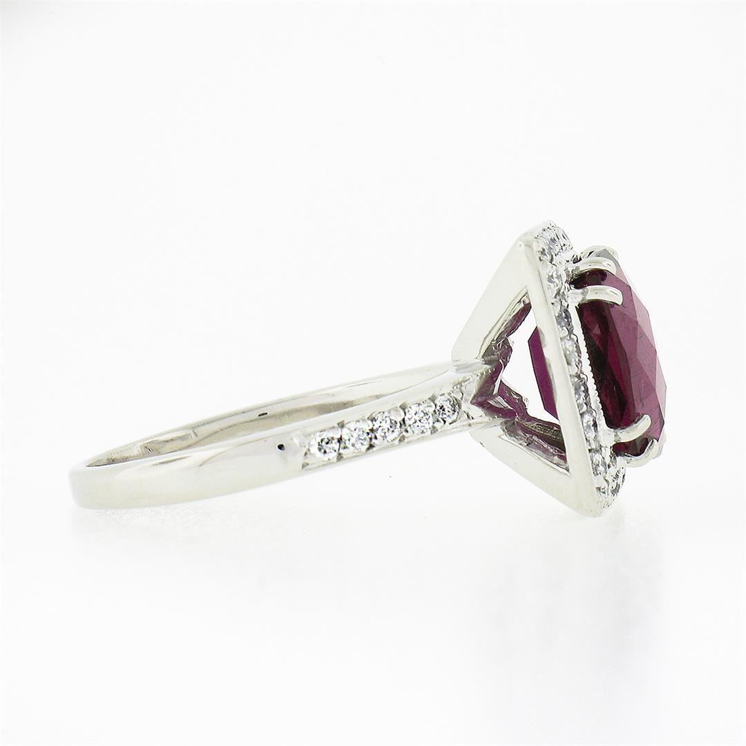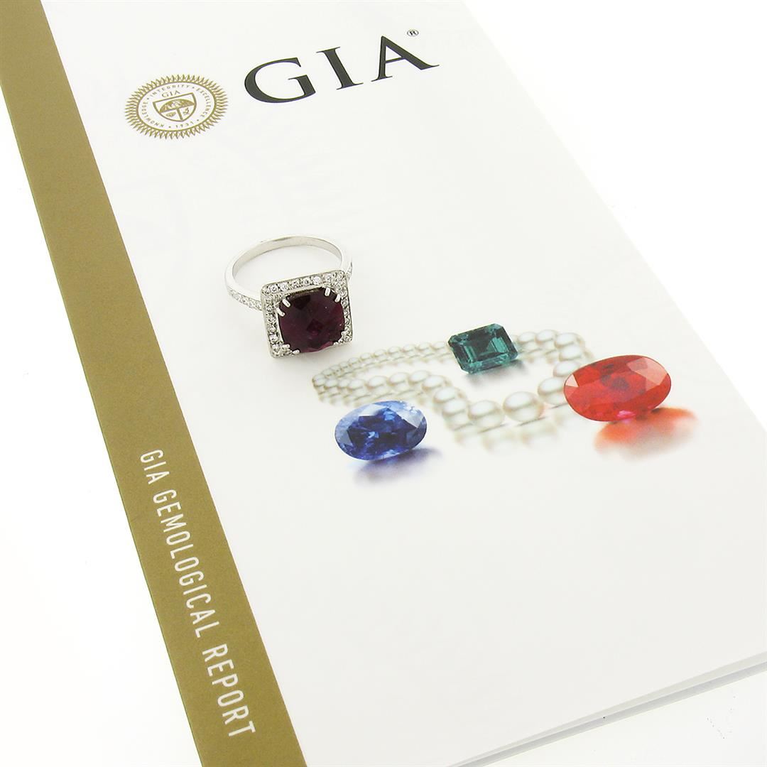 A solid 14k white gold ring, with 1 Gia certified cushion checkerboard cut natural tourmaline (5.0ct), and 42 round brilliant cut natural diamonds (G/H - VS1/VS2 ; 0.60ctw). The ring is size 7.5, weighs a total of 6.83 grams, and measures 14.0mm wide. Comes with all original relevant certifications.
