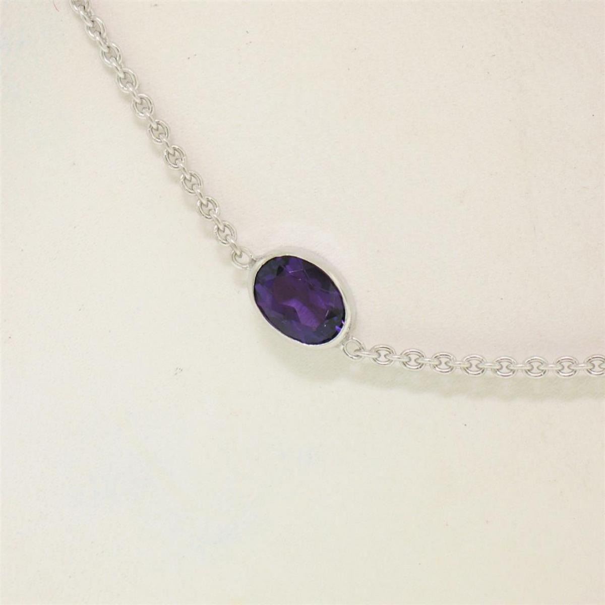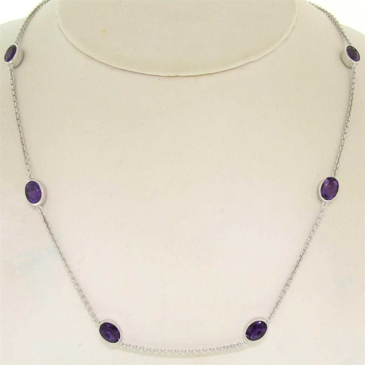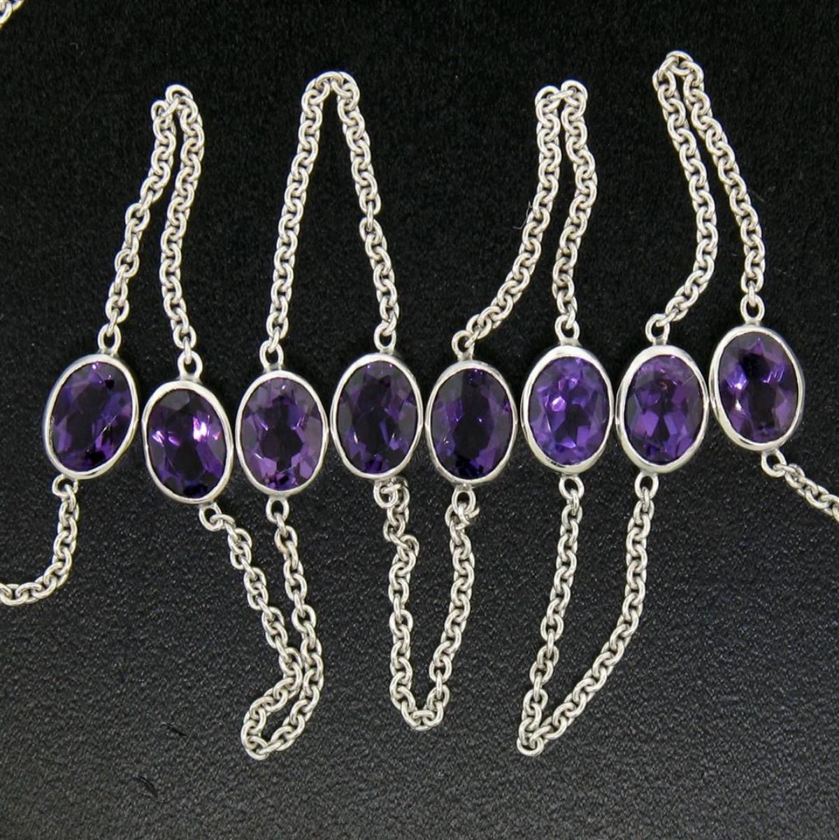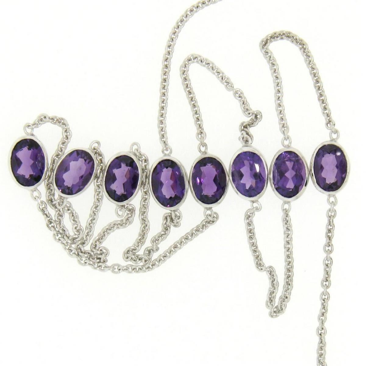 One 14k White Gold 8.00ctw 8 Station "Amethyst by the Yard" 20" Cable Link Chain Necklace. Item Details: Material: 14k Solid White Gold, Weight: 8.6 Grams, Stone(s): (8) Natural Genuine Amethysts - Oval Cut - Bezel Set - Rich Royal Purple Color, Total Carat Weight: 8.00 (approx.), Chain Type: Fine Cable Link, Chain Length: 20 Inches, Clasp: Lobster Claw, Width: 5.91mm, Thickness: 3.30mm, Condition: New w/o Tag