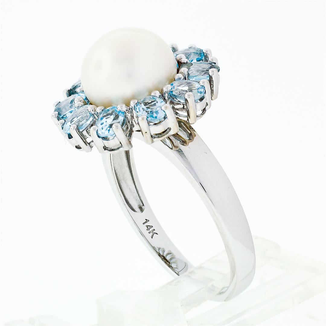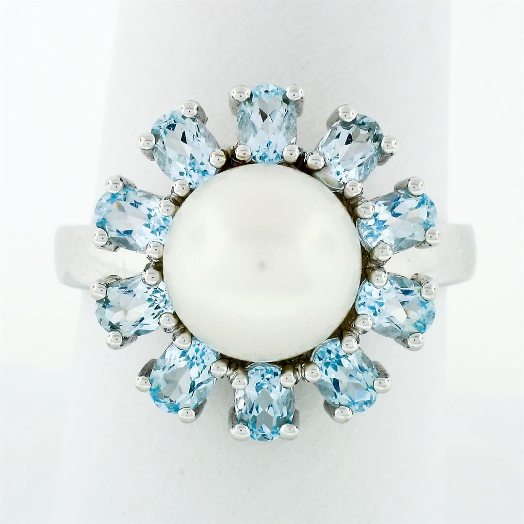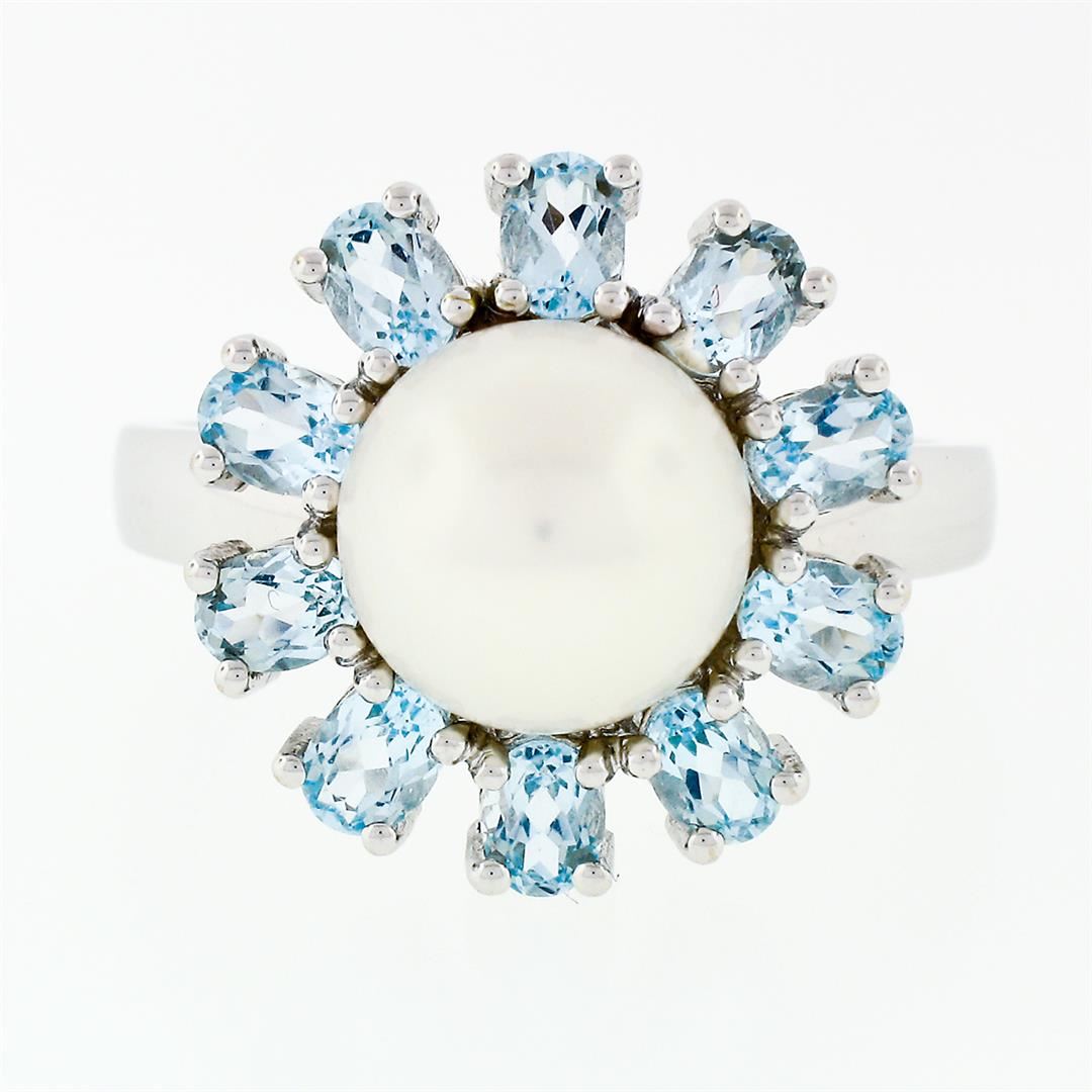 A solid 14k white gold ring with 1 round cultured pearl (9.72 to 9.75mm) and a halo of 33 oval brillaint cut natural aquamarines (2.00ctw). The ring is size 9.5, weighs a total of 6.20 grams, and measures 17.67mm wide.