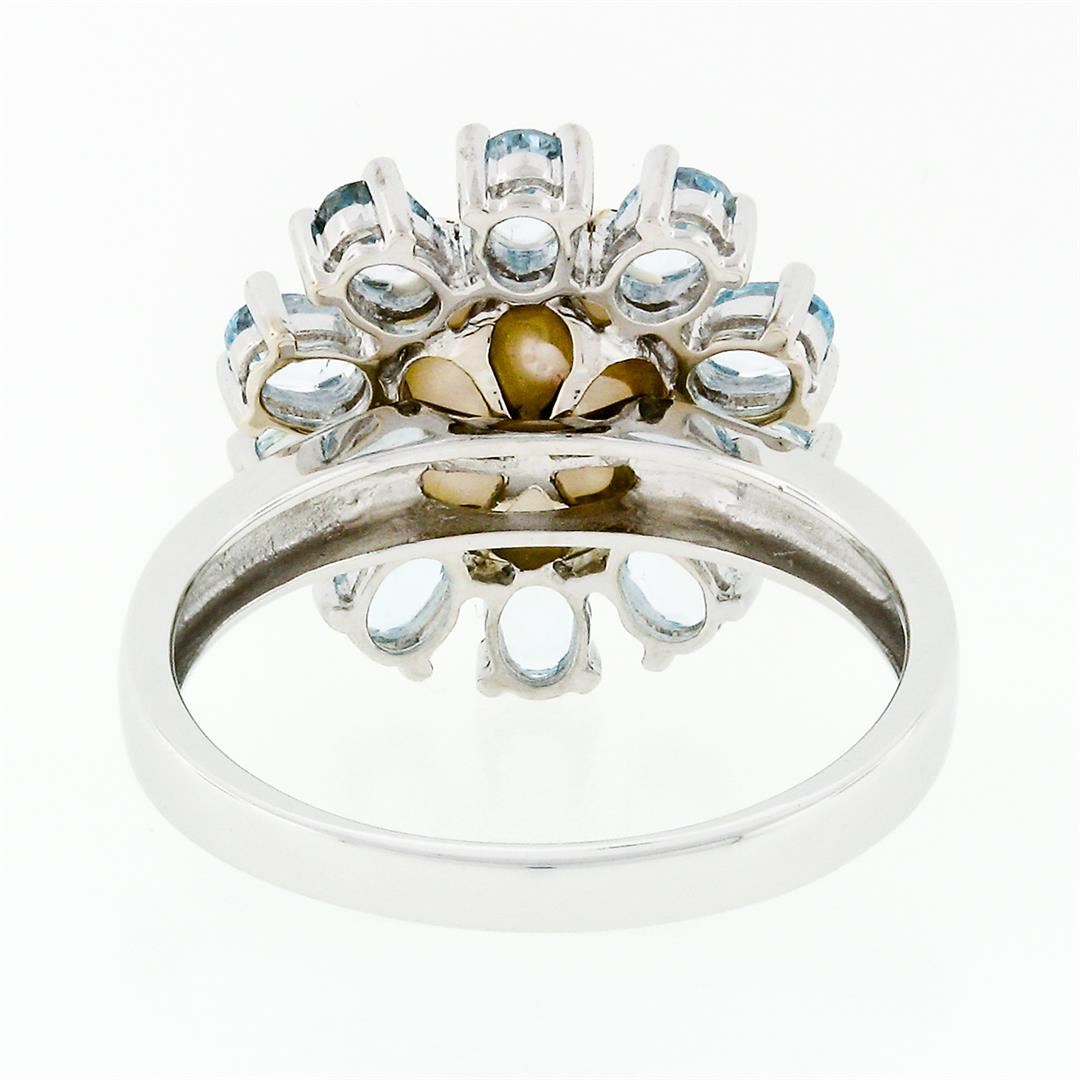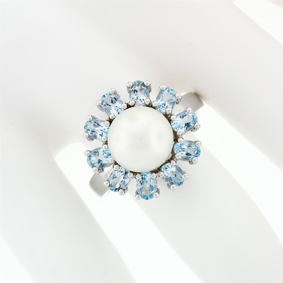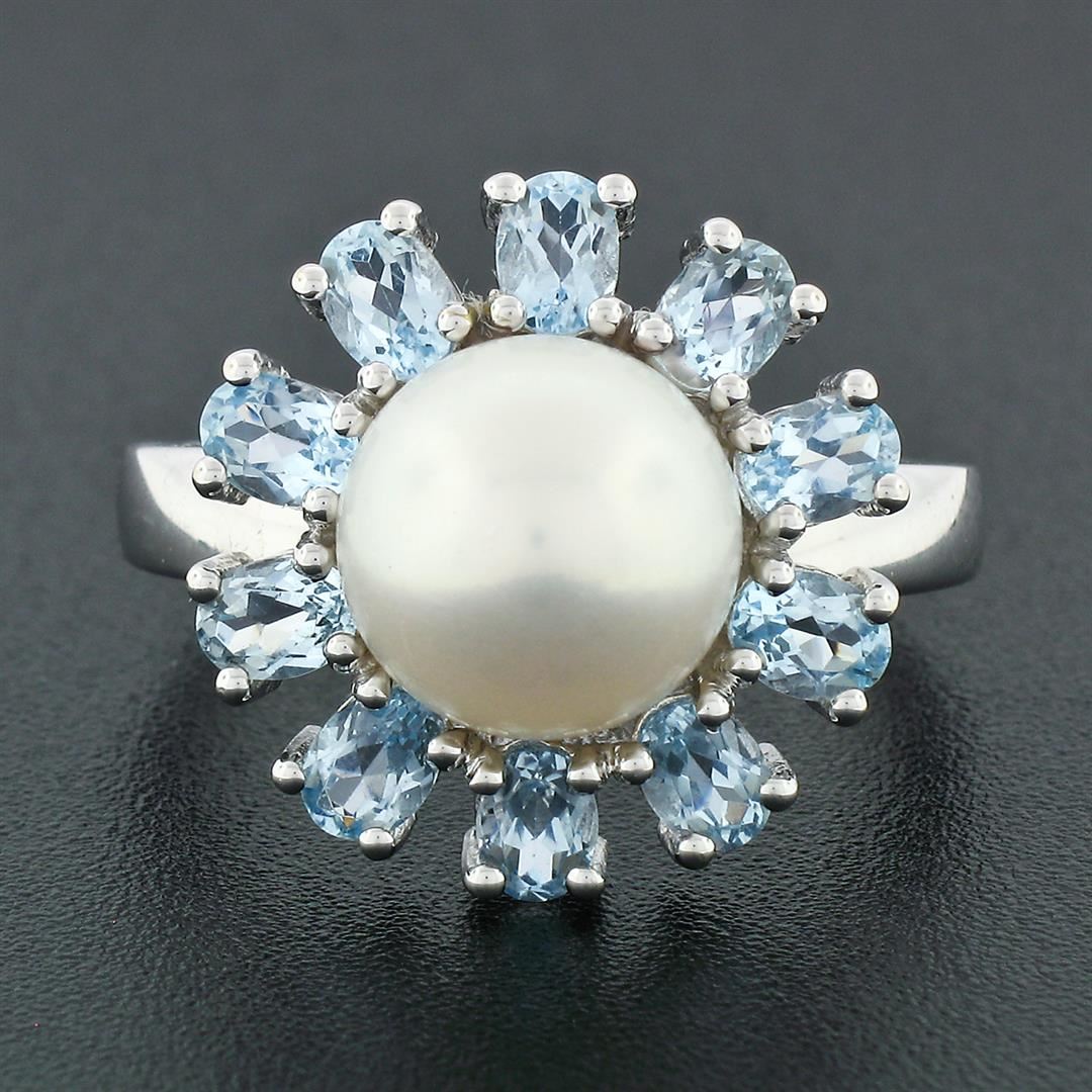 A solid 14k white gold ring with 1 round cultured pearl (9.72 to 9.75mm) and a halo of 33 oval brillaint cut natural aquamarines (2.00ctw). The ring is size 9.5, weighs a total of 6.20 grams, and measures 17.67mm wide.
