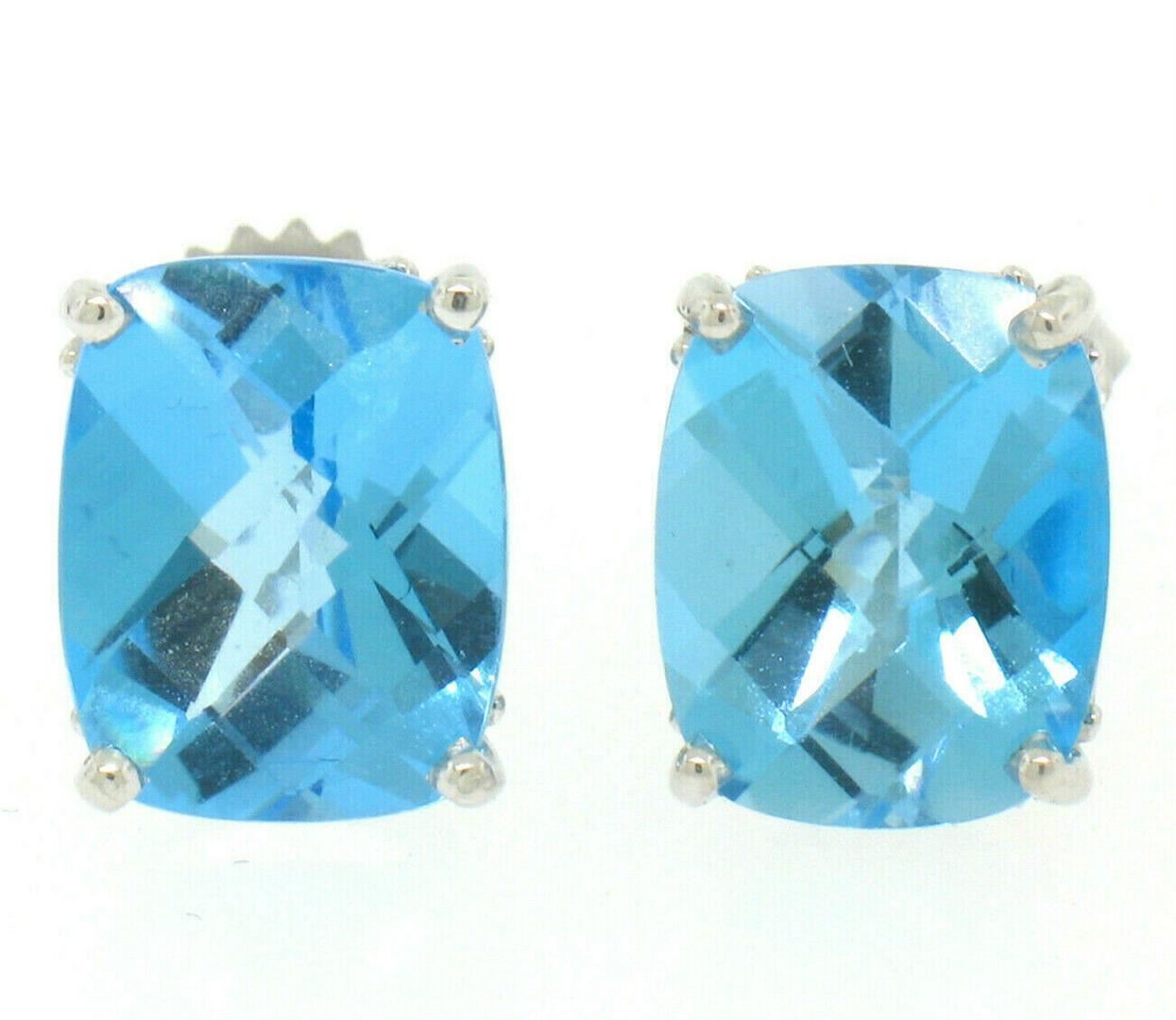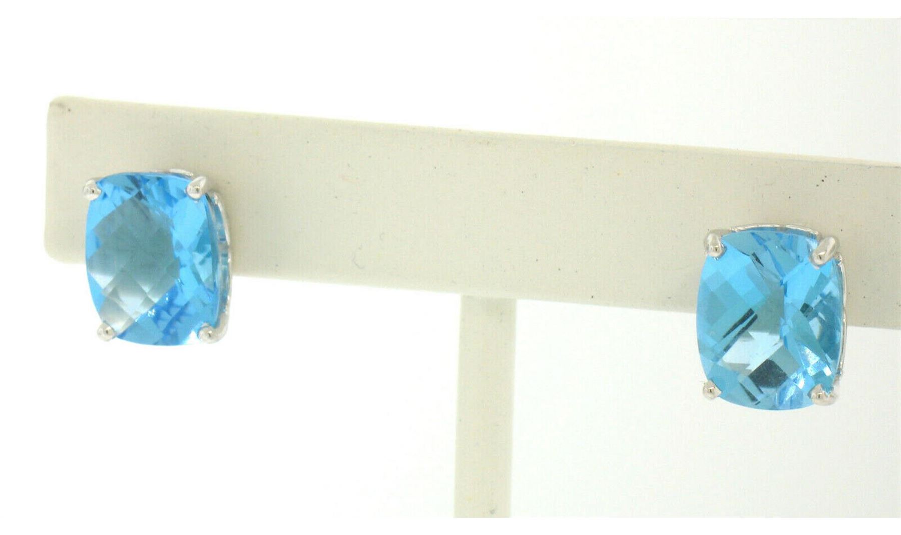 One Pair NEW 14k White Gold Cushion Cut Large Natural Blue Topaz Solitaire Stud Earrings. Item Details: Material: Solid 14k White Gold, Weight: 3.20 Grams, Stone(s): (2) Natural Genuine Blue Topaz - Cushion Brilliant Cut - Prong Set - Amazing Blue Color - 10.0x8.0mm, Total Carat Weight: 8.00 (approx.), Backing: Posts w/ Butterfly Backings (Pierced ears are required for wear.), Width: 8.00mm, Height: 10.00mm, Condition: New w/o Tags