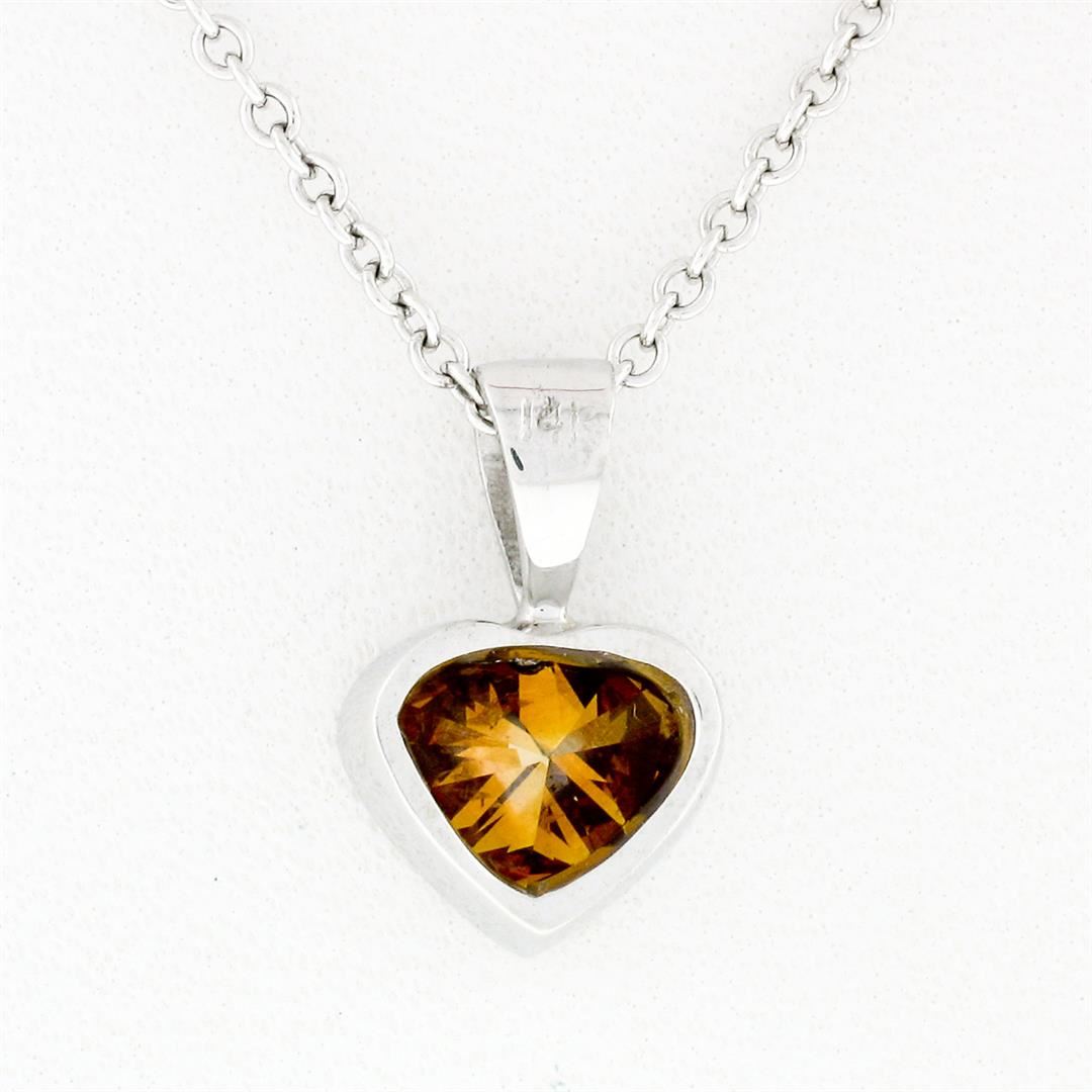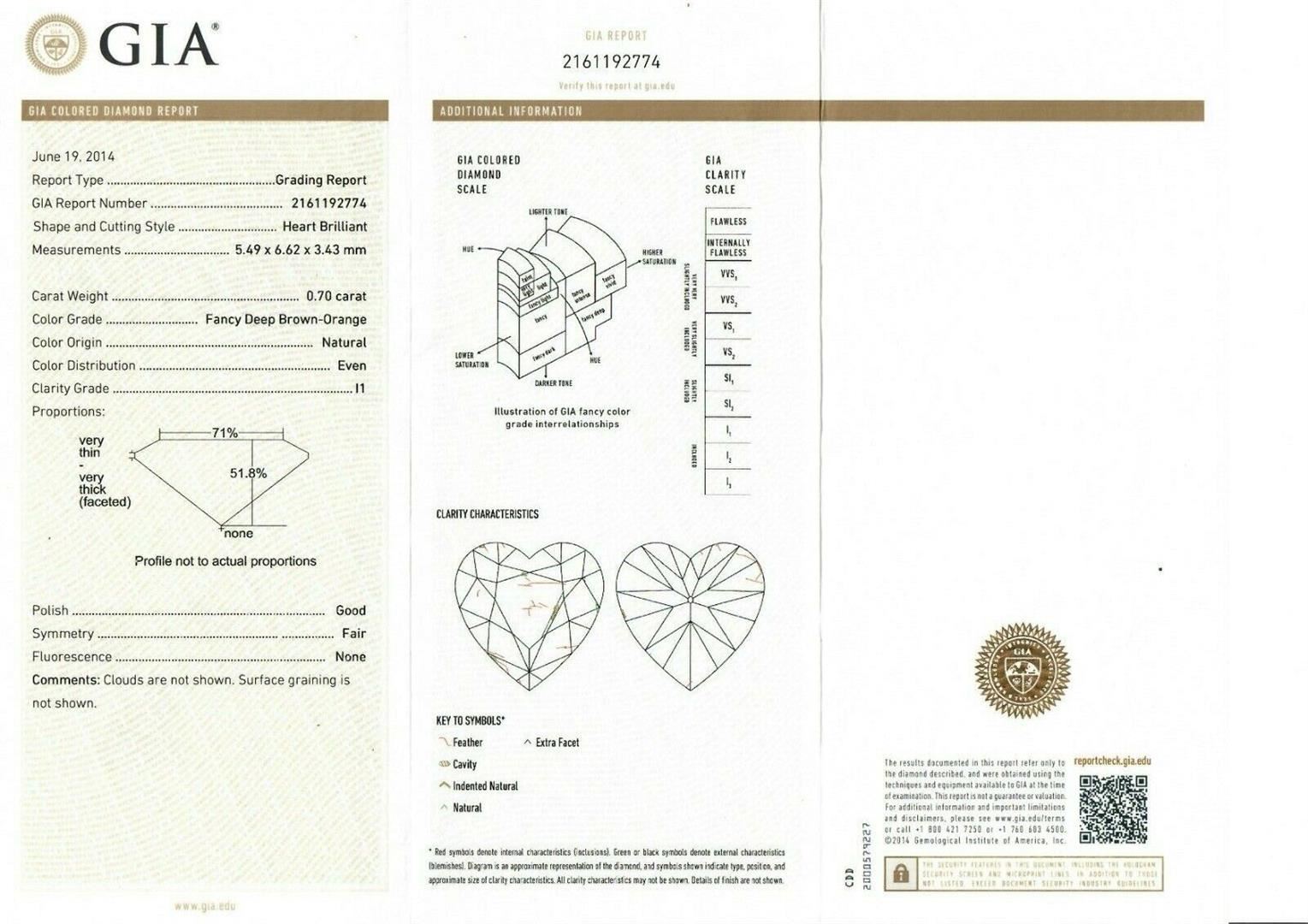 An estate solid 14k white gold heart pendant necklace, with 1 Gia certified heart brilliant cut natural diamond (fancy deep brown-orange color - I1 ; 0.70ct). The pendant weighs a total of 3.0 grams, measures 12.3x7.9mm including the bail, and 18 inch cable link chain. Comes with all original relevant certifications.