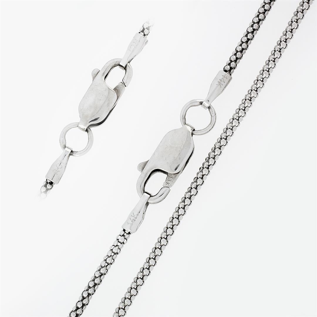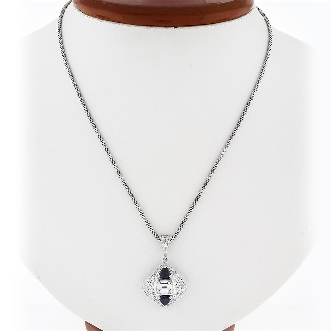 A solid 14k white gold pendant necklace, with 1 Gia certified emerald cut natural diamond ( I - VS2 ; 1.02ct ), and 14 trillion cut natural sapphires (0.60ctw), and 41 round brilliant cut natural diamonds (H/I - VS1/VS2 ; 0.50ctw). 19 inch popcorn link chain, 8.38 grams total weight, pendant measures 29.03x18.23mm. Comes with all original relevant certifications.