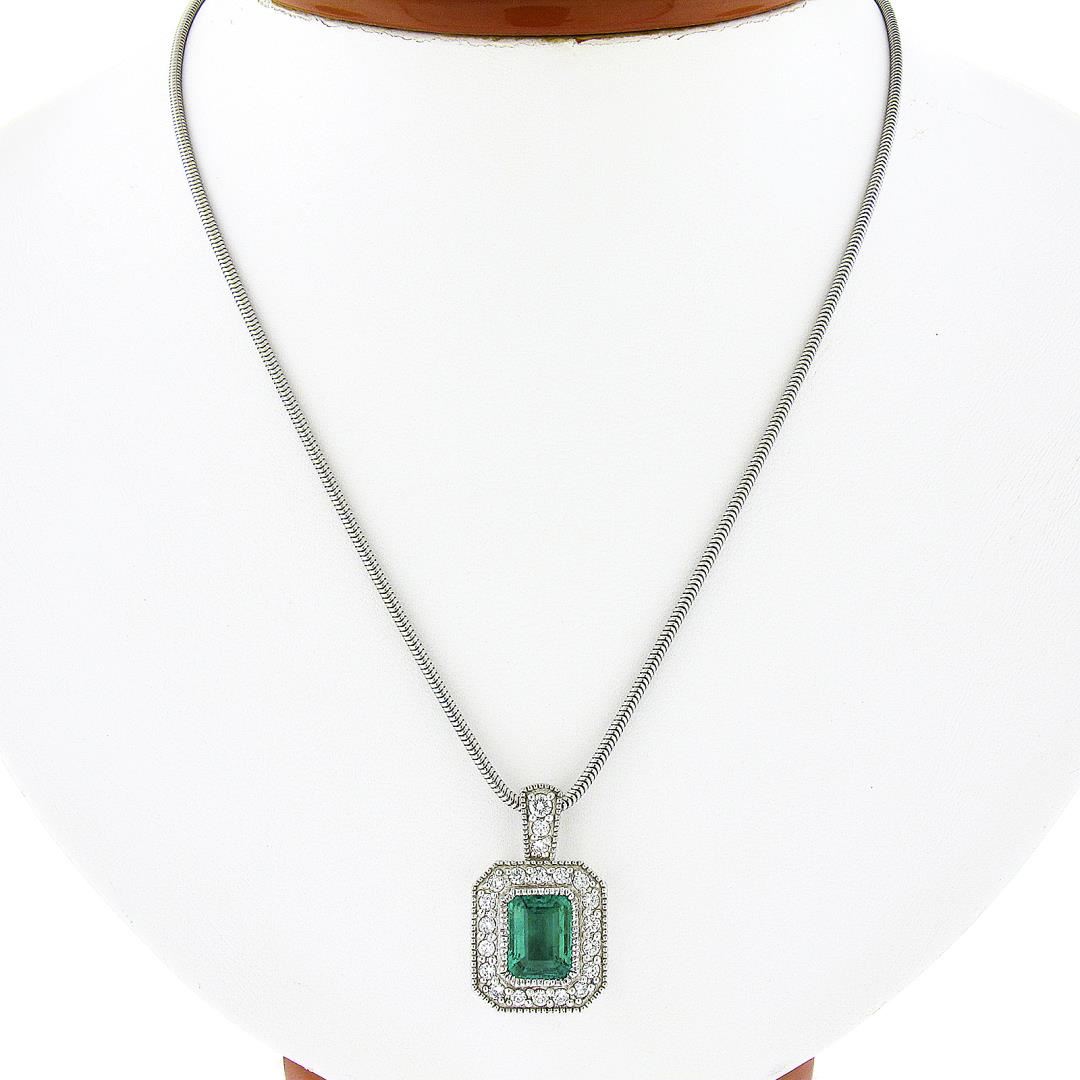 A solid 14k white gold pendant necklace, featuring 1 GIA graded emerald cut natural emerald (2.09ct), and 21 round brilliant cut natural diamonds (G/H - VS1/VS2 ; 0.65ctw). 18 inch snake link chain, 12.15 grams total weight, pendant measures 25.8x15.45mm. Comes with all original relevant certifications.