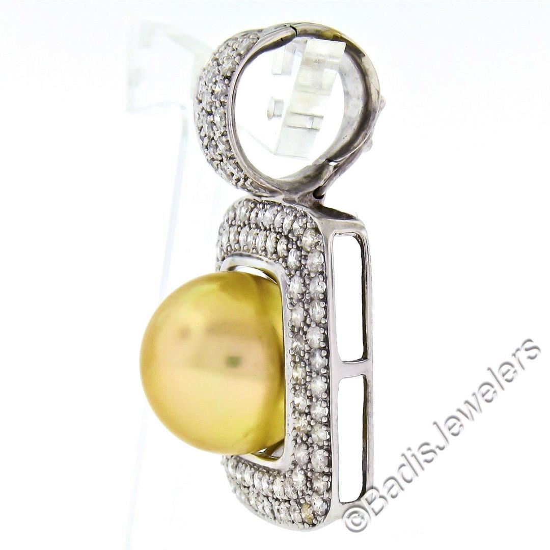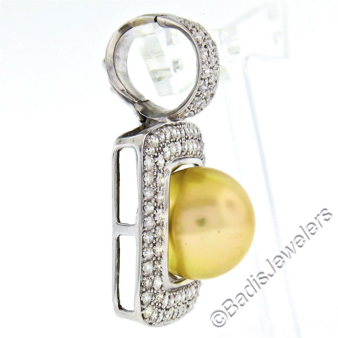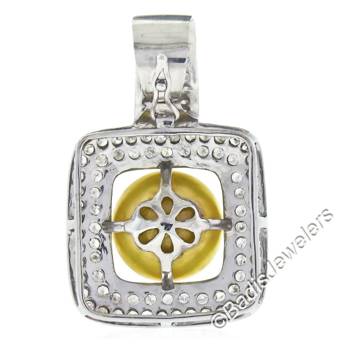 A like new 14kt white gold enhancer pendant featuring a 14.4mm round cultured pearl surrounded by 3.0ctw of round diamonds (G/H - SI2/I1). The pendant weighs a total of 13.34 grams, measures 39.5x25.6mm, and the inside of the bail measures 11.0x10.6mm.