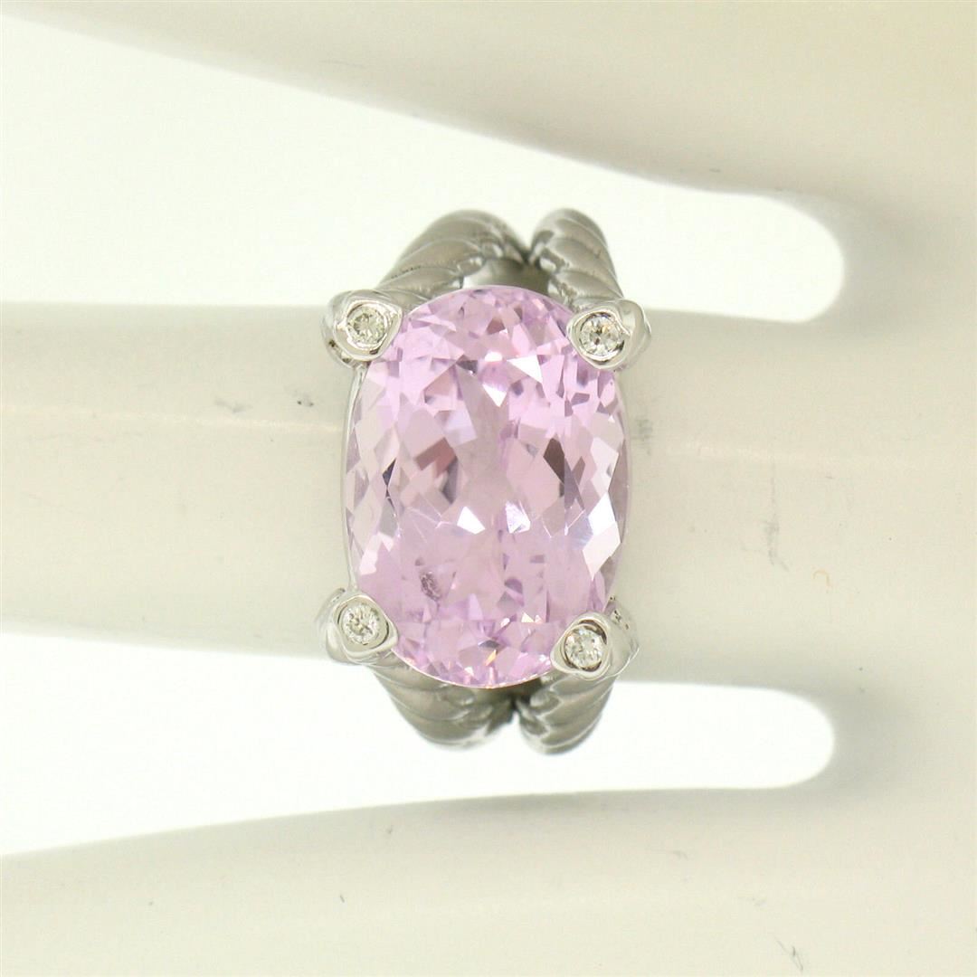A solid 14k white gold band ring, with 1 oval cut natural kunzite (8.50ct ), and 4 round brilliant cut natural diamonds (VS2 ; G - 0.06ctw). The ring is size 5.75, weighs a total of 8.4 grams, and measures 11.66mm wide.