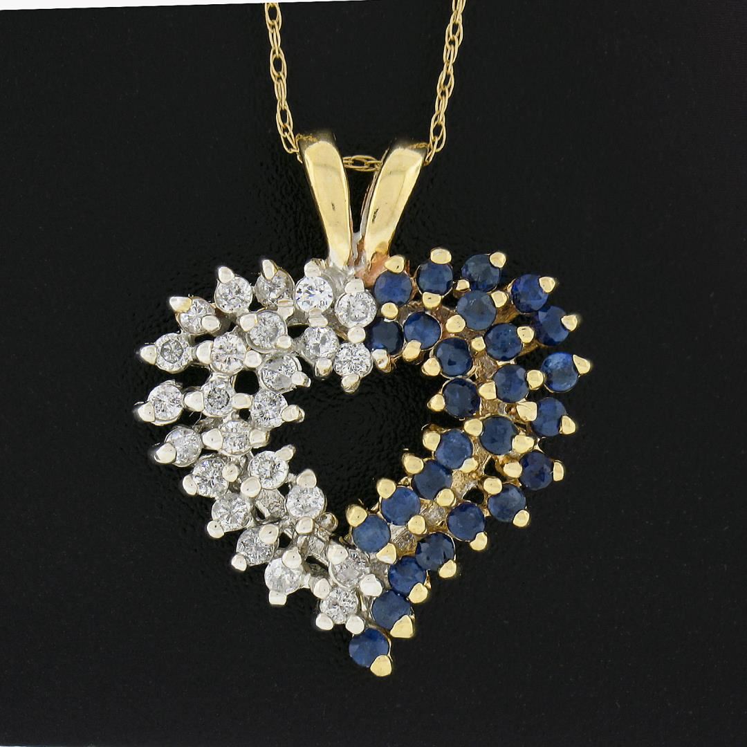 A solid 14k yellow gold heart pendant necklace, with 24 round brilliant cut natural diamonds (G/I - I1/I2 ; 0.48ctw), and 26 round brilliant cut natural sapphires (0.60ctw). 21 inch rope link chain, 4.70 grams total weight, pendant measures 20x21.3mm.