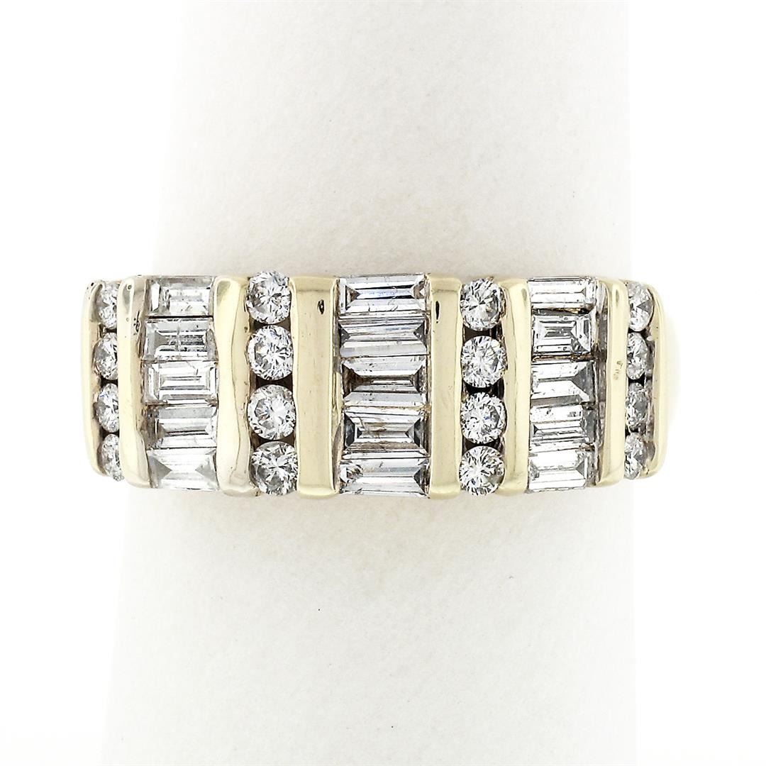 A solid 14k yellow gold band ring, with 16 round brilliant cut natural diamonds (F/G - SI1/SI2 ; 0.32ctw), and 15 baguette cut natural diamonds (F/G - SI1/SI2 ; 1.05ctw). The ring is size 7.5, weighs a total of 5.80 grams, and measures 7.77mm wide.