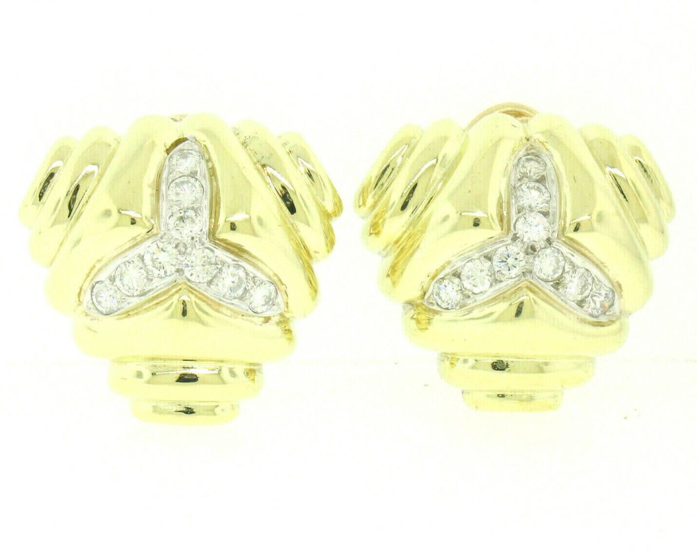 Like new 14k yellow gold triangular clip-on earrings with 1.80ctw of round diamonds (F - VS1). The earrings measure approximately 24.91x23.95mm and weigh a total of 25.60 grams.