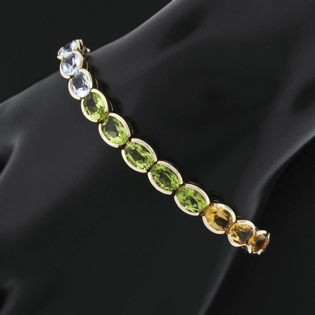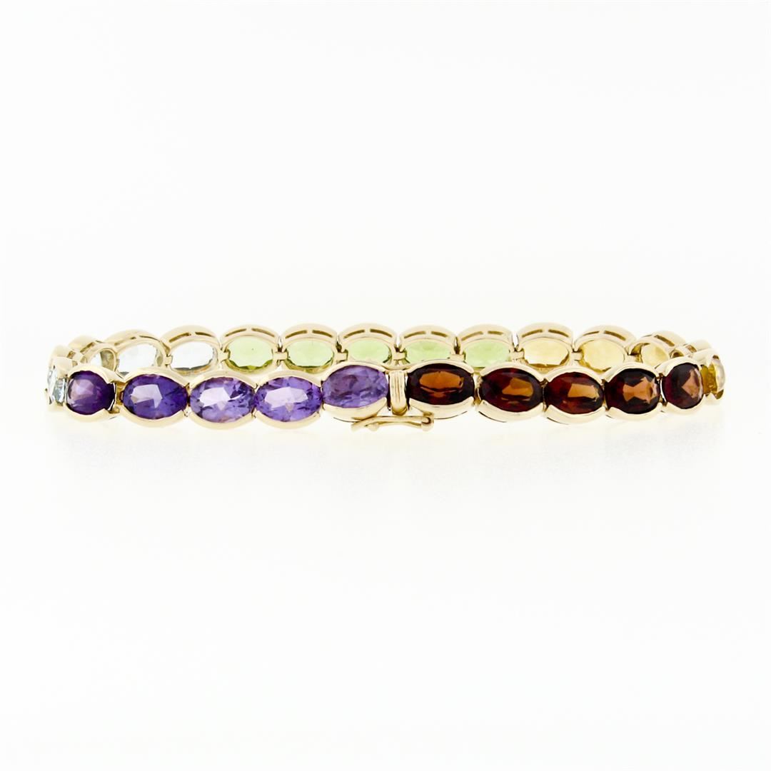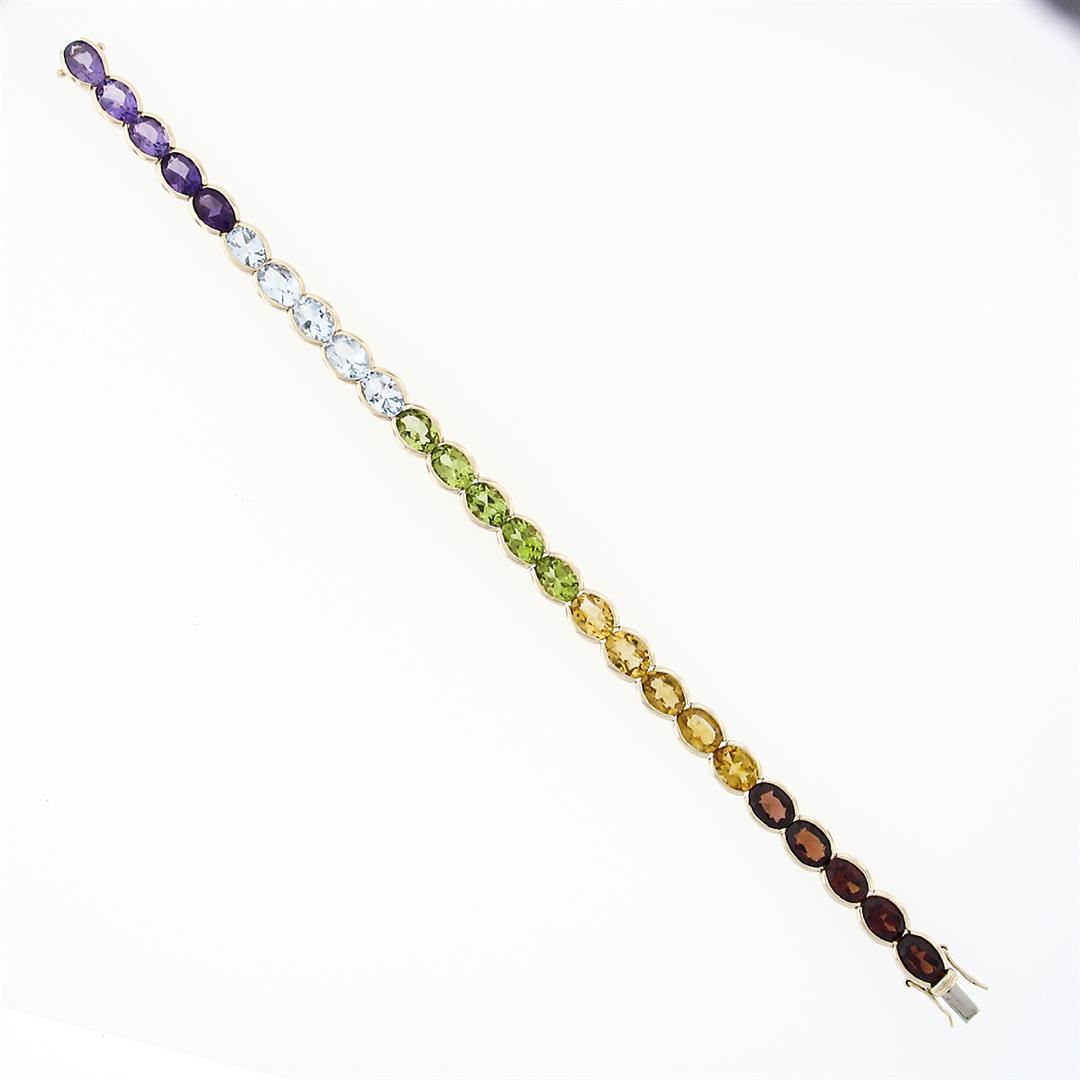 A solid 14k yellow gold tennis line bracelet, with oval brilliant cut 5 natural amethysts, 5 natural topaz, 5 natural peridot, 5 natural citrine, 5 natural garnets (17.65ctw). It weighs a total of 16.21 grams, measures 6.38mm wide, and measures 6.75 inches in length.