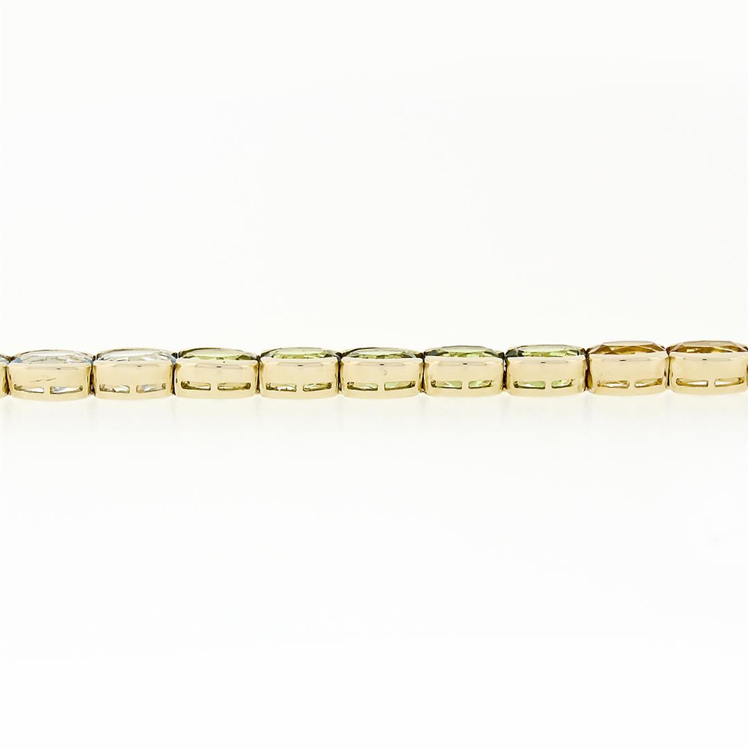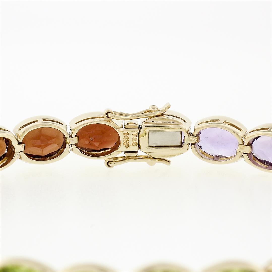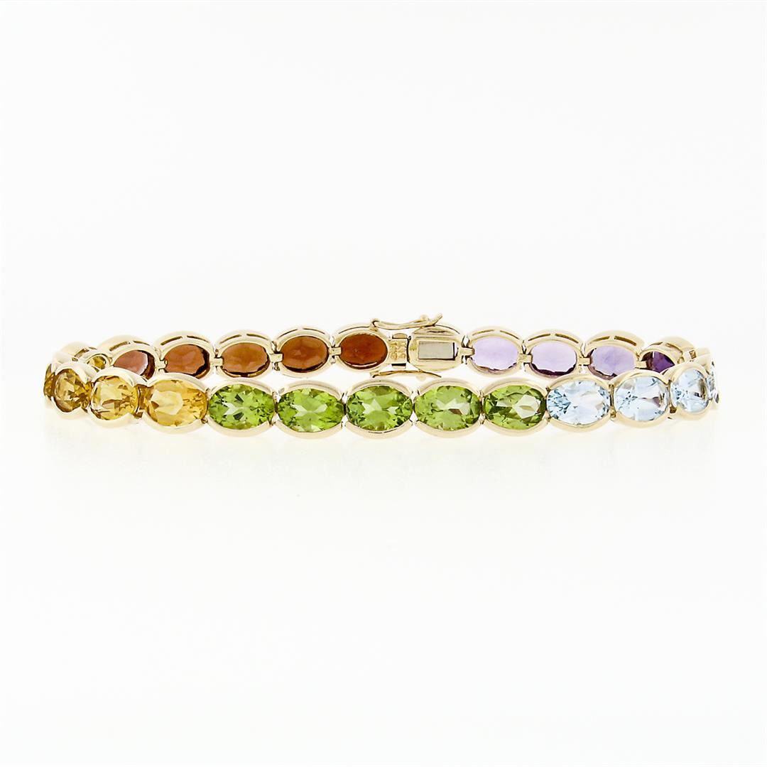 A solid 14k yellow gold tennis line bracelet, with oval brilliant cut 5 natural amethysts, 5 natural topaz, 5 natural peridot, 5 natural citrine, 5 natural garnets (17.65ctw). It weighs a total of 16.21 grams, measures 6.38mm wide, and measures 6.75 inches in length.
