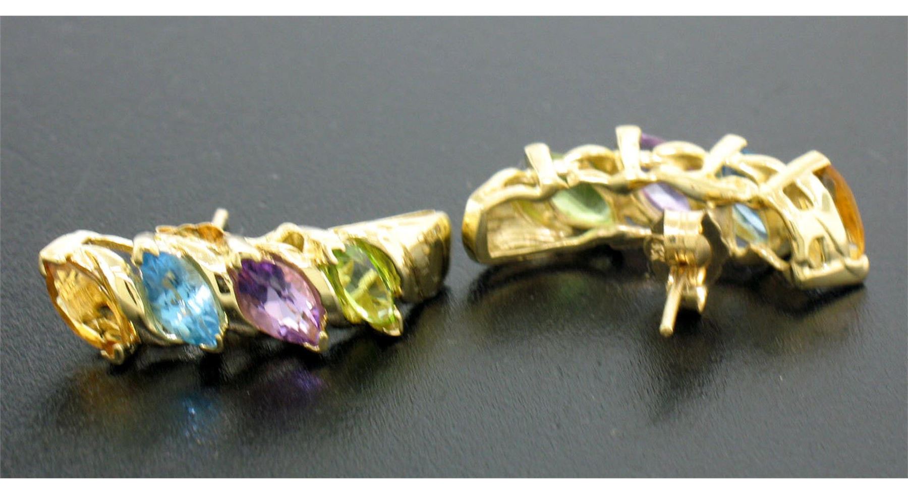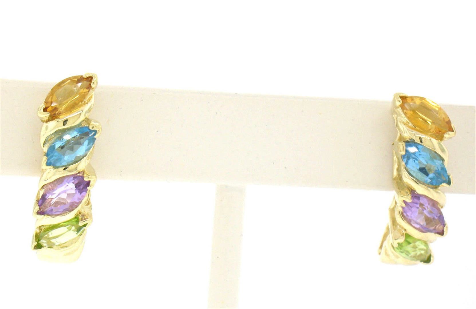 14k Yellow Gold 2.00ctw Marquise Cut Amethyst Peridot & Topaz Cuff Post Earrings. Please see photos and description for all available information. An estate solid 14k yellow gold cuff post earrings, featuring marquise cut of 4 natural topaz, 2 natural amethyst, 2 natural peridot (2.00ctw). The earrings measure approximately 21.30x6.07mm and weigh a total of 4.0 grams.