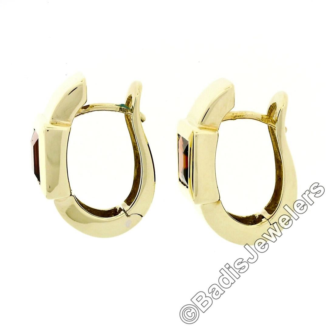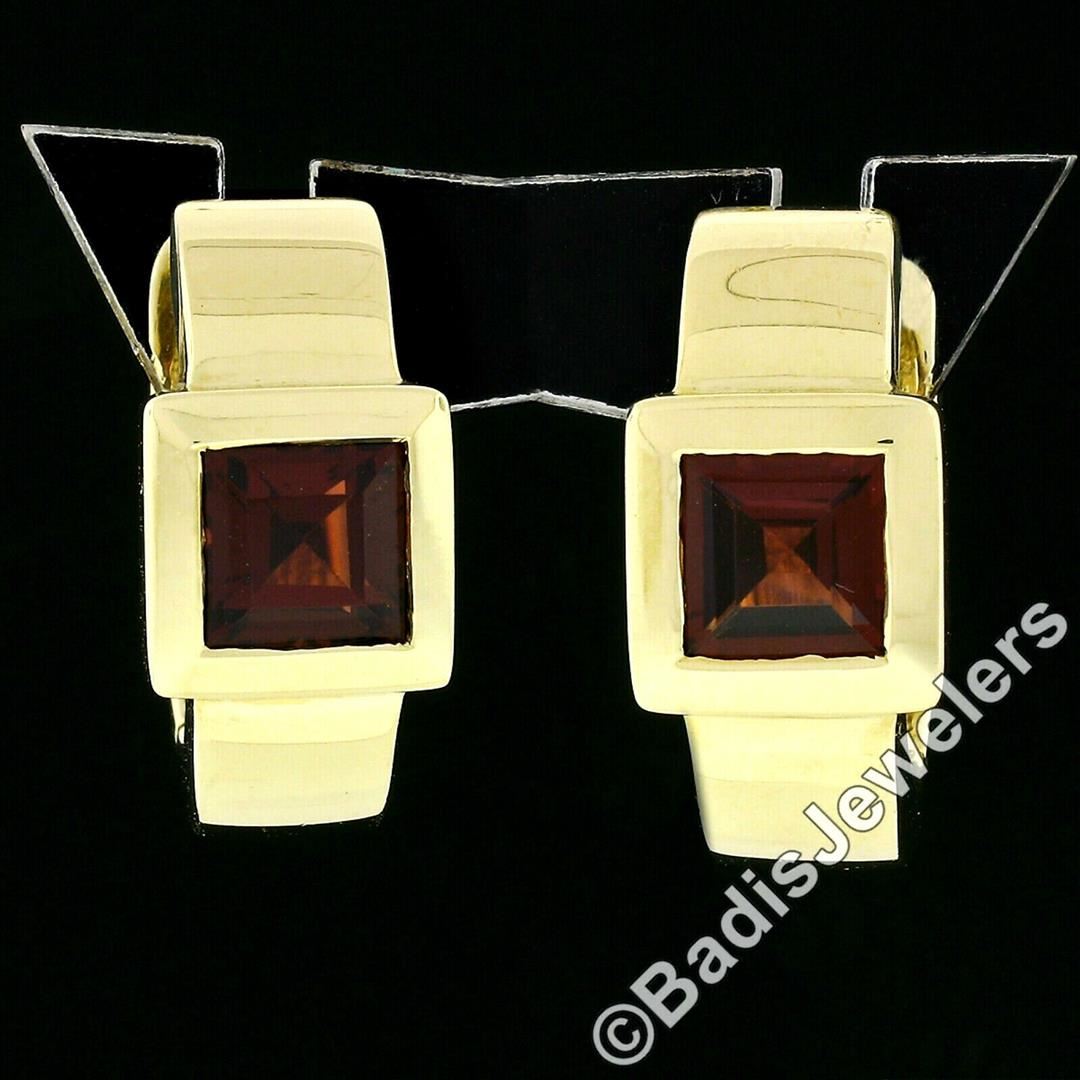 An estate solid 14k yellow gold huggie earrings, with 2 square step cut natural garnets (6.1mm - 2.50ctw). The earrings measure approximately 19.5x9.15mm and weigh a total of 8.60 grams.
