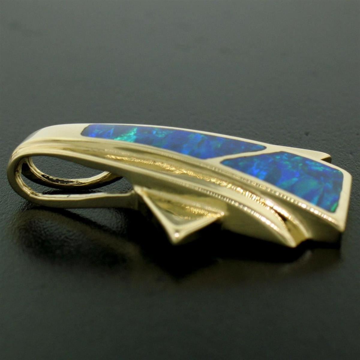One 14k Yellow Gold 2 Inlaid Freeform Geometric Blue & Green Boulder Opal Pendant. Item Details: Material: 14K Solid Yellow Gold, Weight: 6.9 Grams, Stone(s): (2) Boulder Opal - Freeform Cuts - Inlaid - Iridescent Green and Blue Color, Chain Type: Not Included, Width: 20.52mm, Height: 31.37mm, Thickness: 6.68mm, Inside Bail Measurements: 7.45x4.15mm Condition: Like New!