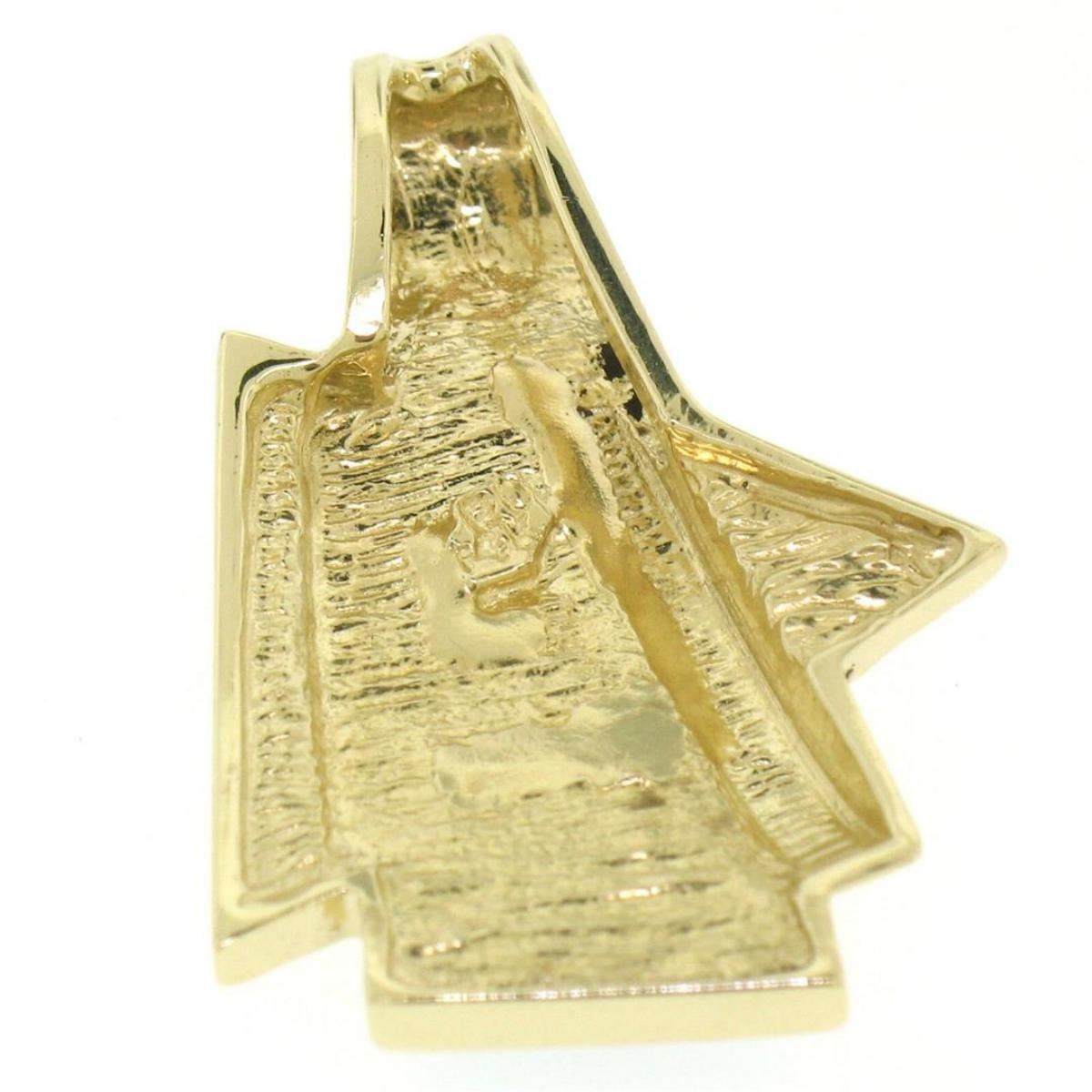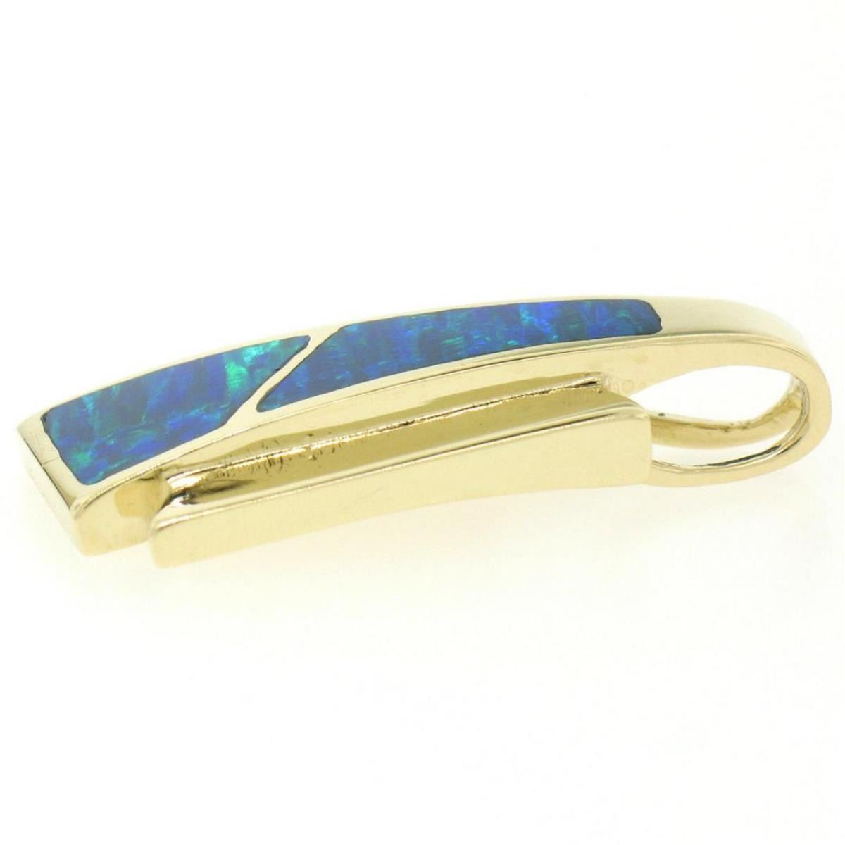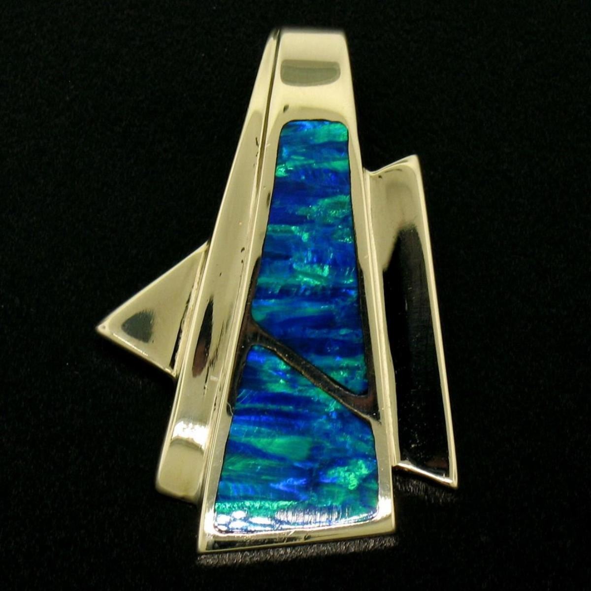 One 14k Yellow Gold 2 Inlaid Freeform Geometric Blue & Green Boulder Opal Pendant. Item Details: Material: 14K Solid Yellow Gold, Weight: 6.9 Grams, Stone(s): (2) Boulder Opal - Freeform Cuts - Inlaid - Iridescent Green and Blue Color, Chain Type: Not Included, Width: 20.52mm, Height: 31.37mm, Thickness: 6.68mm, Inside Bail Measurements: 7.45x4.15mm Condition: Like New!