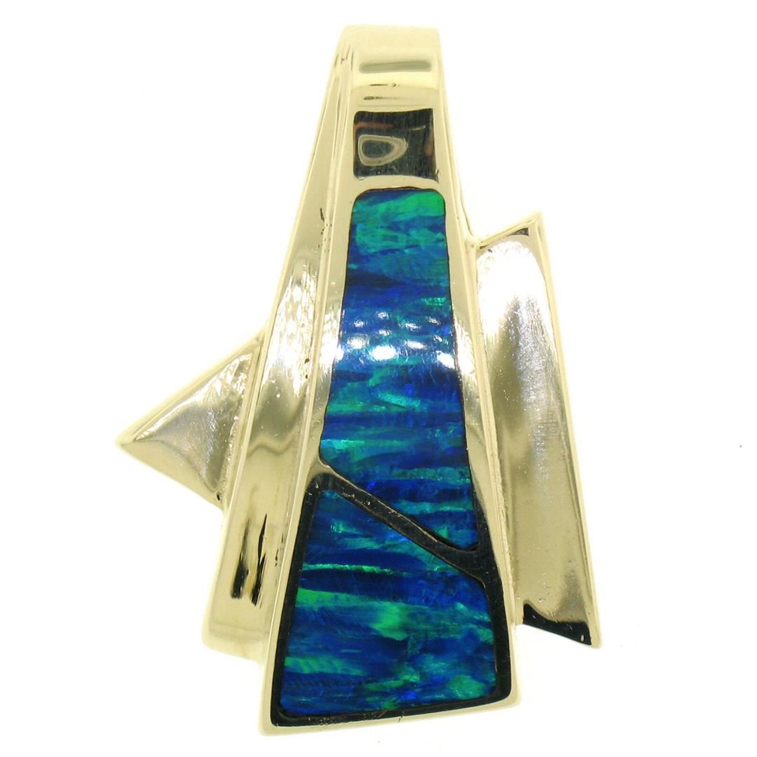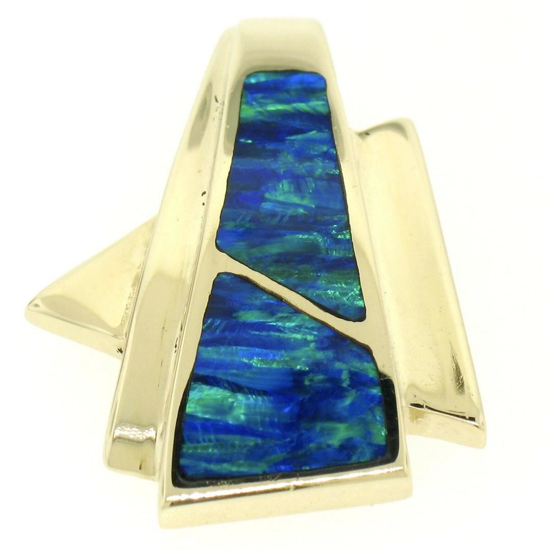 One 14k Yellow Gold 2 Inlaid Freeform Geometric Blue & Green Boulder Opal Pendant. Item Details: Material: 14K Solid Yellow Gold, Weight: 6.9 Grams, Stone(s): (2) Boulder Opal - Freeform Cuts - Inlaid - Iridescent Green and Blue Color, Chain Type: Not Included, Width: 20.52mm, Height: 31.37mm, Thickness: 6.68mm, Inside Bail Measurements: 7.45x4.15mm Condition: Like New!