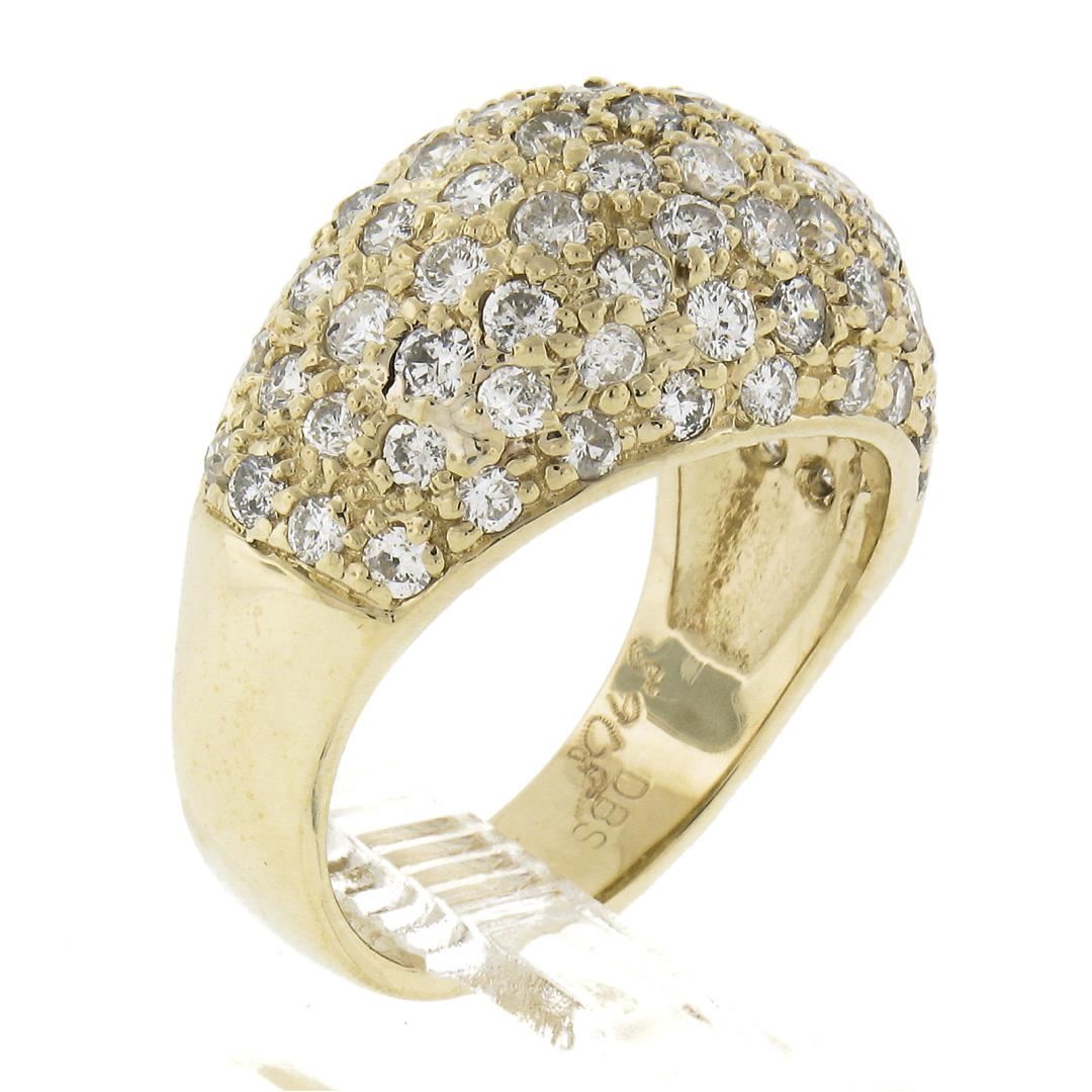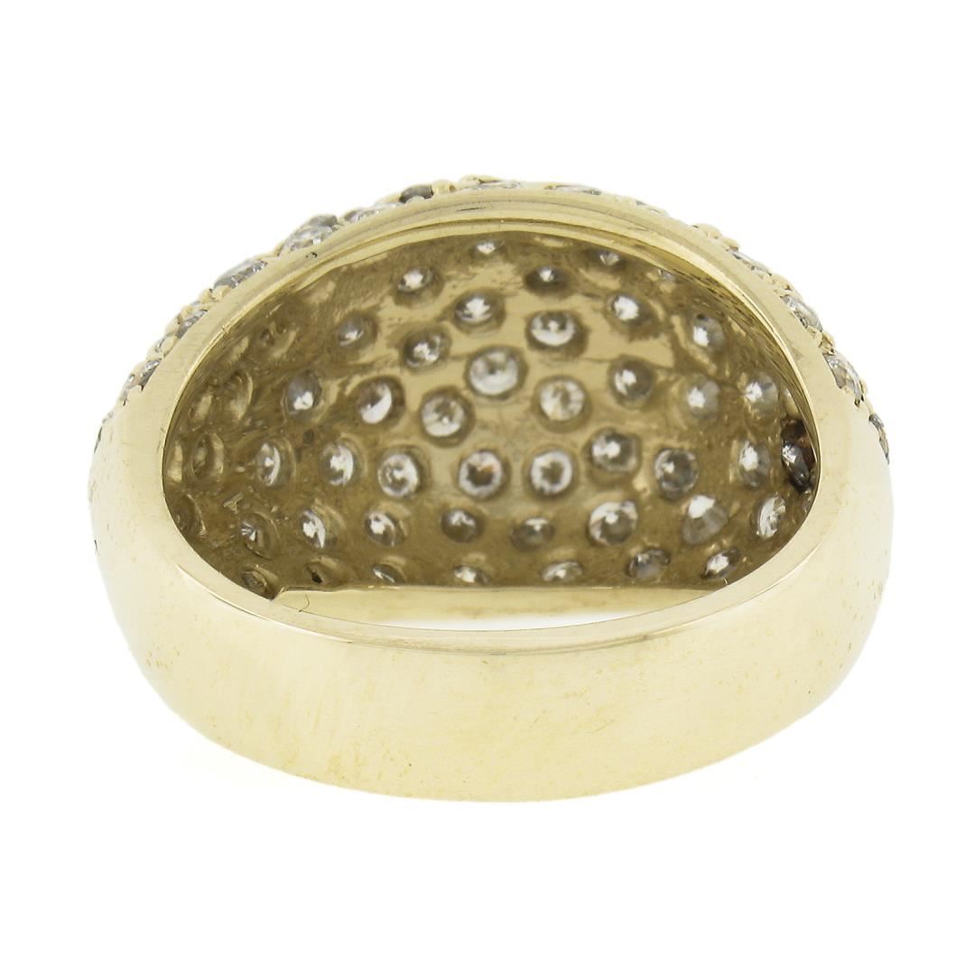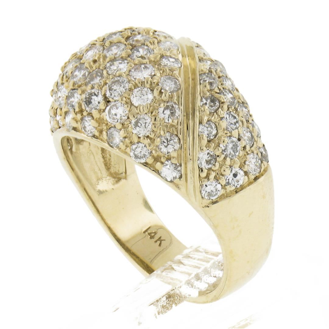 A solid 14k yellow gold domed band ring, covered with 90 round cut natural diamonds (G/H - VS2-SI2 ; 2ctw). The ring is size 6.5, weighs a total of 7 grams, and measures 13.2mm wide.