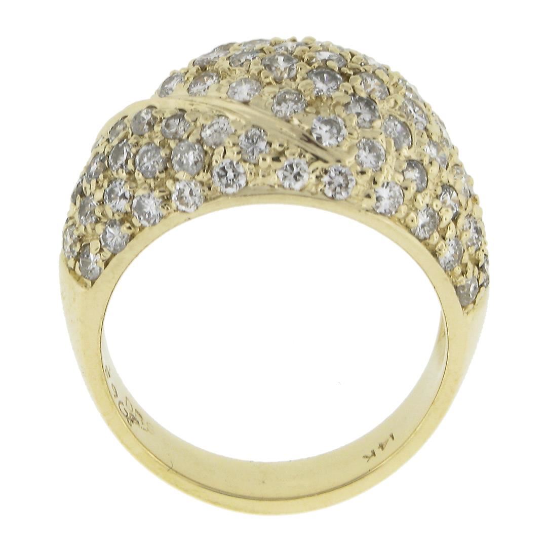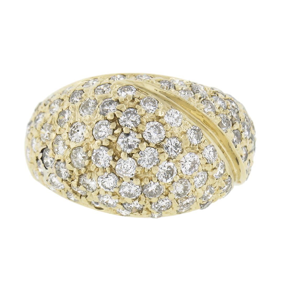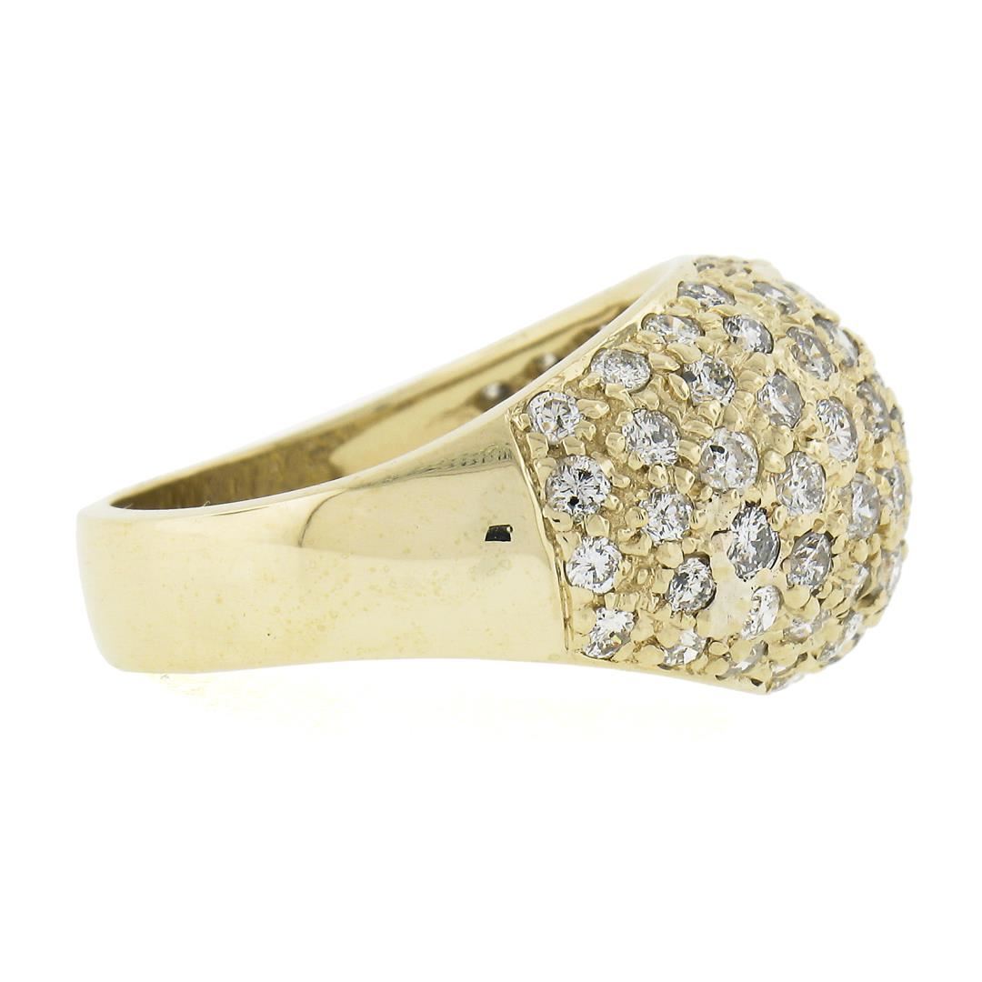 A solid 14k yellow gold domed band ring, covered with 90 round cut natural diamonds (G/H - VS2-SI2 ; 2ctw). The ring is size 6.5, weighs a total of 7 grams, and measures 13.2mm wide.
