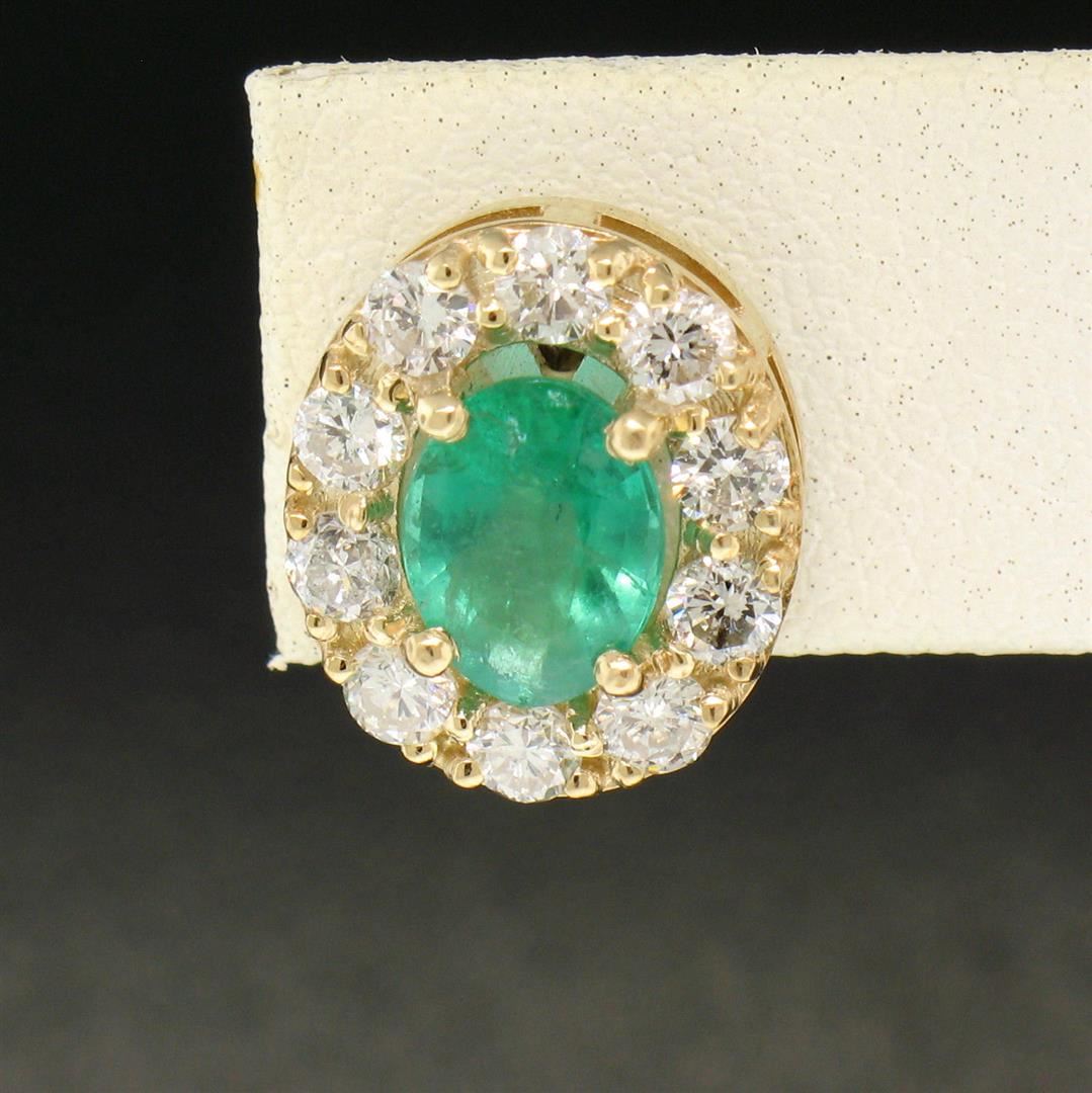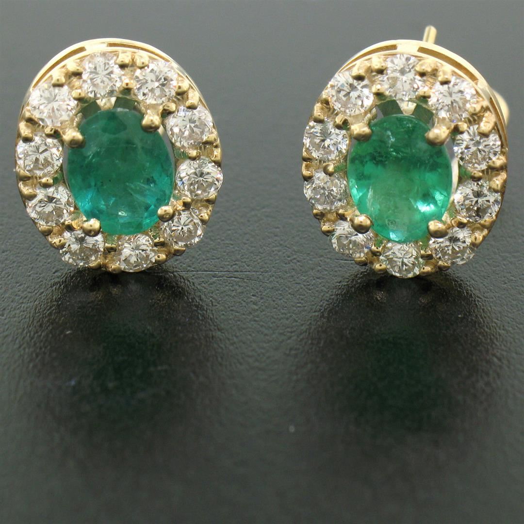 One Pair 14k Yellow Gold 3.71ctw Oval Emerald & Round Diamond Halo Cluster Omega Earrings. Item Details: Material: 14k Solid Yellow Gold, Weight: 5.5 Grams, Stone(s): (2) Natural Genuine Emerald - Oval Cut - Prong Set - Gorgeous and Rich Medium Green Color - 2.20 ctw (exact), (20) Natural Genuine Diamonds - Round Brilliant Cut - Prong Set - E/F Color - VVS2/VS1 Clarity - 1.51ctw (exact), Total Carat Weight: 3.71 (exact), Backing: Omega Backs w/ Posts (Pierced ears required.), Width: 11.72mm, Height: 13.71mm, Thickness: 5.13mm projection off the ear, Condition: New, custom made earrings. Top quality!