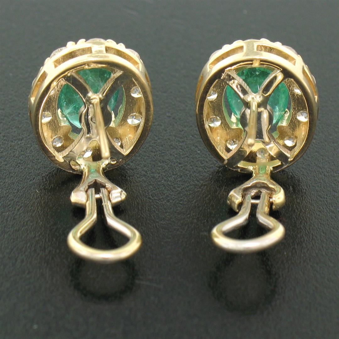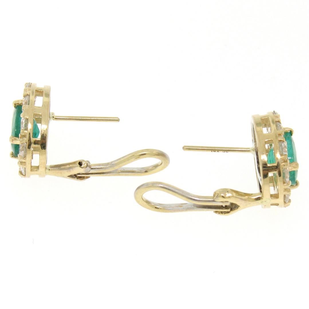 One Pair 14k Yellow Gold 3.71ctw Oval Emerald & Round Diamond Halo Cluster Omega Earrings. Item Details: Material: 14k Solid Yellow Gold, Weight: 5.5 Grams, Stone(s): (2) Natural Genuine Emerald - Oval Cut - Prong Set - Gorgeous and Rich Medium Green Color - 2.20 ctw (exact), (20) Natural Genuine Diamonds - Round Brilliant Cut - Prong Set - E/F Color - VVS2/VS1 Clarity - 1.51ctw (exact), Total Carat Weight: 3.71 (exact), Backing: Omega Backs w/ Posts (Pierced ears required.), Width: 11.72mm, Height: 13.71mm, Thickness: 5.13mm projection off the ear, Condition: New, custom made earrings. Top quality!