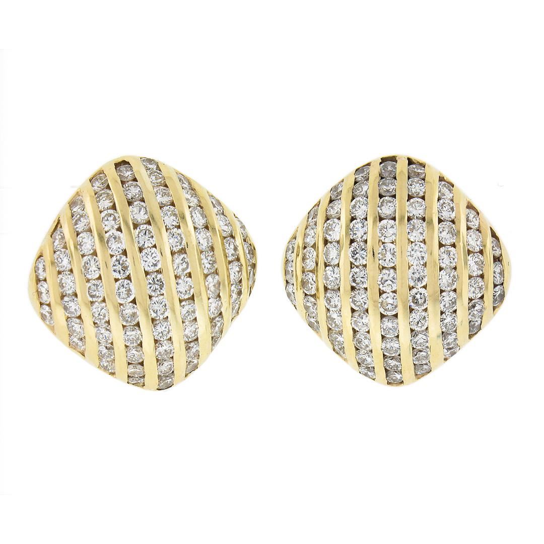 A solid 14k yellow gold button earrings, with 138 round cut natural diamonds (G-H - VS1/VS2 w/ a few SI ; 4.14ctw). The earrings measure approximately 21x20.7mm and weigh a total of 13.82 grams.