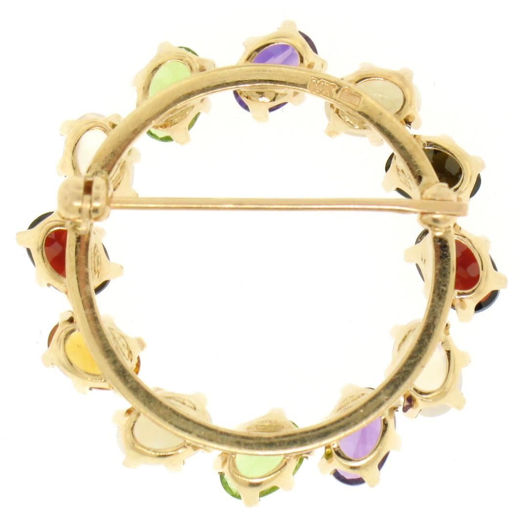 One 14k Yellow Gold 5.18ctw Wreath Brooch w/ Amethyst Garnet Moonstone Peridot Opal. Item Details: Material: 14k Solid Yellow Gold, Weight: 6.7 Grams, Stone(s): (2) Natural Genuine Amethysts - Oval Cut - Prong Set - Rich Medium Purple Color - 0.85ctw (approx.), (2) Natural Genuine Peridot - Oval Cut - Prong Set - Lime Green Color - 0.96ctw (approx.), (2) Natural Genuine Garnets - Oval Cut - Prong Set - Deep Orange-Red Color - 1.04ctw (approx.), (2) Natural Genuine Opals - Oval Cabochon Cut - Prong Set - Beautiful Red and Green Plays of Color - 0.50ctw (approx.), (2) Natural Genuine Moonstones - Oval Cabochon Cut - Prong Set - Pale Violetish-Blue Color - 0.86ctw (approx.), (1) Natural Genuine Citrine - Oval Cut - Prong Set - Rich Yellow-Orange Color - 0.42ct (approx.), (1) Natural Genuine Topaz - Oval Cut - Prong Set - Deep Greenish-Brown Color - 0.55ct (approx.), Total Carat Weight: 5.18 (approx.), Width: 30.06mm, Height: 29.99mm, Thickness: 5.86mm, Condition: Excellent condition!
