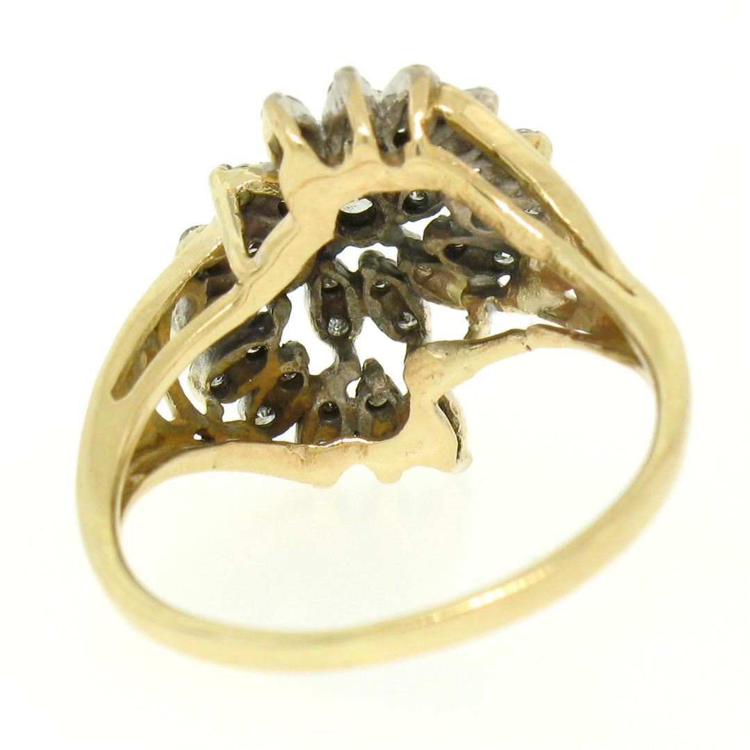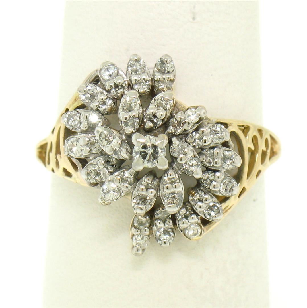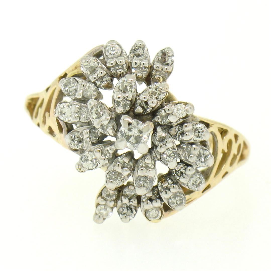 One 14k Yellow Gold 0.50ctw Round Brilliant Diamond Spiral Cluster Ring w/ Open Work Sides. Item Details: Material: 14k Solid Yellow Gold, Weight: 3.2 Grams, Stone(s): (45) Natural Genuine Diamonds - Round Brilliant Cut - Prong Set - H Color - SI2/I1 Clarity, Total Carat Weight: 0.50 (approx.), Ring Size: 6.5 (We can custom size this ring.), Ring Width: 15.30mm, Ring Height: 8.09mm rise off the finger, Condition: Excellent condition!