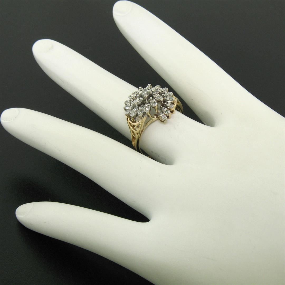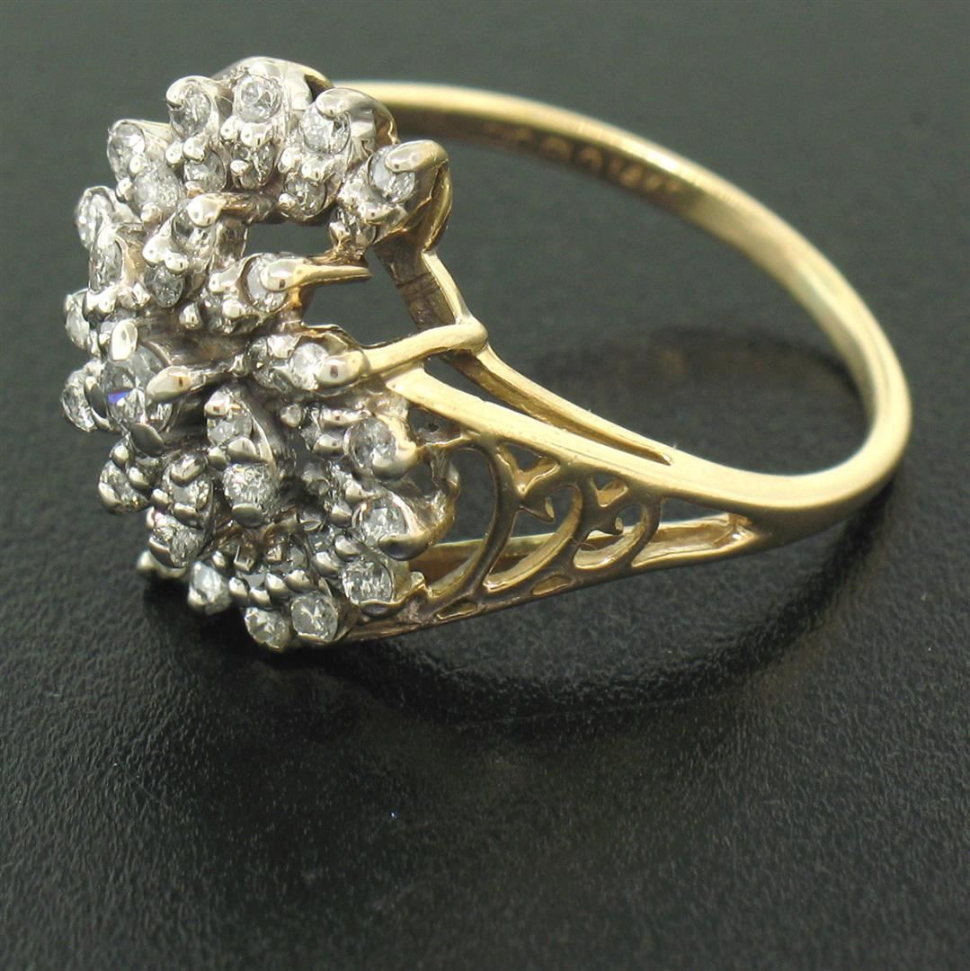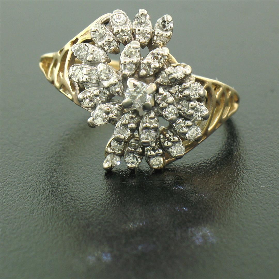 One 14k Yellow Gold 0.50ctw Round Brilliant Diamond Spiral Cluster Ring w/ Open Work Sides. Item Details: Material: 14k Solid Yellow Gold, Weight: 3.2 Grams, Stone(s): (45) Natural Genuine Diamonds - Round Brilliant Cut - Prong Set - H Color - SI2/I1 Clarity, Total Carat Weight: 0.50 (approx.), Ring Size: 6.5 (We can custom size this ring.), Ring Width: 15.30mm, Ring Height: 8.09mm rise off the finger, Condition: Excellent condition!