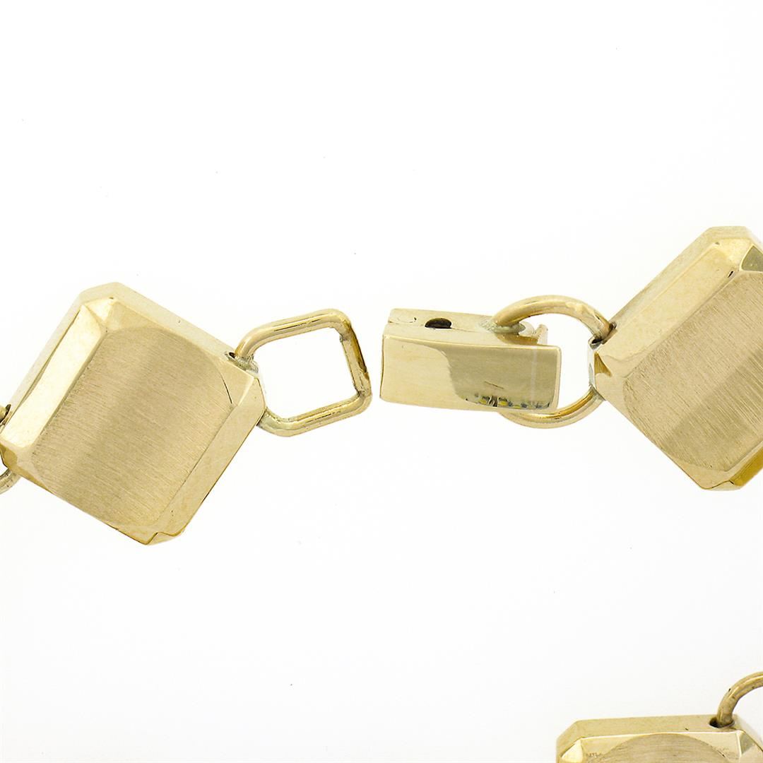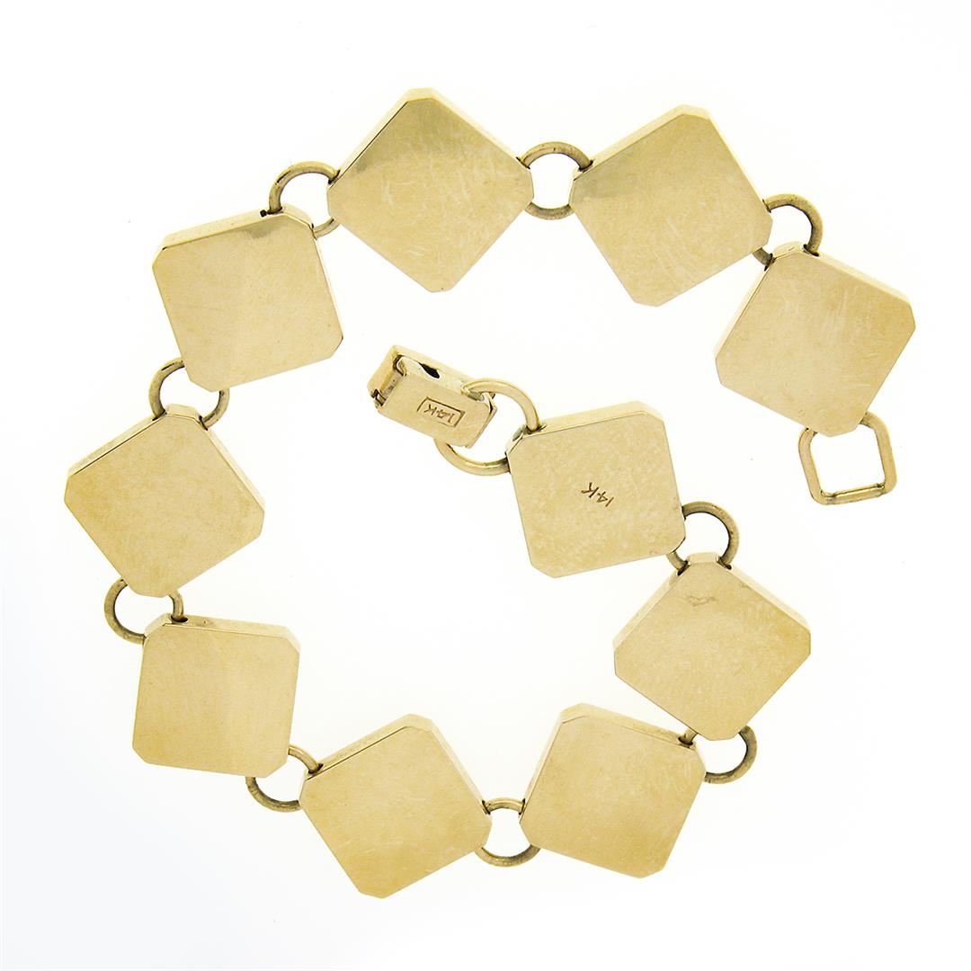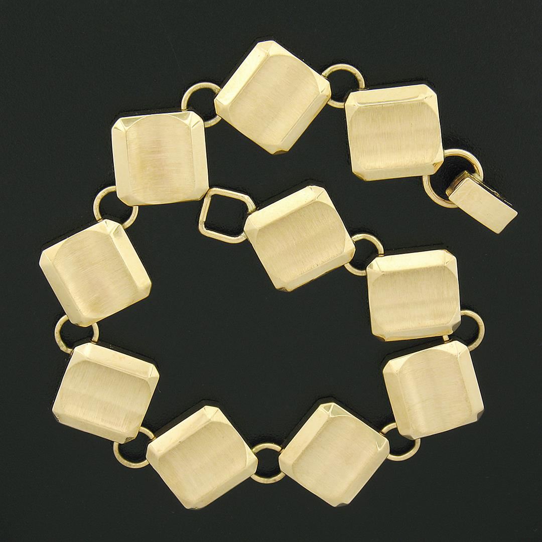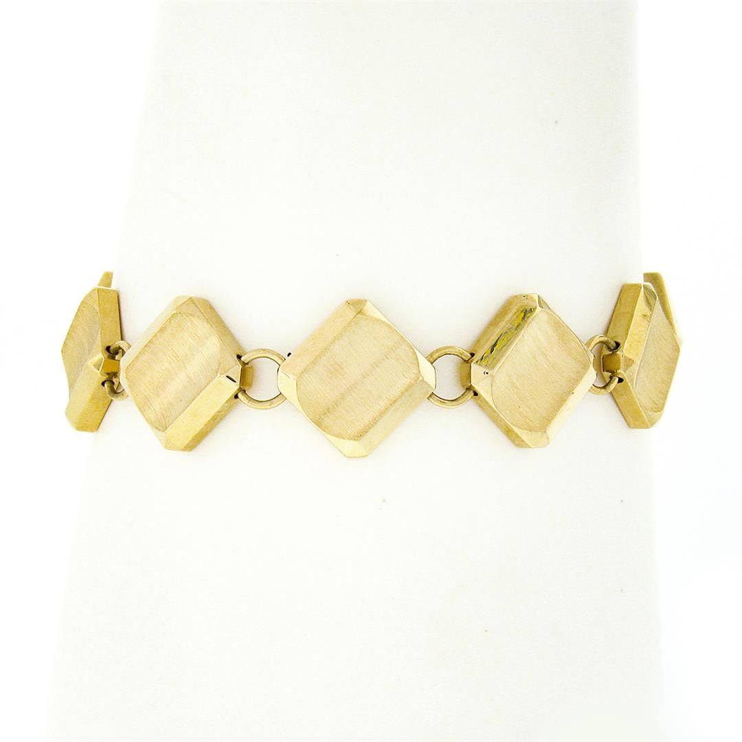 A solid 14k yellow gold bracelet. It weighs a total of 13 grams, measures 14mm wide, and measures 6.5 inches in length.