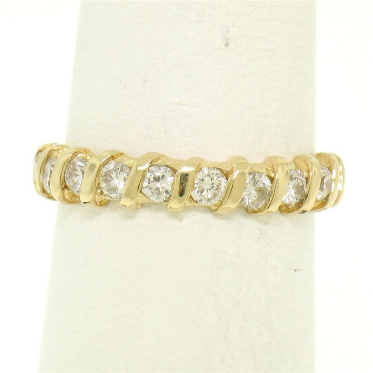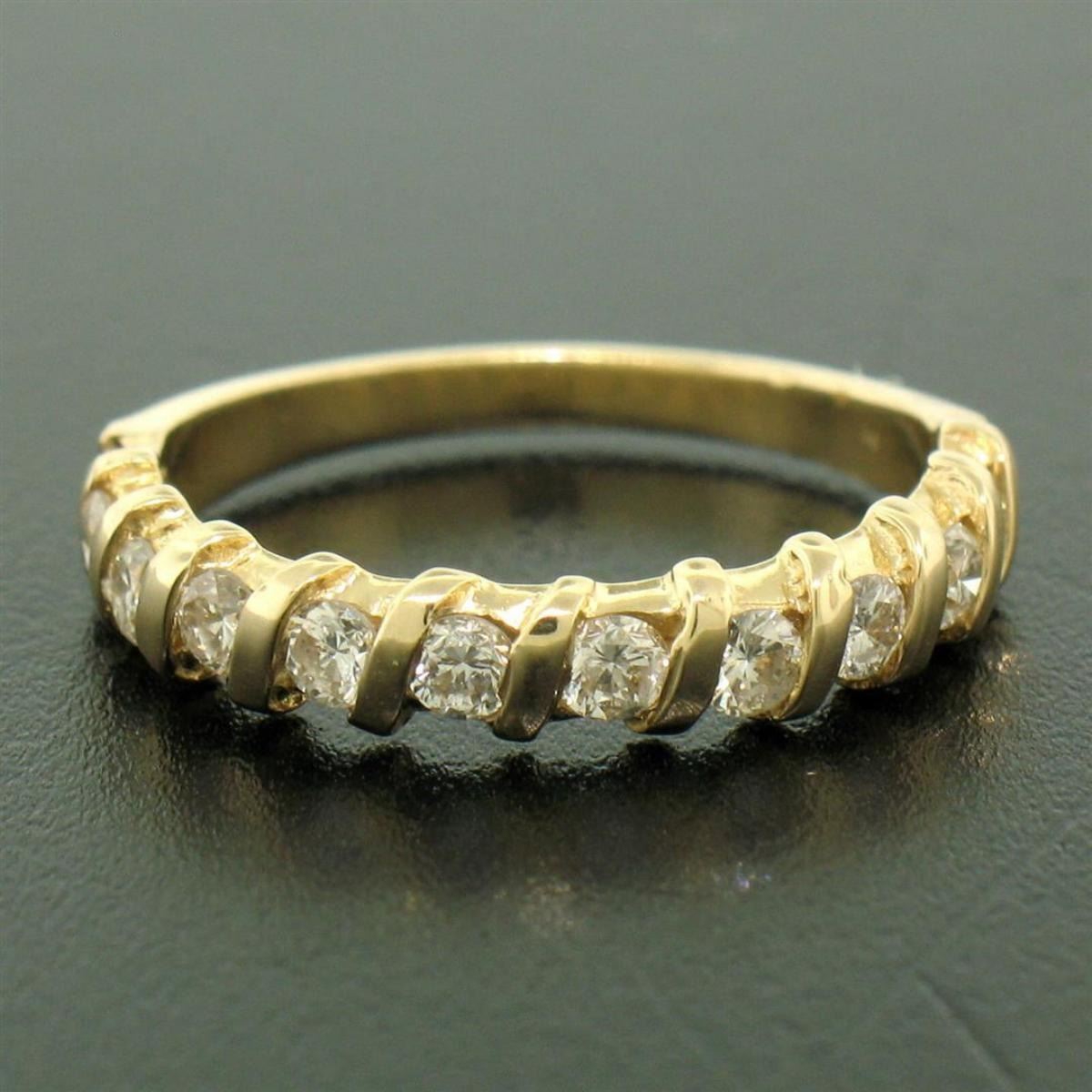 One QUALITY 14k Yellow Gold .60ctw G/H VS2 Bar Set Round Brilliant Diamond Band Ring. Item Details: Material: 14k Solid Yellow Gold, Weight:2.0 Grams, Stone(s): (12) Natural Genuine Diamonds - Round Brilliant Cut - Bar Set - VS2/SI1 Clarity - G/H Color - .60ctw (approx.), Total Carat Weight: 0.60 (approx.), Ring Size: 6.0 (We can custom size this ring.), Ring Width: 3.80mm, Ring Height: 2.03mm rise off the finger, Condition: Like New!