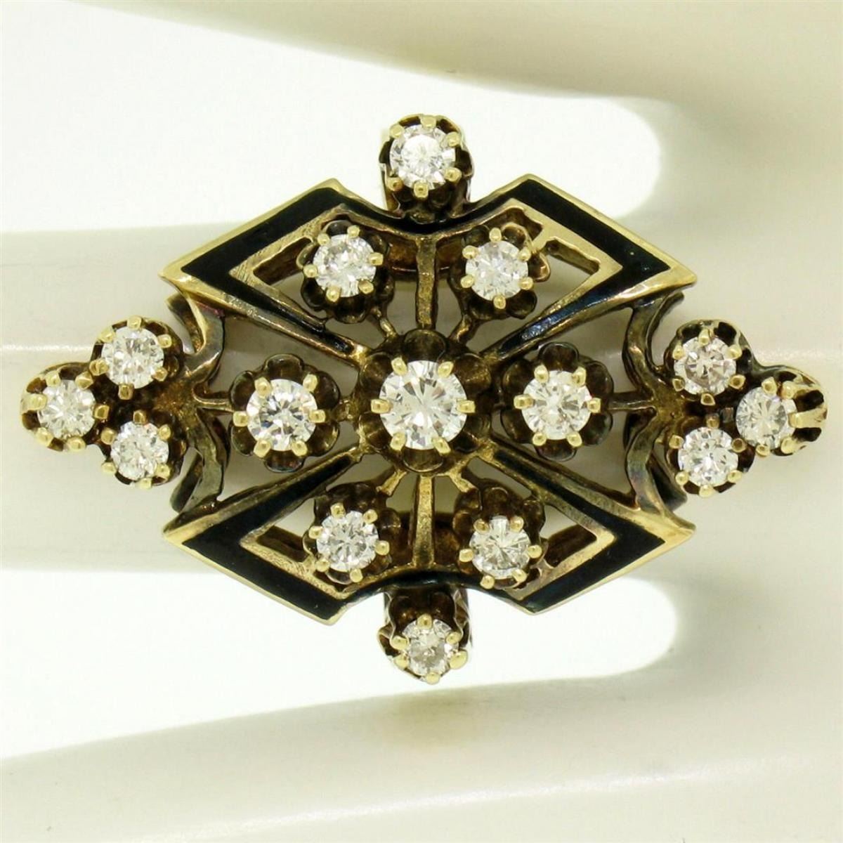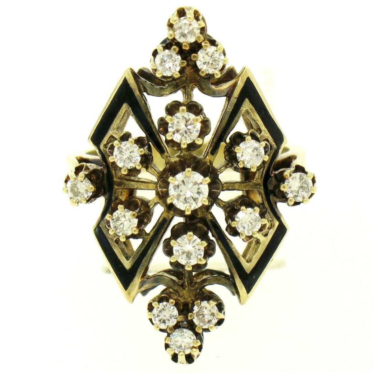 One Vintage Marquise Shaped 14k Yellow Gold .90 ct Diamond Black Enamel Cocktail Ring. Item Details: Material: 14K Solid Yellow Gold, Weight: 9.5 Grams, Stone(s): (15) Natural Genuine Diamonds - Round Brilliant Cut - Prong Set - F/G Color - VS2 Clarity, Total Carat Weight: 0.90 (approx.), Ring Size: 7.0 (We can custom size this ring.), Ring Width: 29.0mm, Ring Height: 7.9mm rise off the finger, Condition: Vintage piece in excellent condition with original patina.