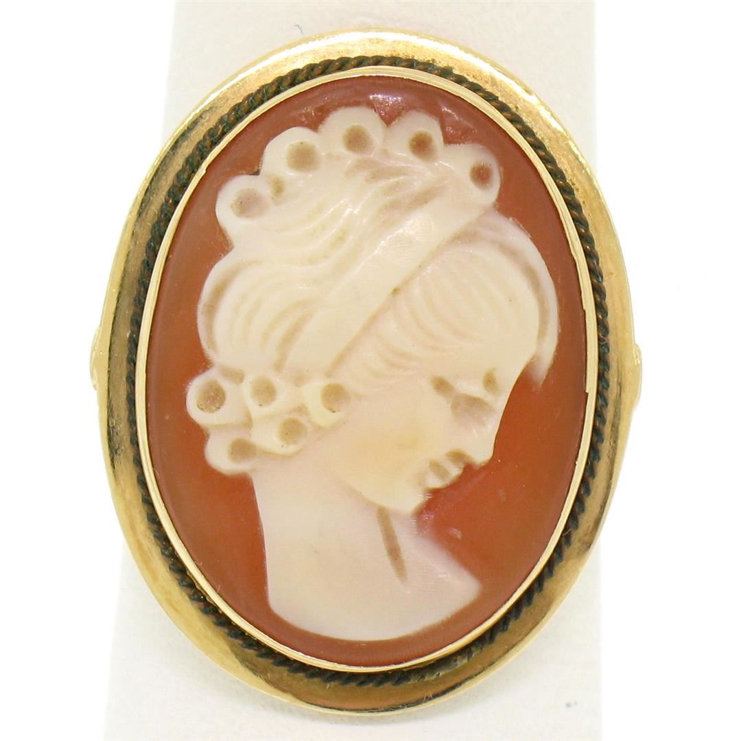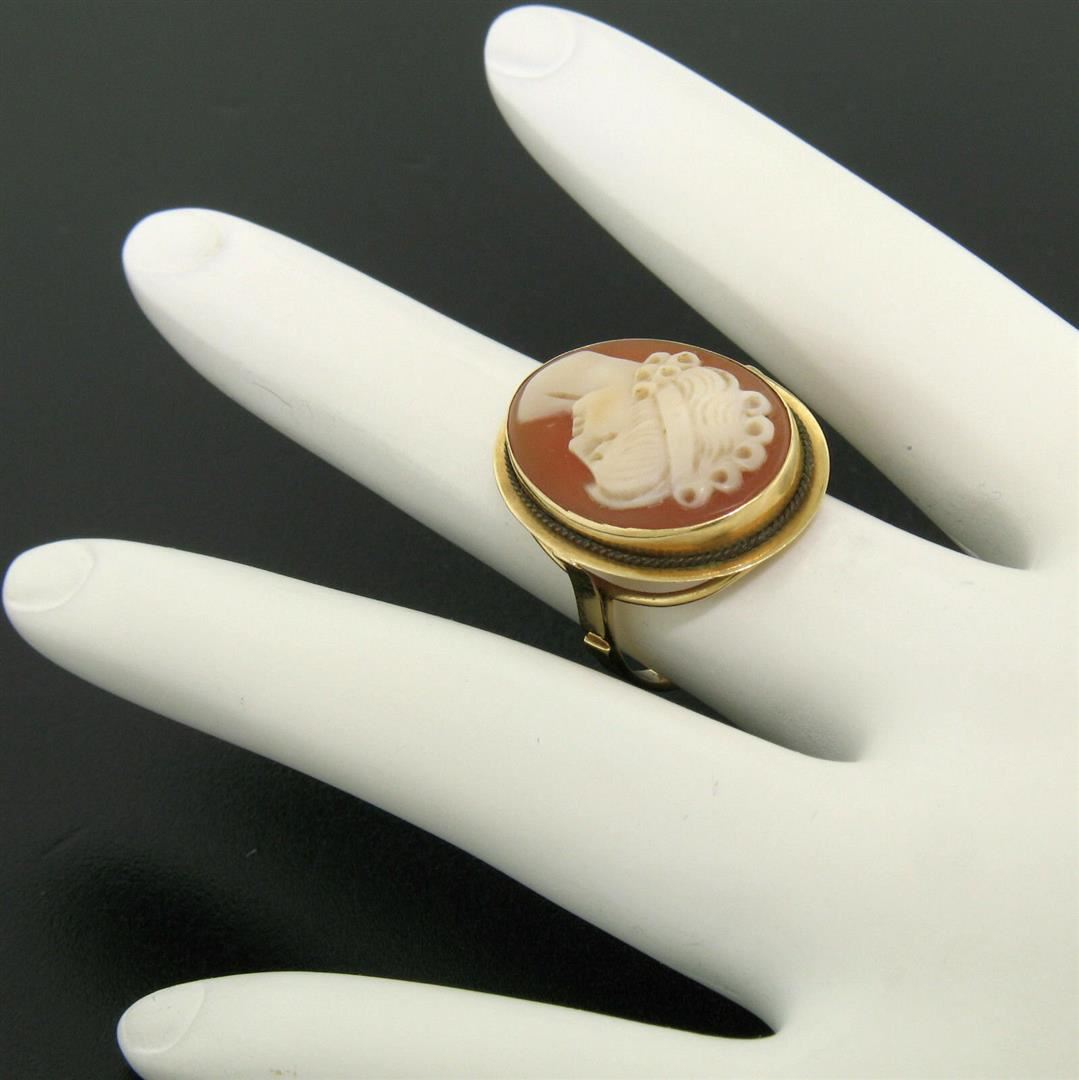 One Vintage 14k Yellow Gold Carved Shell Cameo Ring w/ Twisted Wire Frame Size 5.5. Item Details: Material: 14k Solid Yellow Gold, Weight: 3.3 Grams, Stone(s): (1) Genuine Carved Shell Cameo - Oval Shape - Bezel Set - 14.78x19.48mm, Ring Size: 5.5 (We can custom size this ring.), Ring Width: 22.89mm, Ring Height: 6.10mm rise off the finger, Condition: Vintage piece. Excellent condition!