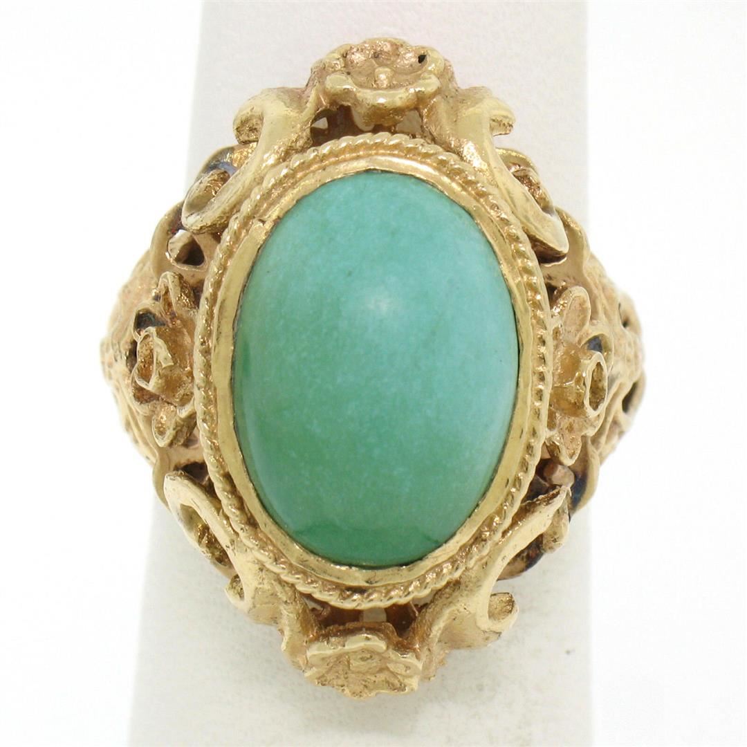 One Vintage 14k Yellow Gold Etched Open Work Bezel Set Oval Cabochon Persian Turquoise Solitaire Ring. Item Details - Material: 14k Solid Yellow Gold, Weight: 8.8 Grams, Stone(s): (1) Natural Genuine Persian Turquoise - Oval Cabochon Cut - Bezel Set - Natural Turquoise Color - 14.0x10.0mm (approx.), Ring Size: 5 (We can custom size this ring.), Ring Width: 24.0mm, Ring Height: 11.9mm rise off the finger, Condition: Vintage piece - Amazing, all original condition!