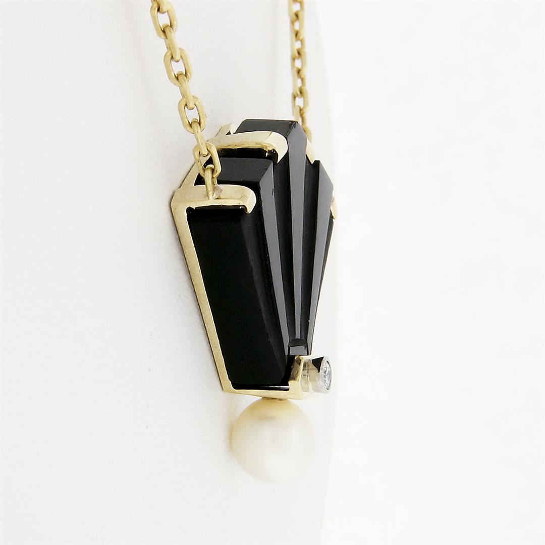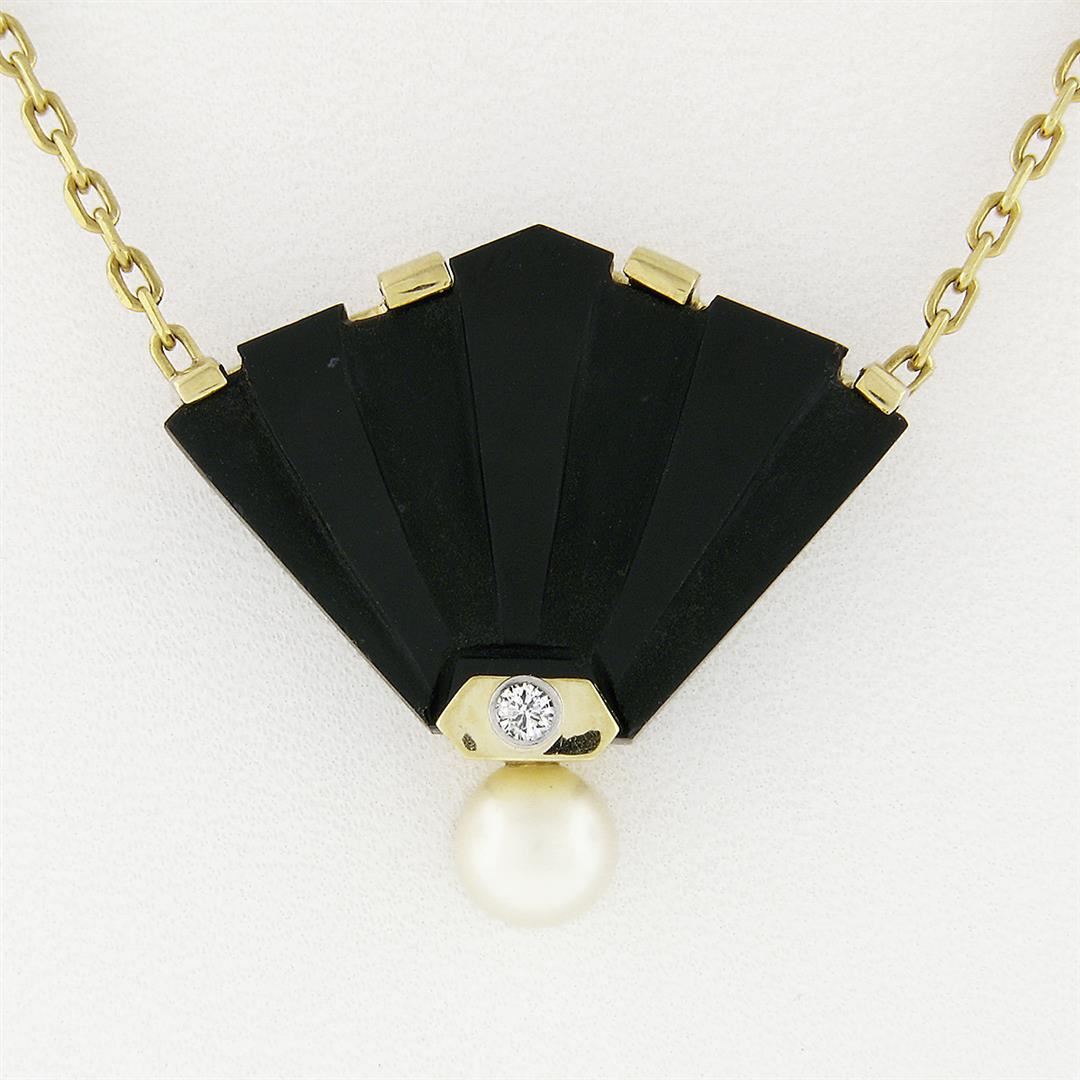 A solid 14k yellow gold fan shape dangle pendant necklace, featuring 1 carved natural black onyx ( 21.5x30.5mm), & 1 round shape natural pearl (6.7mm), with 1 round brilliant cut natural diamond (VS2 ; G - 0.04ctw). 15.25 inch beveled cable link chain, 11.15 grams total weight, pendant measures 28.7x32.4mm.