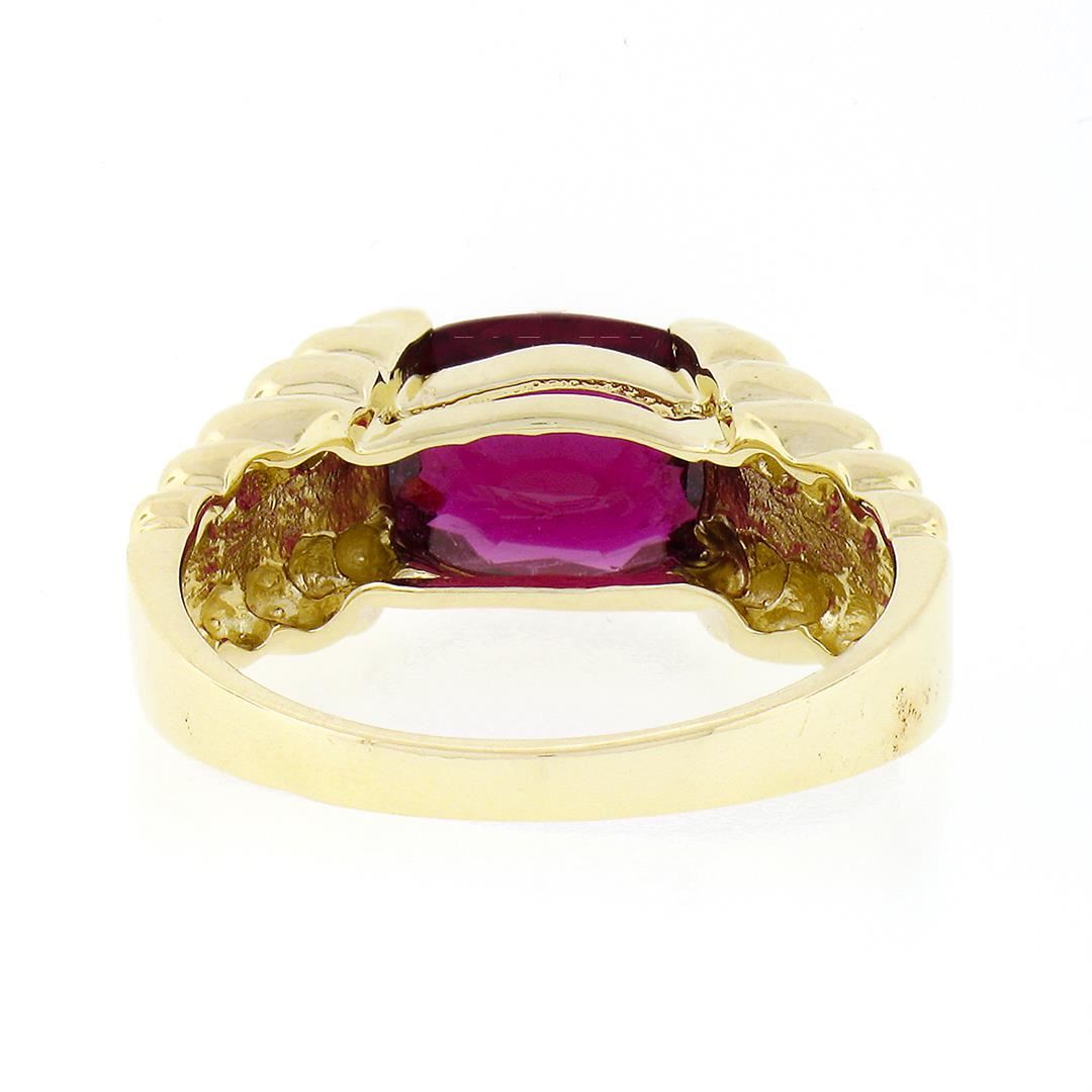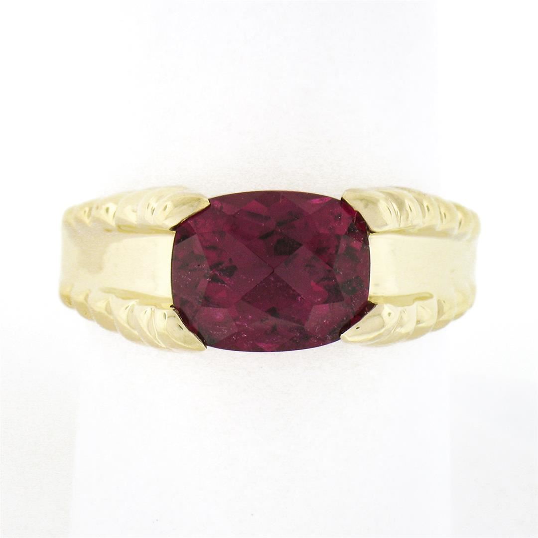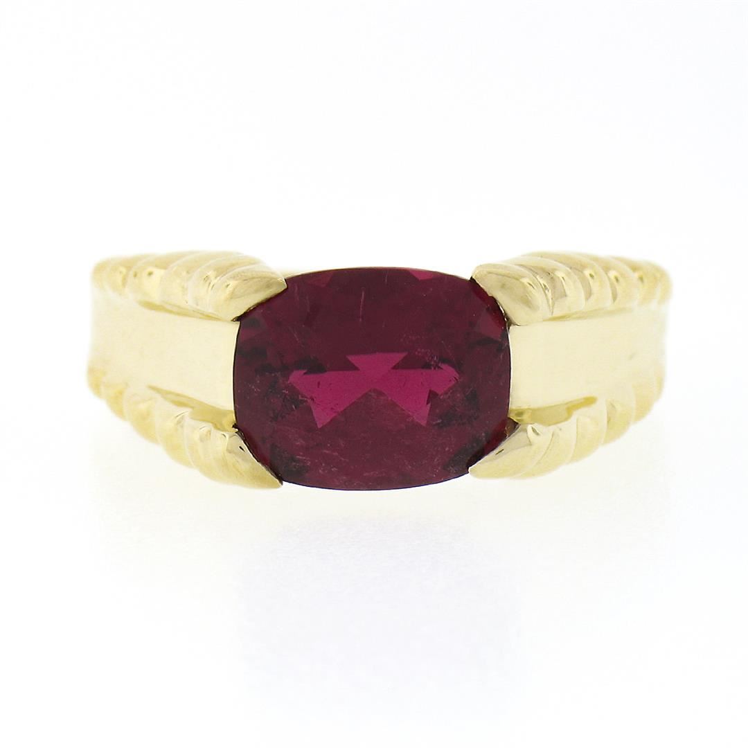 A solid 14k yellow gold solitaire rinf, with 1 Gia certified cushion cut natural tourmaline (3ct). The ring is size 9.0, weighs a total of 5.94 grams, and measures 8.50mm wide. Comes with all original relevant certifications.