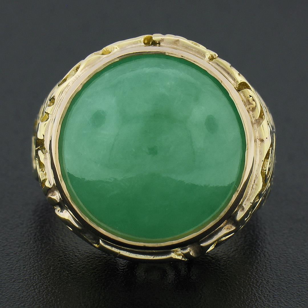 a solid 14k yellow gold open work ring, with 1 round cabochon cut natrual jade (16mm ). The ring is size 9.0, weighs a total of 13.19 grams, and measures 20mm wide.