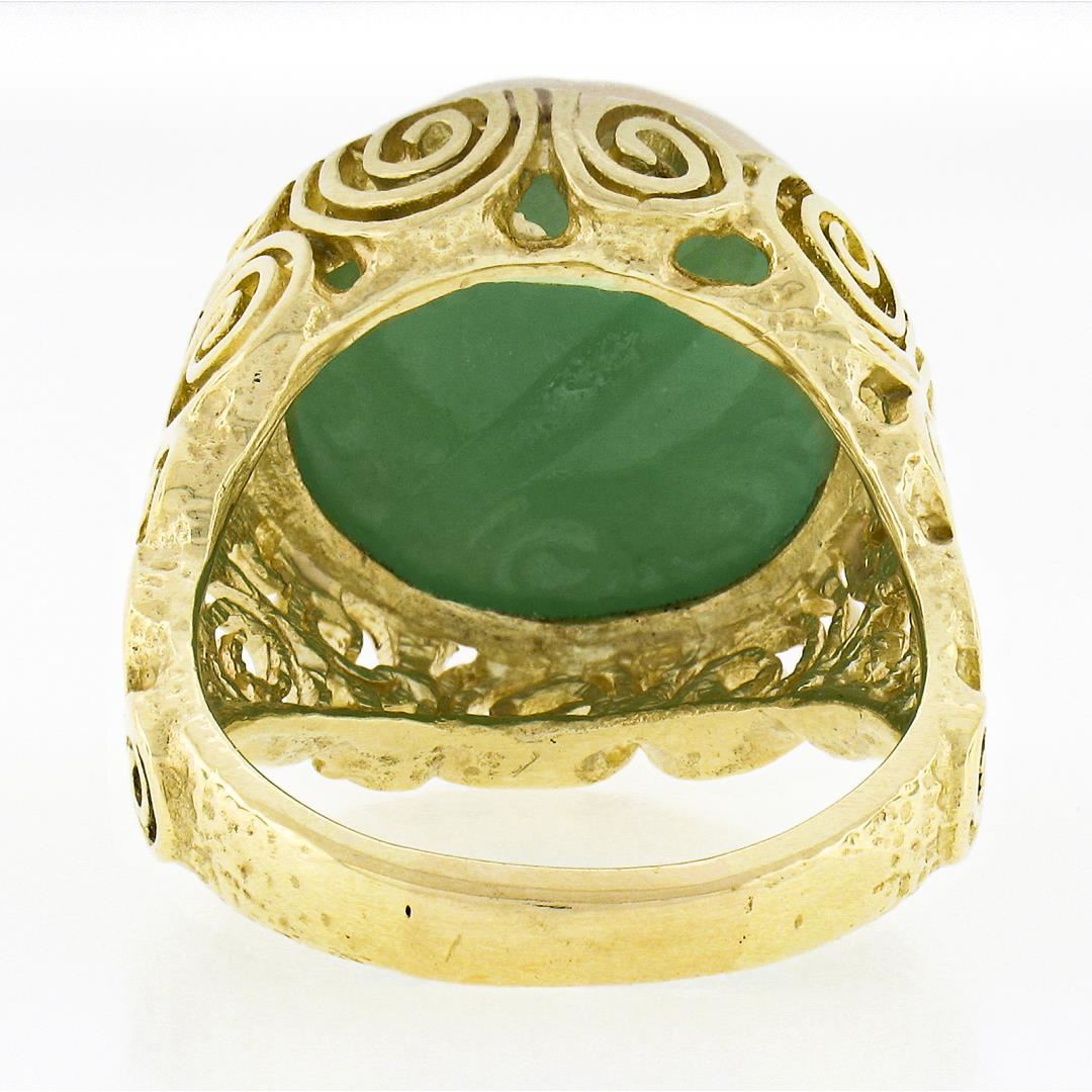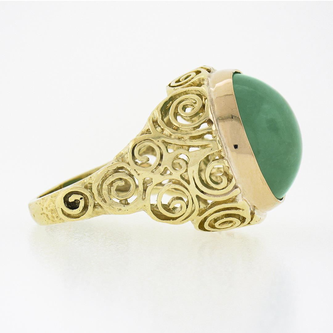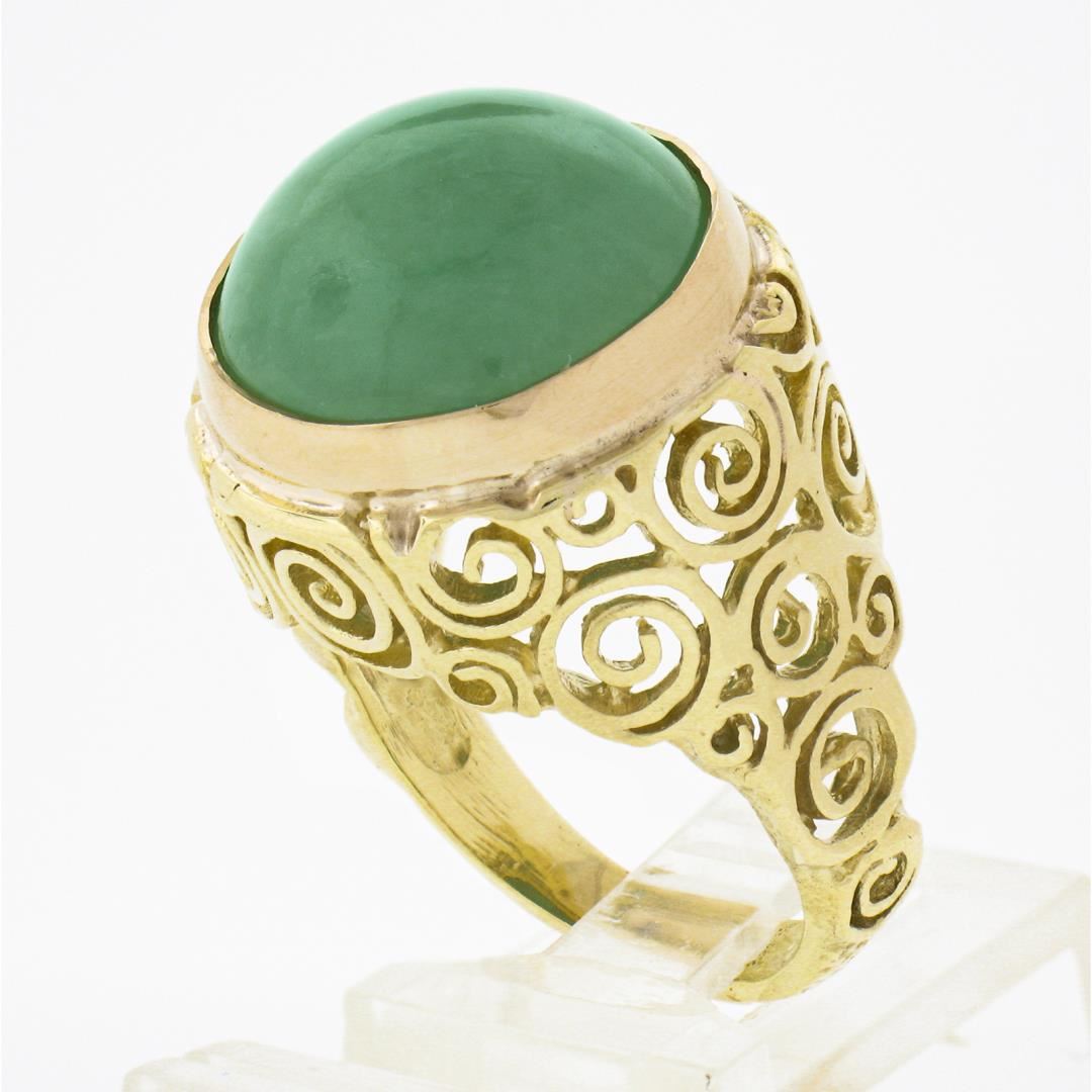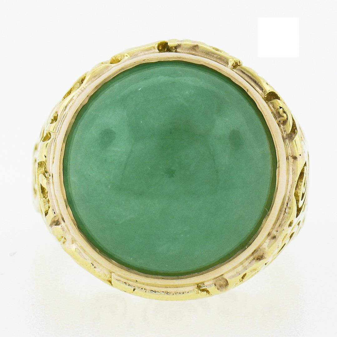 a solid 14k yellow gold open work ring, with 1 round cabochon cut natrual jade (16mm ). The ring is size 9.0, weighs a total of 13.19 grams, and measures 20mm wide.