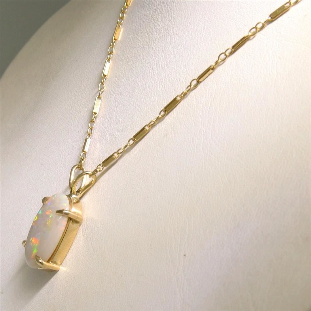An estate solid 14k yellow gold pendant necklace. featuring 1 oval shape natural opal (17x10.5mm). 17.5 inch unique link chain, 5.3 grams total weight, pendant measures 23.90x10.70mm.