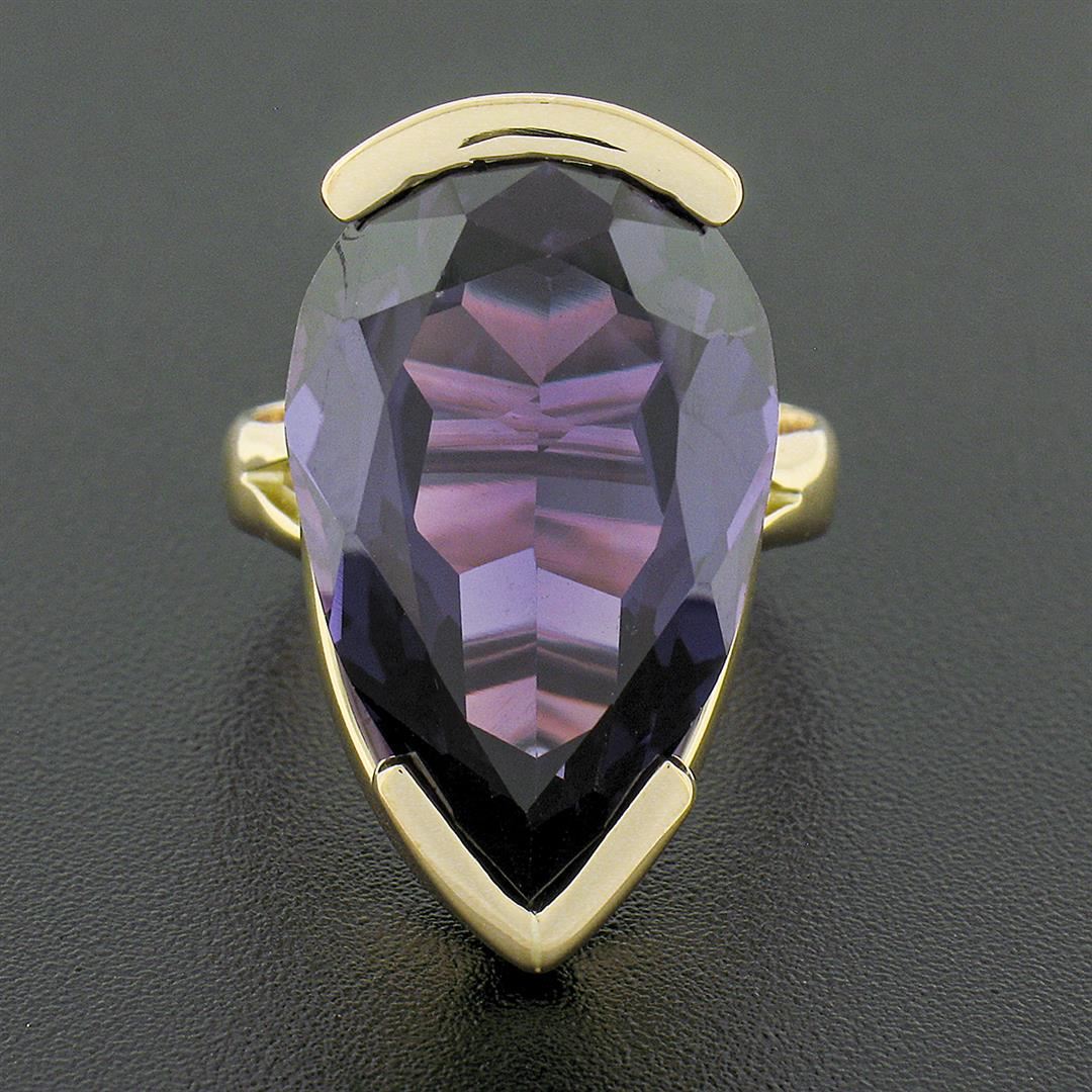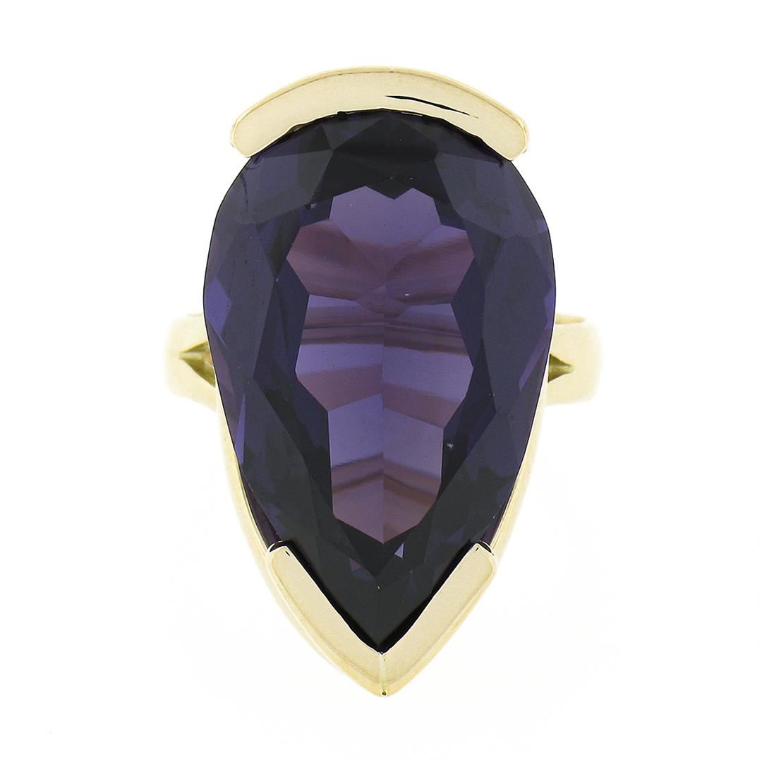 A solid 14k yellow gold cocktail solitaire ring, with 1 pear cut purple stone (21.75x14.35mm). The ring is size 7.0, weighs a total of 9.50 grams, and measures 25.75mm wide.