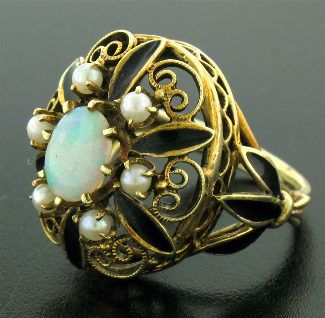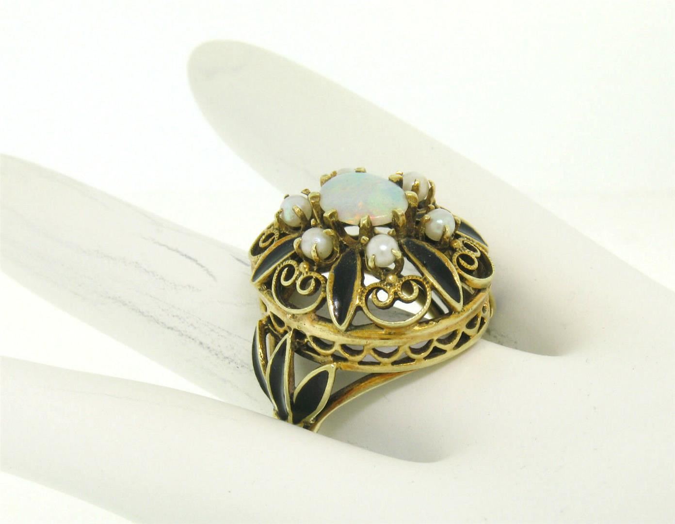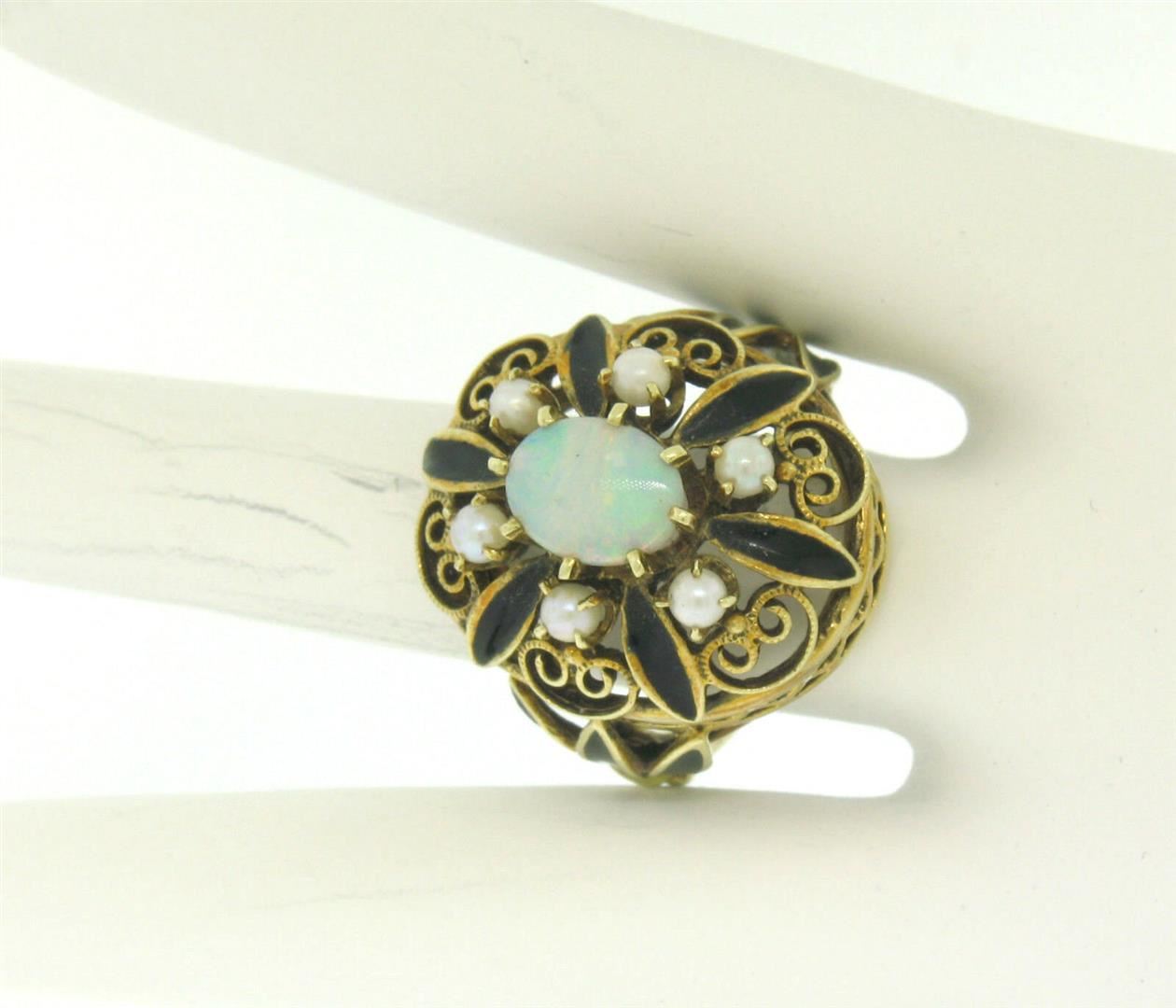One Vintage 14k Yellow Gold Opal Pearl Black Enamel Large Dome Ladies Cocktail Ring. Item Details - Material: Solid 14k Yellow Gold, Weight: 11.0 Grams, Stone(s): (1) Natural Genuine Opal - Oval Cut - Strong Plays of Green and Red Color - 9.40x7.00mm - 1.25ct, (6) Natural Genuine Pearls - Round Shape - Prong Set - White Color - 2.80mm, Enamel - Marquise Shapes - Black Color - 100% Perfect condition, Dimensions: Top of the ring measures 23.4x20.0mm and sits about 13.50mm off the finger., Size: 7.5, Condition: Excellent all original condition with original patina. Perfect enamel and opal has no crazing.