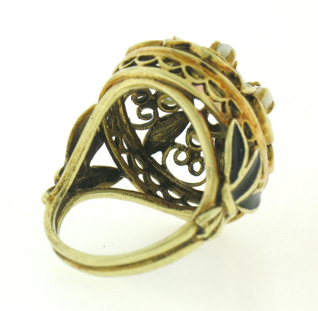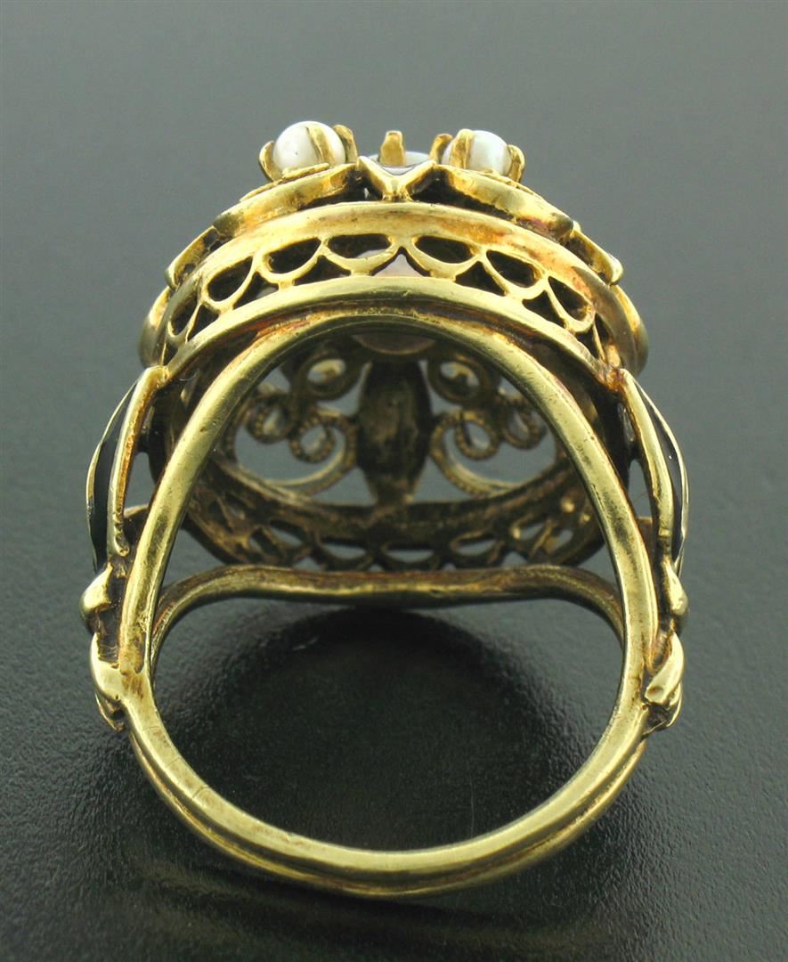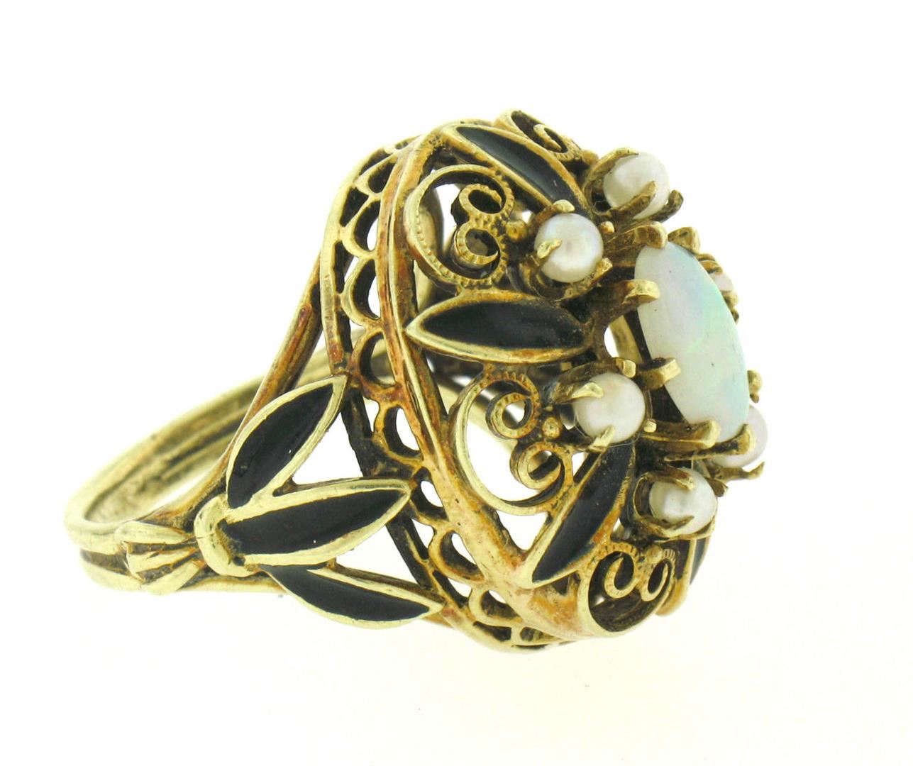 One Vintage 14k Yellow Gold Opal Pearl Black Enamel Large Dome Ladies Cocktail Ring. Item Details - Material: Solid 14k Yellow Gold, Weight: 11.0 Grams, Stone(s): (1) Natural Genuine Opal - Oval Cut - Strong Plays of Green and Red Color - 9.40x7.00mm - 1.25ct, (6) Natural Genuine Pearls - Round Shape - Prong Set - White Color - 2.80mm, Enamel - Marquise Shapes - Black Color - 100% Perfect condition, Dimensions: Top of the ring measures 23.4x20.0mm and sits about 13.50mm off the finger., Size: 7.5, Condition: Excellent all original condition with original patina. Perfect enamel and opal has no crazing.