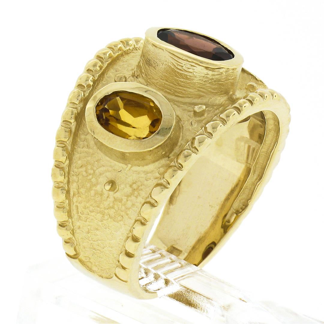 A solid 14k yellow gold band cigar ring. with 1 oval cut natural garnet (6.7x5mm / 1.0ct), and 2 oval cut natural citrines (5.7x4mm / 1.0ctw ). The ring is size 6.5, weighs a total of 7.93 grams, and measures 14mm wide.