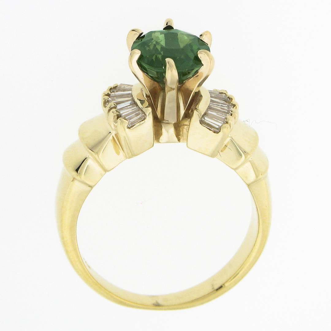 A solid 14k yellow gold ring, with 1 oval cut natural peridot (7.4x6.8mm ), and 14 tapered baguette cut natural diamonds (H/I - VS2/SI2 ; 0.30ctw). The ring is size 4.5, weighs a total of 5.88 grams, and measures 9.4mm wide.